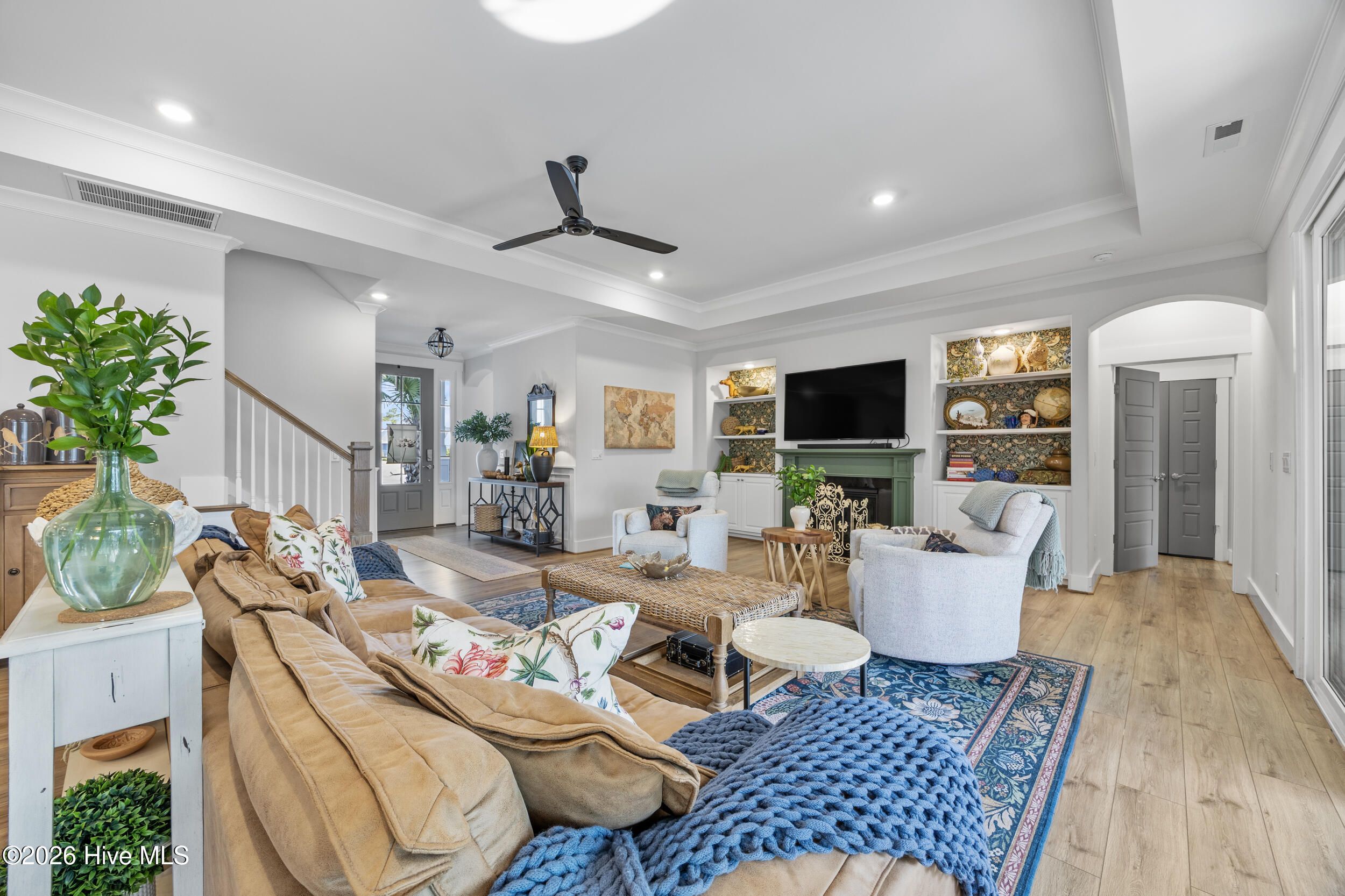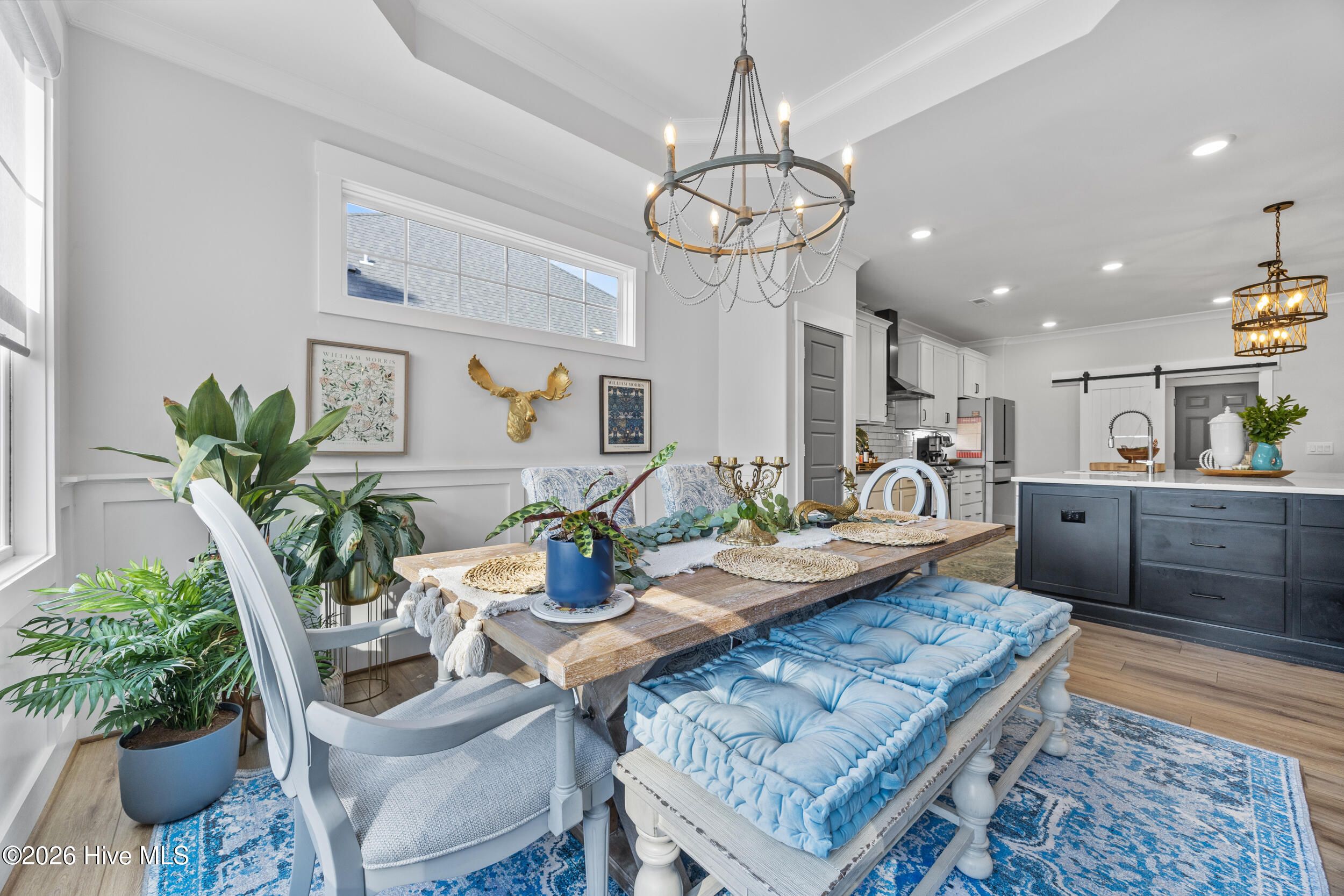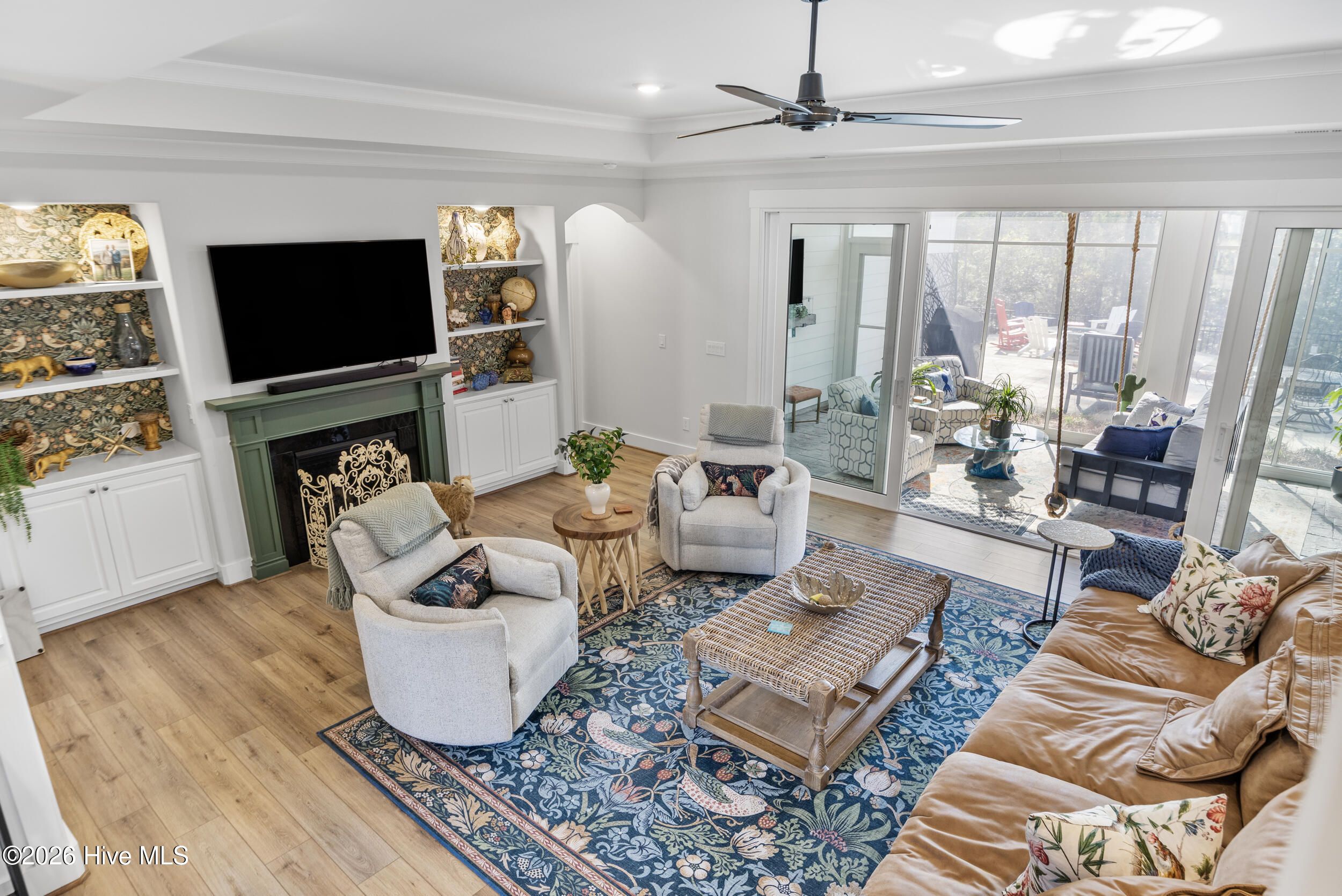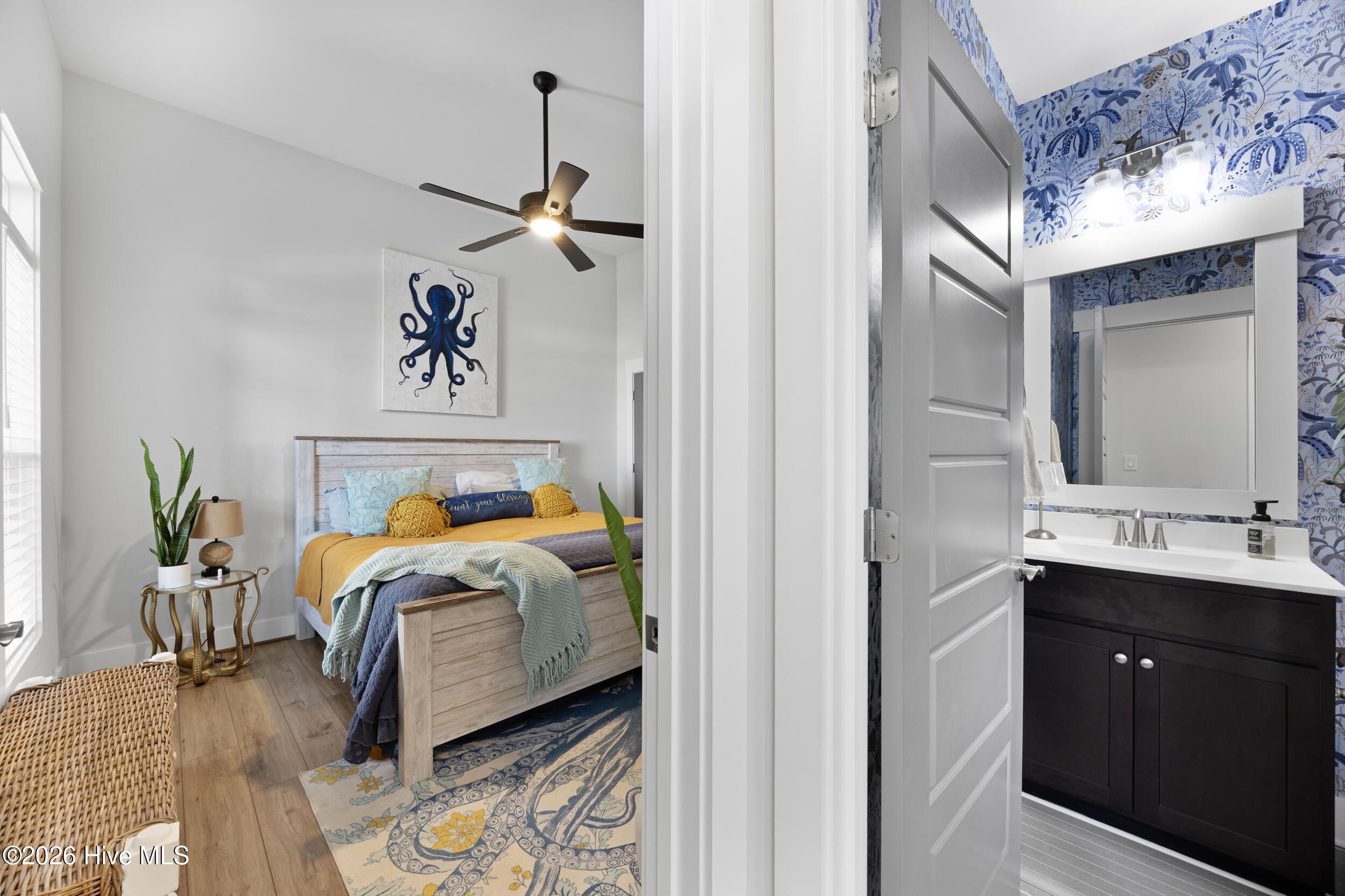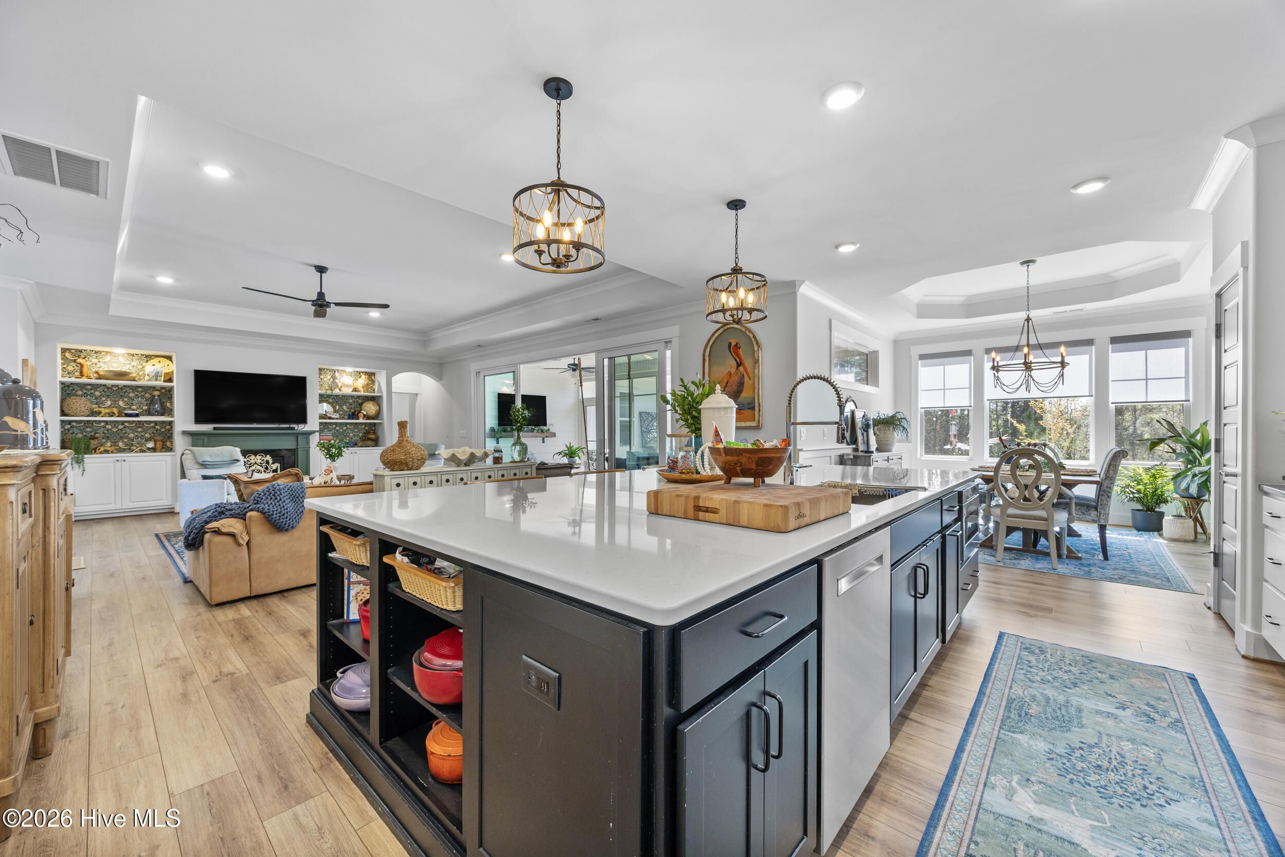 A standout in Egret Cove in Brunswick Forest, this striking white farmhouse with bold black trim offers a refreshing alternative to the typical cookie-cutter home, designed with character and thoughtful detail at every turn. Built in 2021, this nearly 2,500 sq ft residence features 3 bedrooms, 3 full bathrooms, and a spacious bonus room. From the moment you step inside, the foyer sets the tone with elevated finishes and a welcoming layout. A front bedroom with two closets sits just off the entry, with a full bathroom nearby showcasing colorful wallpaper. Throughout the home, you'll find wide plank LVP flooring (perfect for coastal living) paired with design elements like arched doorways, tray ceilings, wainscoting, barn doors, shiplap accents, and eye-catching wallpaper that add warmth and personality. The main living area is open and inviting, ideal for both everyday living and entertaining. The kitchen is a true centerpiece, featuring an expansive island with seating, built-in cabinetry and shelving, a microwave drawer, subway tile backsplash, and high-end appliances including a gas cooktop with vent hood. The adjoining living room offers a cozy gas log fireplace flanked by custom built-ins, accented with stylish wallpaper and lighting. Seamlessly extending the living space, a four-panel sliding glass door opens to a screened-in porch with EZ Breeze panels, creating the perfect year-round retreat. Whether you're relaxing on the daybed swing or catching a game, this space is made for unwinding. The primary suite is a serene escape with a shiplap accent wall, dual walk-in closets, and a spacious ensuite featuring dual vanities and a zero-entry walk-in shower. Upstairs, you'll find an additional bedroom, full bathroom, and a large bonus room that easily functions as a fourth bedroom, media room, or home office. Out back, the yard is ready for entertaining with a generous patio, fire pit area, and even a private putting green--bringing a touch of resort living right to your backyard. Additional highlights include a functional mudroom off the garage and a floored walk-in attic for ample storage. Located in the Egret Cove section of Brunswick Forest, this home offers access to one of the area's most amenity-rich communities. Residents enjoy multiple outdoor pools, an indoor pool, fitness centers, miles of walking and biking trails, tennis and pickleball courts, parks, and a full calendar of social events. The community also features convenient on-site shopping, dining, and medical offices, along with the renowned Cape Fear National Golf Course. Just minutes from downtown Wilmington, area beaches, and I-40, this home truly offers the best of coastal living.