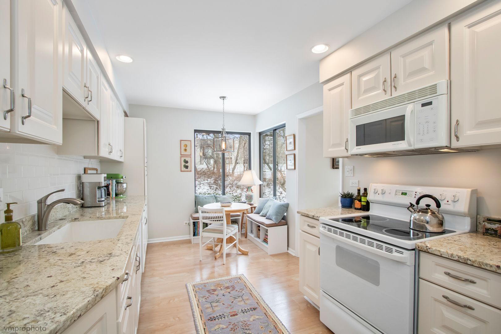 Treetop views and golf course peeks! This immaculate and updated upper level Braeburn model is in tip top condition. This home has a private entrance & garage with an extra parking space too. The bright upper level location allows for volume ceilings and sun-drenched rooms. A cozy fireplace is perfect for snuggling by to read or watch TV in the large Living Room and the sliding glass door accesses the spacious deck for quiet enjoyment of nature. The spacious Dining Room can accommodate your finest of dinner gatherings. An updated cheery Kitchen has beautiful raised panel cabinetry, stunning granite counters, farm sink and a charming nook for your breakfast table. Cooking is effortless in this beautiful Kitchen. The Primary Bedroom is extremely generous in size, has a large walk in closet and an updated bathroom with elevated vanity. The charming guest bedroom has great window lines, ample closet space and is neutral and bright in decor and the hall bathroom has a tiled walk-in shower. This beautiful home has been updated throughout and has a very neutral palate with nothing to do but move in. A wonderful location within LBS offers a combination of private wooded views & golf course just beyond. Enjoy all that Lake Barrington Shores has to offer, indoor/outdoor pools, hot tub, pickleball, lake, beach, fishing, kayaking, tennis, health club and a guarded, gated community. It's all at your fingertips! Many updates from 2019-2025 include: HVAC, H20 Heater, toilets, faucets, shower fixtures, water softener, dishwasher, disposal, washer, dryer, refrigerator, window screens & more.