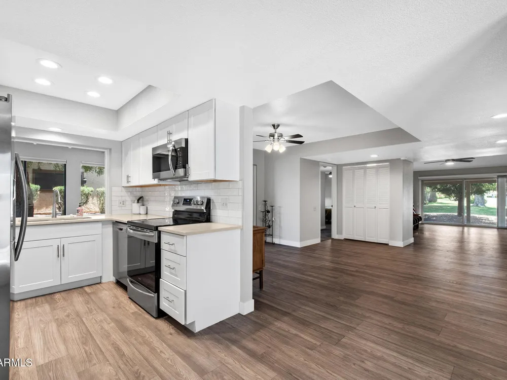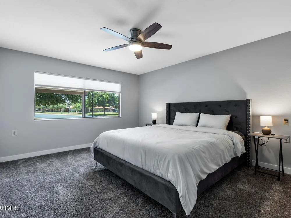 Beautifully remodeled and move - in ready! This stunning home features two spacious primary suites, each with fully updated bathrooms showcasing new quartz vanities, new toilets, and tiled walk - in showers. Throughout the home, you'll find new flooring, modern ceiling fans, and stylish new blinds. The kitchen has been completely transformed with sleek quartz countertops, new stainless steel appliances, recessed lighting, French doors that open to the inviting private front patio - perfect for enjoying your morning coffee. Additional updates include new recessed lighting in kitchen, entryway and hallway, as well as a newer HVAC system replaced in 2019, ensuring comfort and efficiency. This home is located in the highly desirable 55+ resort style community of Leisure World!