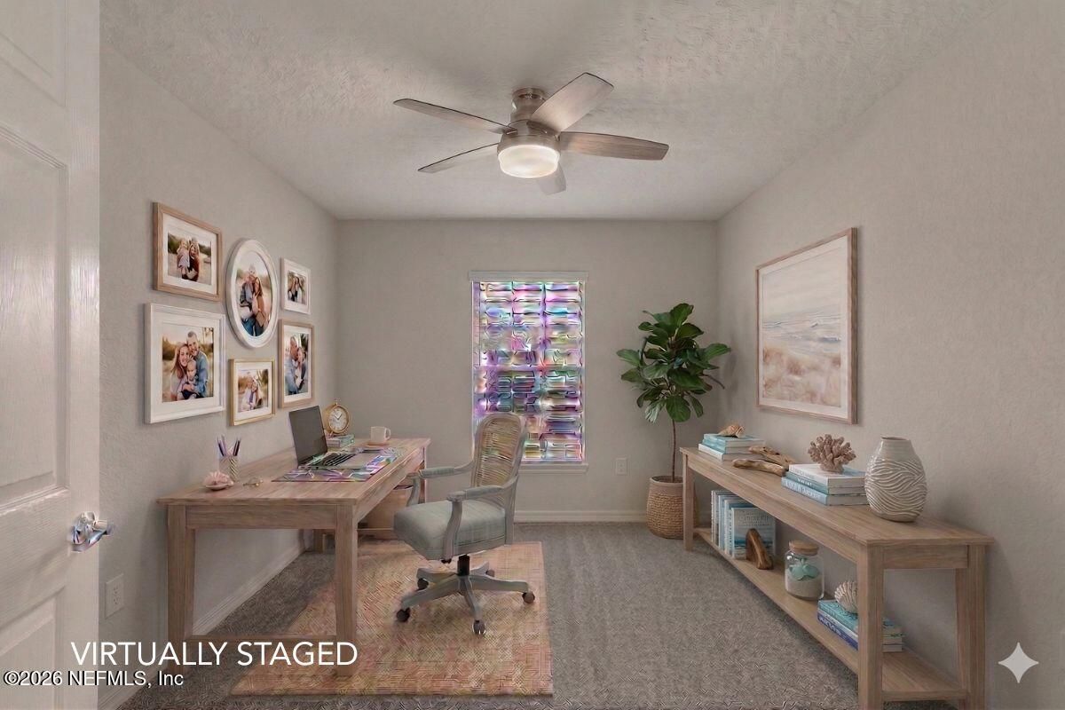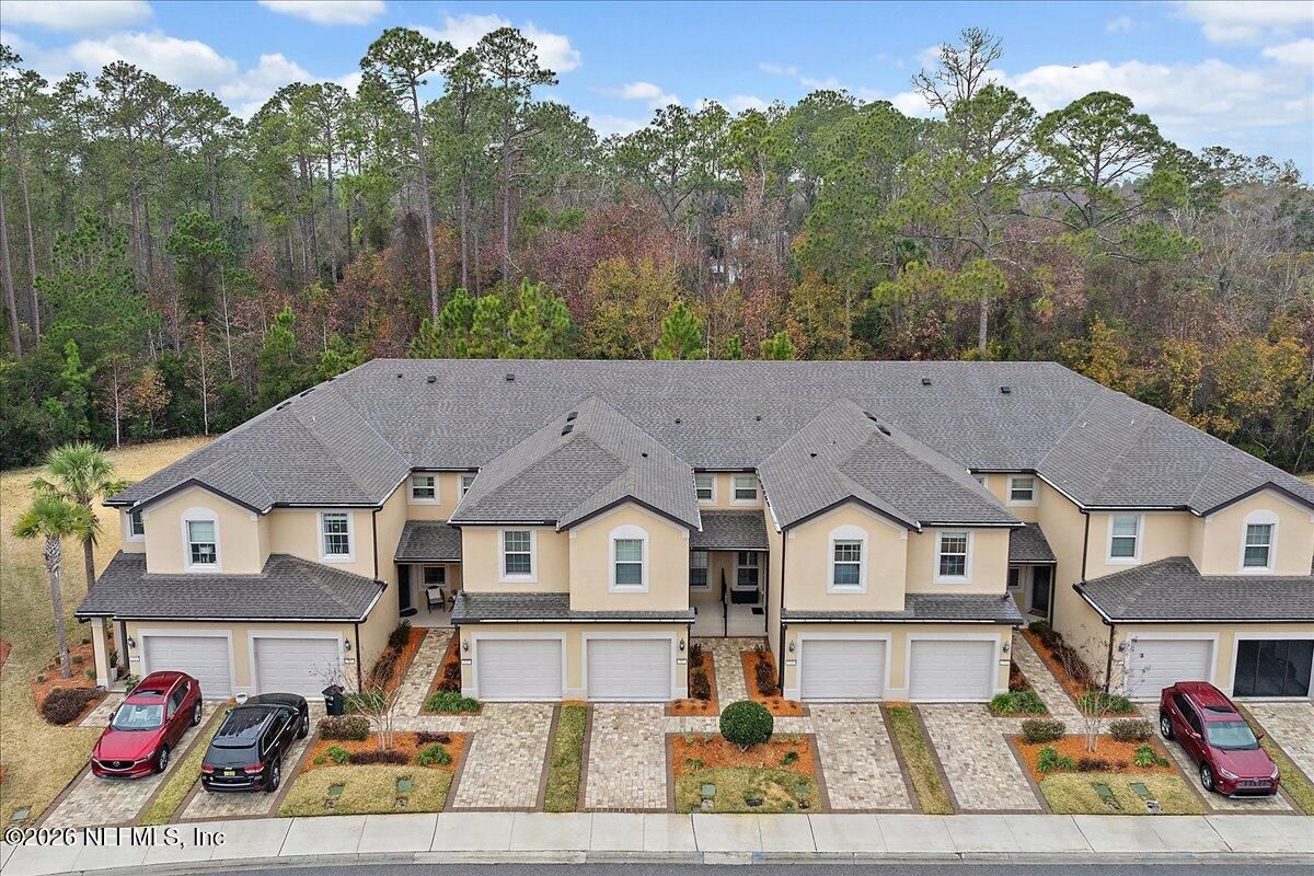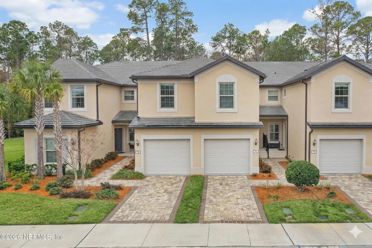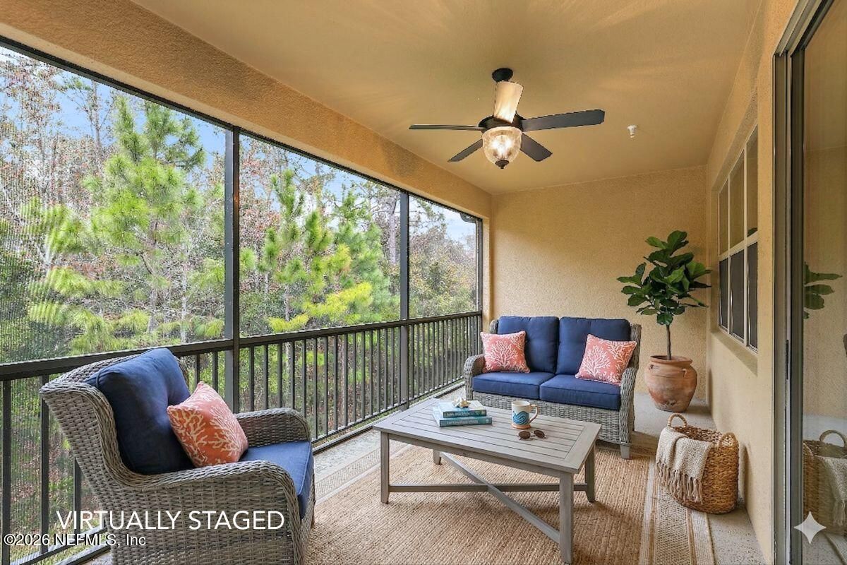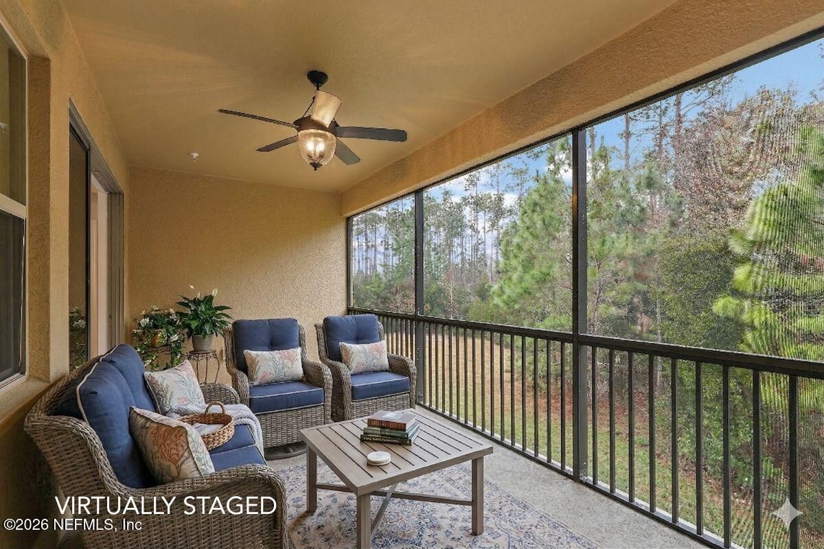 Welcome to effortless living in Del Webb Ponte Vedra, a centrally located 55+ community just 15 minutes to the beach. This upgraded second-floor condo offers 1,873 sq. ft., a private 1-car garage, and peaceful premium preserve views. Vaulted ceilings and abundant natural light create an airy feel. High-end wood-look tile enhances the open living space, while the kitchen features ceiling-height cabinetry and quartz countertops. Enjoy the extended screened lanai (approx. 10x20 ft) with northwest exposure overlooking the preserve. The spacious primary suite includes an upgraded bath and oversized closet. A secondary bedroom w/ bath and an office with French doors offers ideal guest or workspace flexibility. Concrete block construction, whole-unit water filtration, reverse osmosis, an additional half bath, and a generous laundry room add convenience. Resort-style amenities include indoor and outdoor pools, fitness center, coffee shop, trails, pickleball, tennis, and... a vibrant social calendar with a new Discovery Center (soon to be completed), simulated Golf center, and state-of-the-art yoga studio.