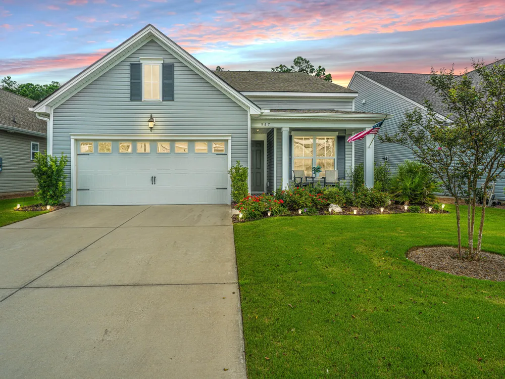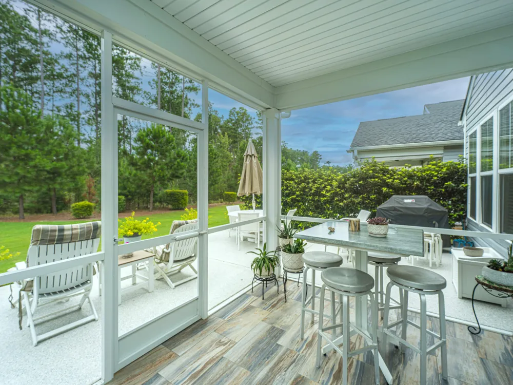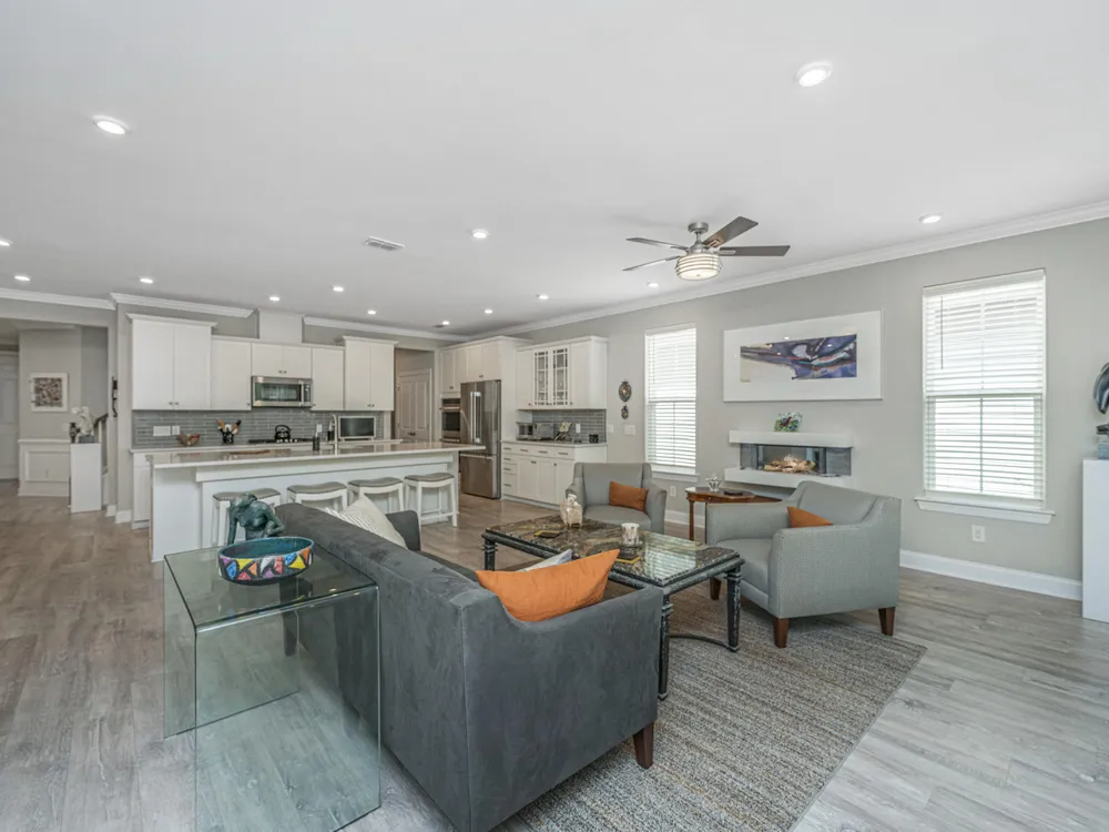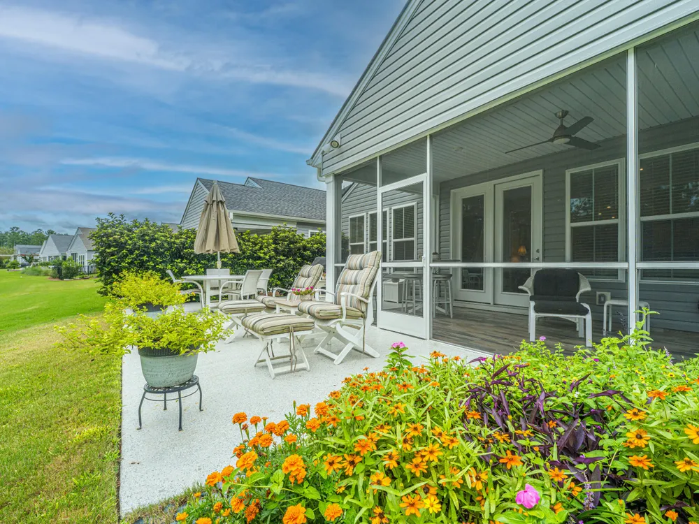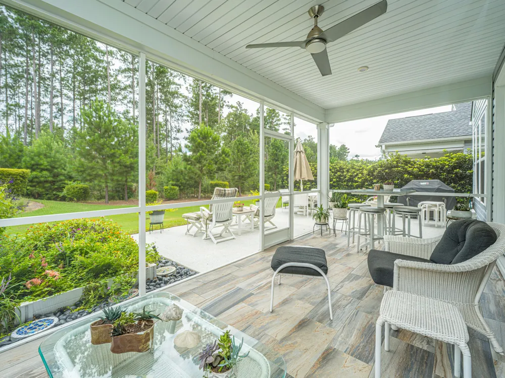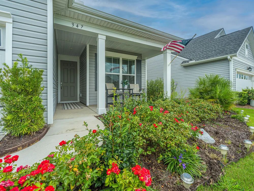 Welcome to 347 Seaside Trail, an exquisite 3 bedroom + office/ den, 3-bath home, beautifully nestled in the highly sought-after 55+ gated community of Four Seasons at Cane Bay Plantation. Situated on a premium private lot with no backyard neighbors, this 2,768 sq ft residence offers refined traditional style with a cozy cottage feel and upscale finishes throughout. From the inviting covered front porch, meticulous landscaping, to the beautiful trim work throughout and light-colored LVP floors that greet you in the foyer, every detail has been thoughtfully designed. The open-concept floor plan seamlessly connects the stunning chef's kitchen, dining area, and family room which creates a perfect space for entertaining...Enjoy Quartz countertops, beautiful back splash, GE Café 5-burner gas cooktop, double ovens, stainless appliances, staggered gourmet cabinetry with molding, full pantry, and a large island with seating. The family room offers a custom, sleek wall mounted fireplace, and flows right into the dining area which offers multiple windows bringing in an abundance of natural lighting. The main-level primary suite features a tray ceiling, triple windows for abundant light, a custom walk-in closet, and a luxurious ensuite with tile flooring, a floor-to-ceiling tiled walk-in shower, vanity with dual sinks, and private water closet. An additional bedroom w/ built-in bookcase with a pull-out Murphy desk, an office/den, and a full bathroom are also located on the main level. Upstairs is a spacious loft featuring LVP flooring, an additional bedroom, and a third full bathroom, which offers the perfect space for guests, hobbies, or relaxation. Step outside to a gorgeous screened-in porch with tile flooring and ceiling fan, a custom-coated patio, tall privacy bushes, and lush landscaping, which backs to woods, and enjoy your private retreat. Enjoy resort-style living in Four Seasons with amenities like a lakeside clubhouse, fitness center, tennis, pickleball, indoor/outdoor pools, kayaking, walking trails, and a 300-acre lake system. This isn't just a home, it's a lifestyle! Schedule your private showing today and discover why so many love calling Four Seasons home