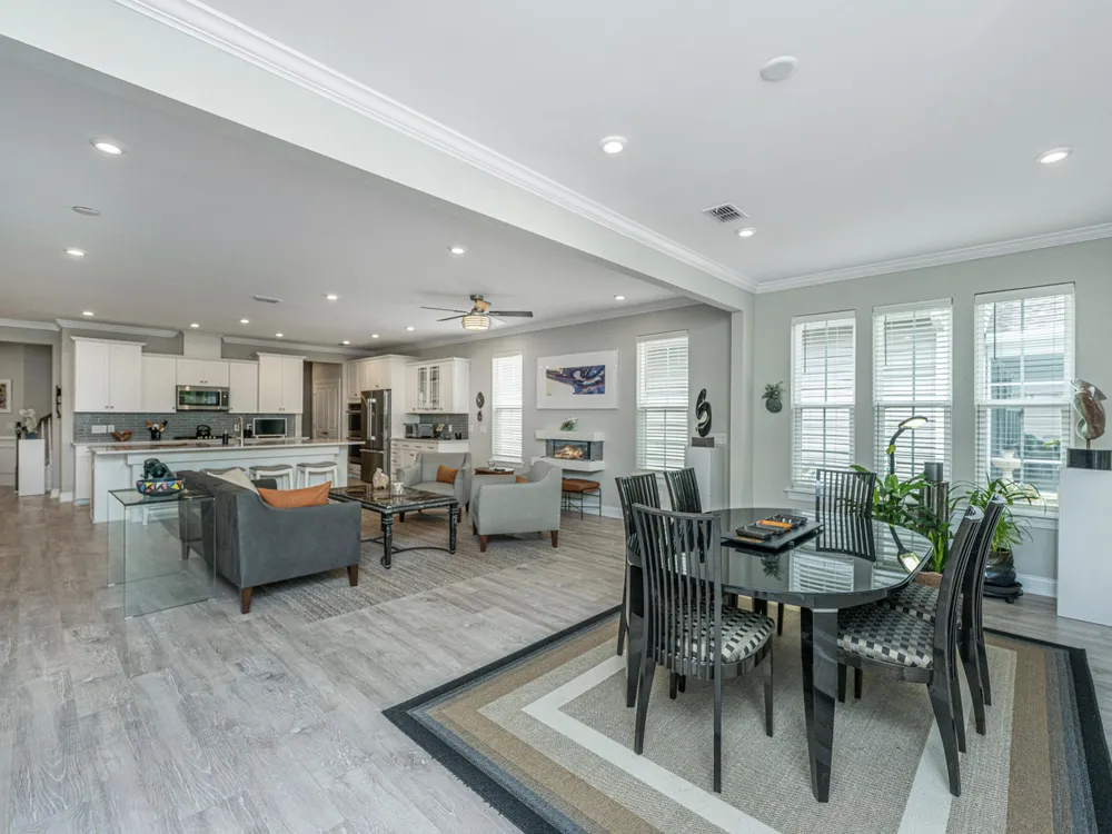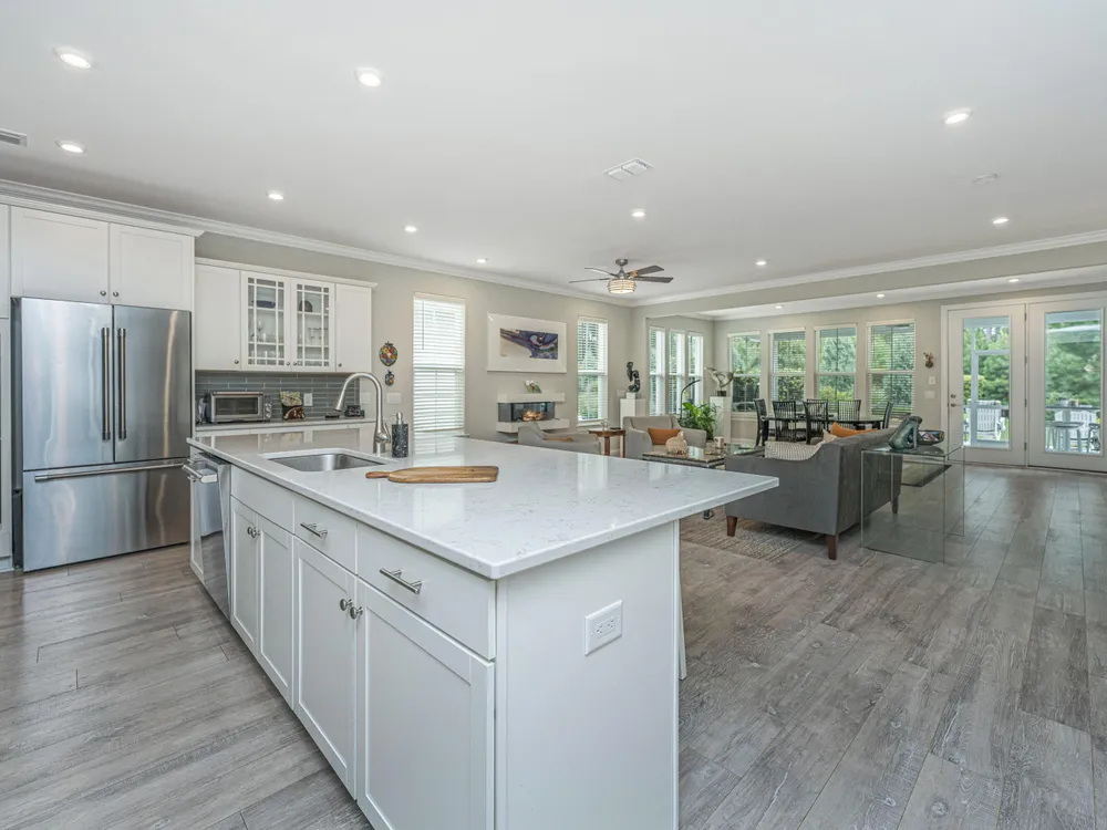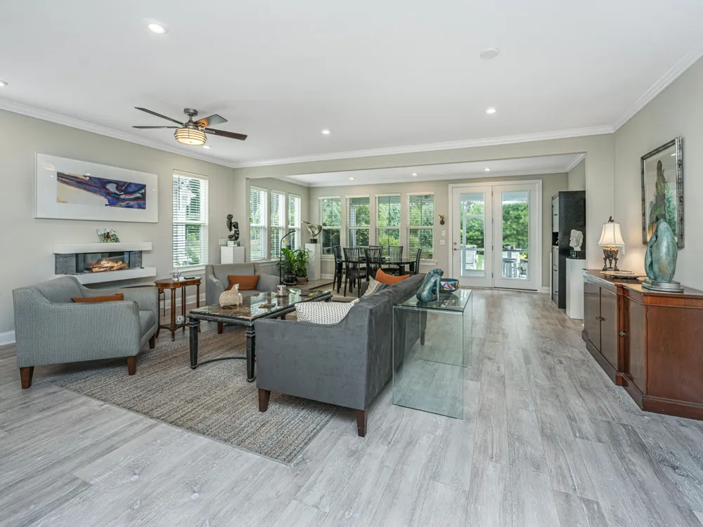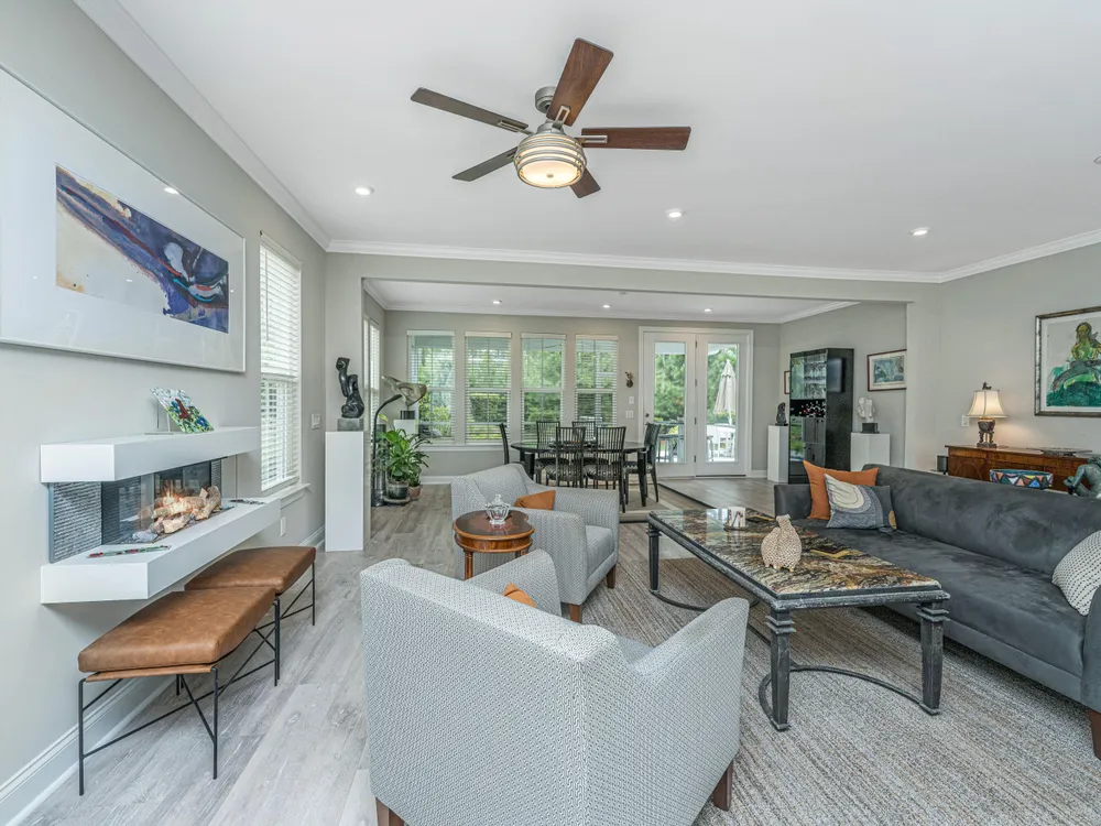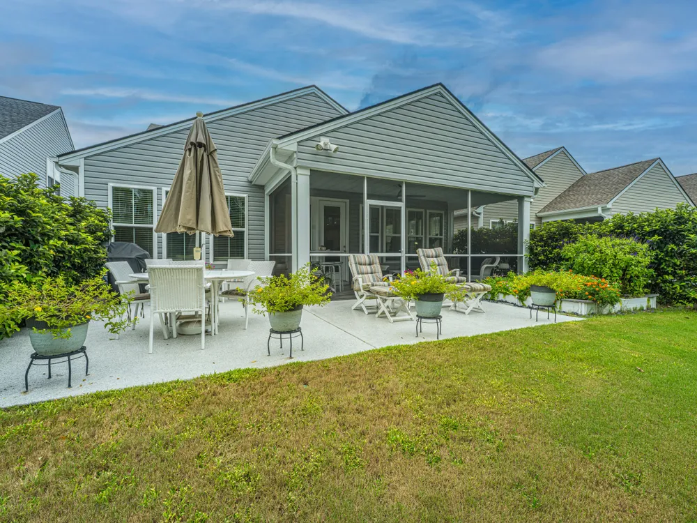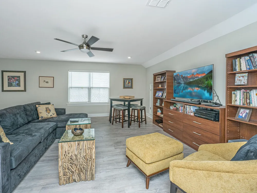 Welcome to 347 Seaside Trail, an exquisite 3 bedroom + office/ den, 3-bath home, beautifully nestled in the highly sought-after 55+ gated community of Four Seasons at Cane Bay Plantation. Situated on a premium private lot with no backyard neighbors, this 2,768 sq ft residence offers refined traditional style with a cozy cottage feel and upscale finishes throughout. From the inviting covered front porch, meticulous landscaping, to the beautiful trim work throughout and light-colored LVP floors that greet you in the foyer, every detail has been thoughtfully designed. The open-concept floor plan seamlessly connects the stunning chef's kitchen, dining area, and family room which creates a perfect space for entertaining...Enjoy Quartz countertops, beautiful back splash, GE Café 5-burner gas cooktop, double ovens, stainless appliances, staggered gourmet cabinetry with molding, full pantry, and a large island with seating. The family room offers a custom, sleek wall mounted fireplace, and flows right into the dining area which offers multiple windows bringing in an abundance of natural lighting. The main-level primary suite features a tray ceiling, triple windows for abundant light, a custom walk-in closet, and a luxurious ensuite with tile flooring, a floor-to-ceiling tiled walk-in shower, vanity with dual sinks, and private water closet. An additional bedroom w/ built-in bookcase with a pull-out Murphy desk, an office/den, and a full bathroom are also located on the main level. Upstairs is a spacious loft featuring LVP flooring, an additional bedroom, and a third full bathroom, which offers the perfect space for guests, hobbies, or relaxation. Step outside to a gorgeous screened-in porch with tile flooring and ceiling fan, a custom-coated patio, tall privacy bushes, and lush landscaping, which backs to woods, and enjoy your private retreat. Enjoy resort-style living in Four Seasons with amenities like a lakeside clubhouse, fitness center, tennis, pickleball, indoor/outdoor pools, kayaking, walking trails, and a 300-acre lake system. This isn't just a home, it's a lifestyle! Schedule your private showing today and discover why so many love calling Four Seasons home