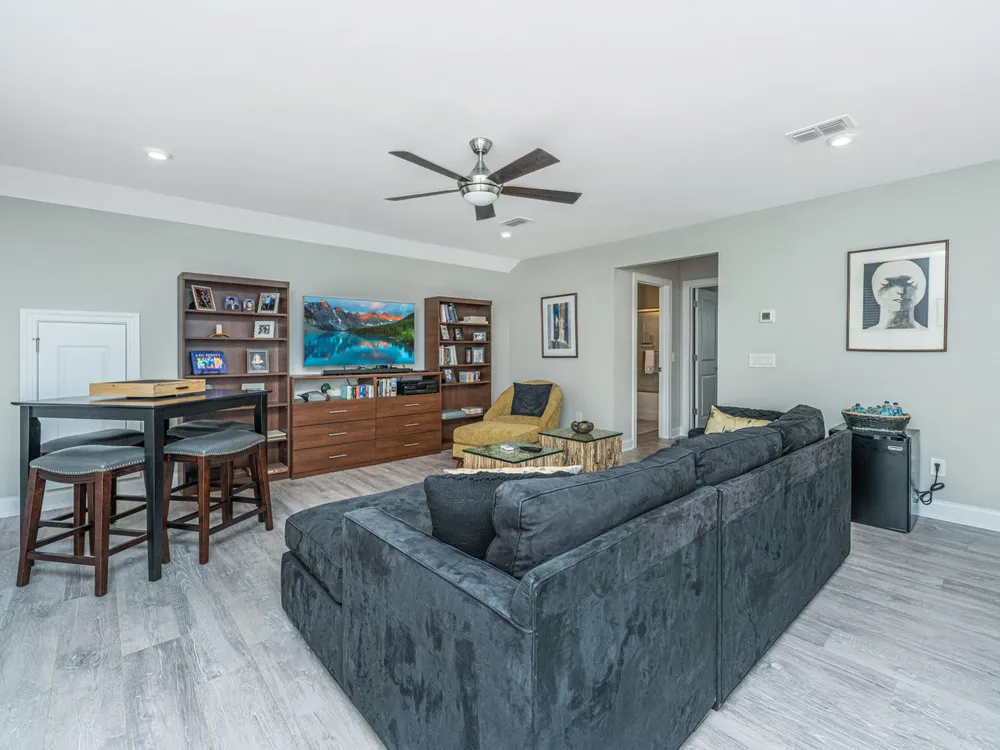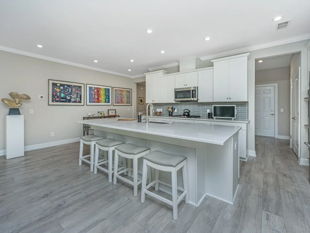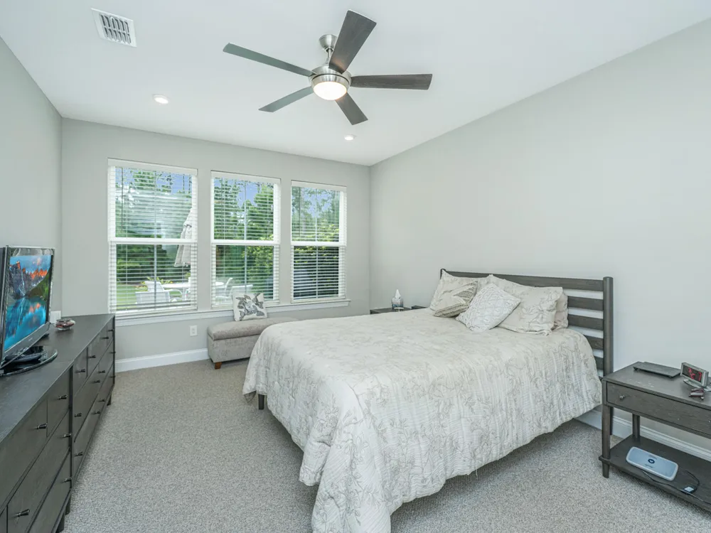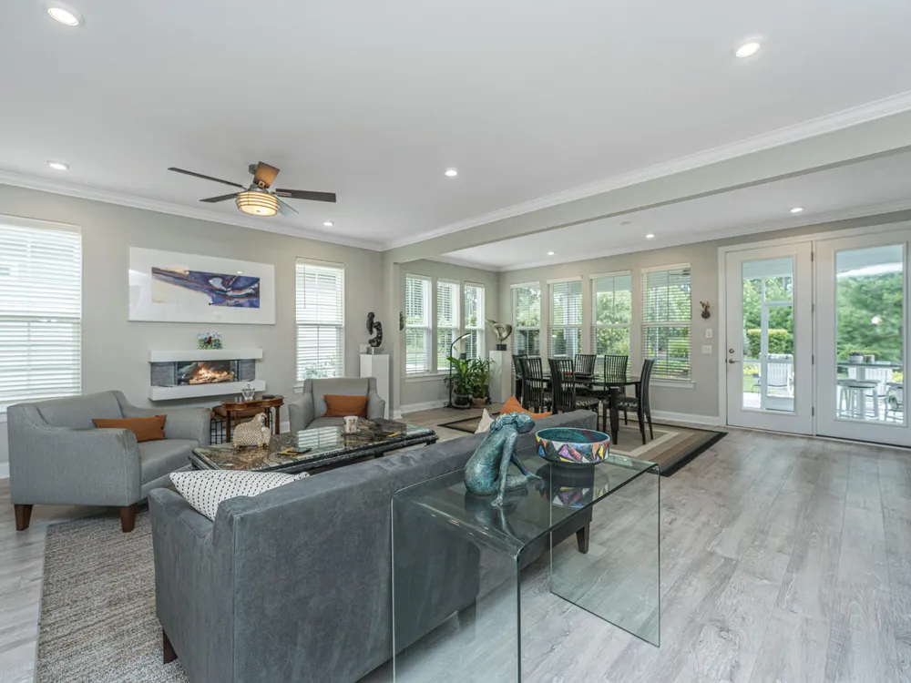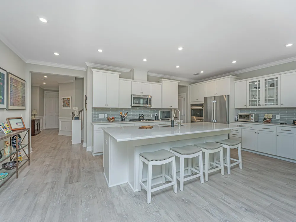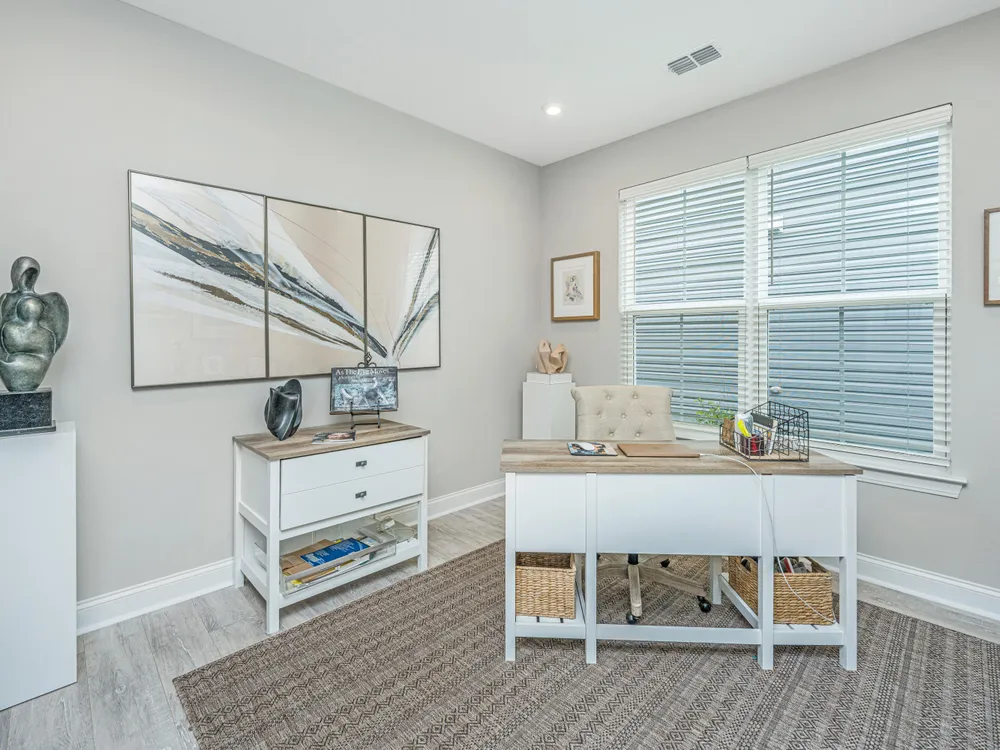 Welcome to 347 Seaside Trail, an exquisite 3 bedroom + office/ den, 3-bath home, beautifully nestled in the highly sought-after 55+ gated community of Four Seasons at Cane Bay Plantation. Situated on a premium private lot with no backyard neighbors, this 2,768 sq ft residence offers refined traditional style with a cozy cottage feel and upscale finishes throughout. From the inviting covered front porch, meticulous landscaping, to the beautiful trim work throughout and light-colored LVP floors that greet you in the foyer, every detail has been thoughtfully designed. The open-concept floor plan seamlessly connects the stunning chef's kitchen, dining area, and family room which creates a perfect space for entertaining...Enjoy Quartz countertops, beautiful back splash, GE Café 5-burner gas cooktop, double ovens, stainless appliances, staggered gourmet cabinetry with molding, full pantry, and a large island with seating. The family room offers a custom, sleek wall mounted fireplace, and flows right into the dining area which offers multiple windows bringing in an abundance of natural lighting. The main-level primary suite features a tray ceiling, triple windows for abundant light, a custom walk-in closet, and a luxurious ensuite with tile flooring, a floor-to-ceiling tiled walk-in shower, vanity with dual sinks, and private water closet. An additional bedroom w/ built-in bookcase with a pull-out Murphy desk, an office/den, and a full bathroom are also located on the main level. Upstairs is a spacious loft featuring LVP flooring, an additional bedroom, and a third full bathroom, which offers the perfect space for guests, hobbies, or relaxation. Step outside to a gorgeous screened-in porch with tile flooring and ceiling fan, a custom-coated patio, tall privacy bushes, and lush landscaping, which backs to woods, and enjoy your private retreat. Enjoy resort-style living in Four Seasons with amenities like a lakeside clubhouse, fitness center, tennis, pickleball, indoor/outdoor pools, kayaking, walking trails, and a 300-acre lake system. This isn't just a home, it's a lifestyle! Schedule your private showing today and discover why so many love calling Four Seasons home