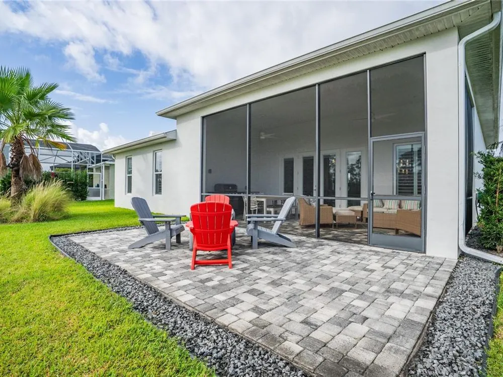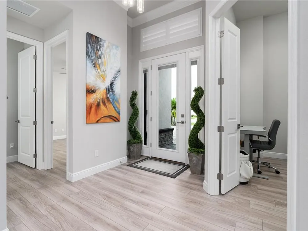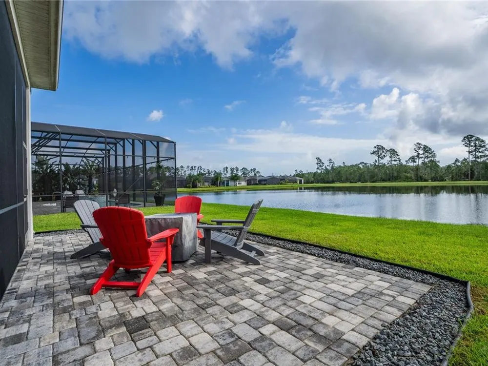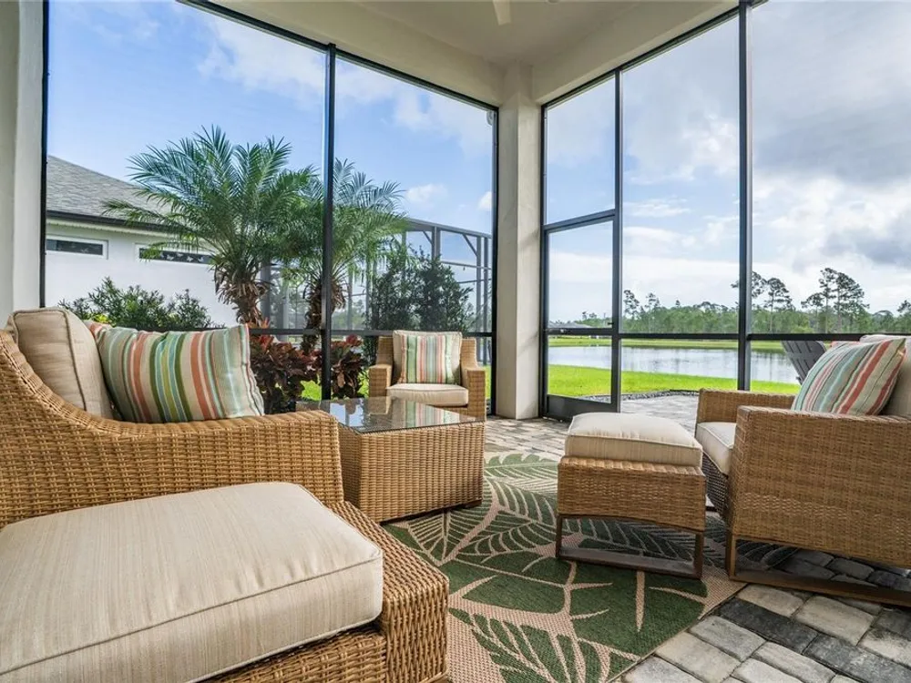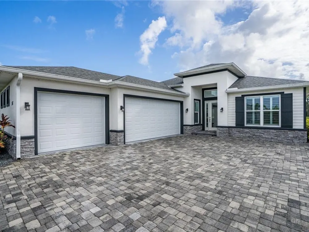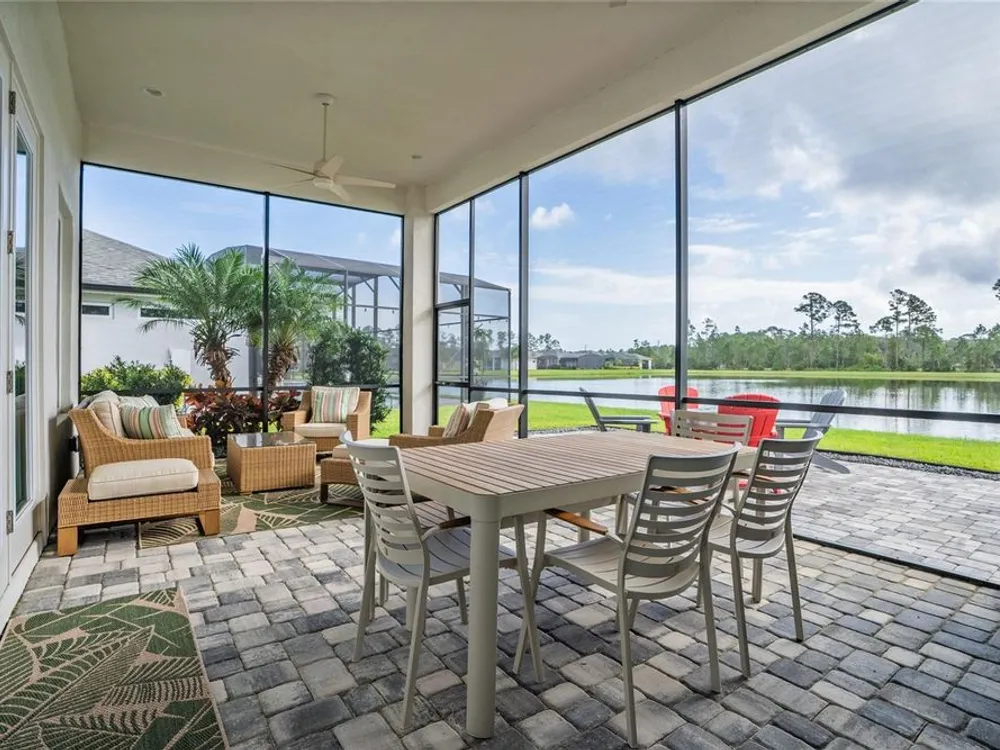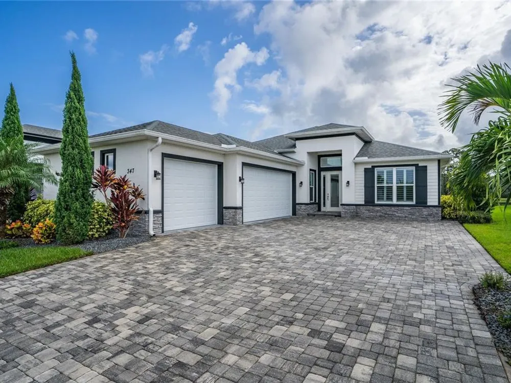 One or more photo(s) has been virtually staged. Experience refined Florida living in this beautifully crafted 3-bedroom, 2-bath Johnson-built custom home, complete with a 3-car garage and dedicated office space. Perfectly positioned to capture expansive, long-range lake views, this residence offers both elegance and tranquility. Step out to the extended screened-in lanai—ideal for relaxing or entertaining—while enjoying the serene waterfront backdrop. Inside, thoughtful upgrades include luxury vinyl plank flooring throughout, detailed crown molding, and a beautifully appointed primary bath with upgraded tile finishes. Nestled in the prestigious golf course community of Venetian Bay, this home combines elevated design with a coveted lifestyle. Additional features include gutters, a sun tunnel for added natural light, and a custom front door with built-in blinds. The kitchen is a chef’s dream with quartz countertops, recessed lighting, stainless steel appliances, soft-close cabinets and drawers, and upgraded door hardware. Both the guest and primary bathrooms are finished with quartz countertops, and crown molding enhances the living room, dining area, and kitchen. Enjoy the added convenience and style of French doors—also with built-in blinds—leading to the lanai, plantation shutters throughout the home, an epoxy-coated garage floor, paver driveway, and ceiling fans in every room, including two on the patio. Furniture is negotiable, making this move-in ready home even more appealing. Schedule your showing today and experience why this home at 347 Venetian Palms Blvd should be your new home-sweet-home!