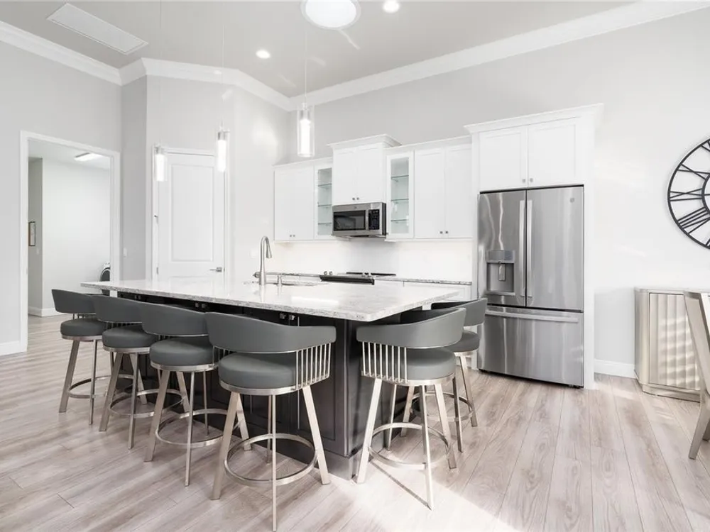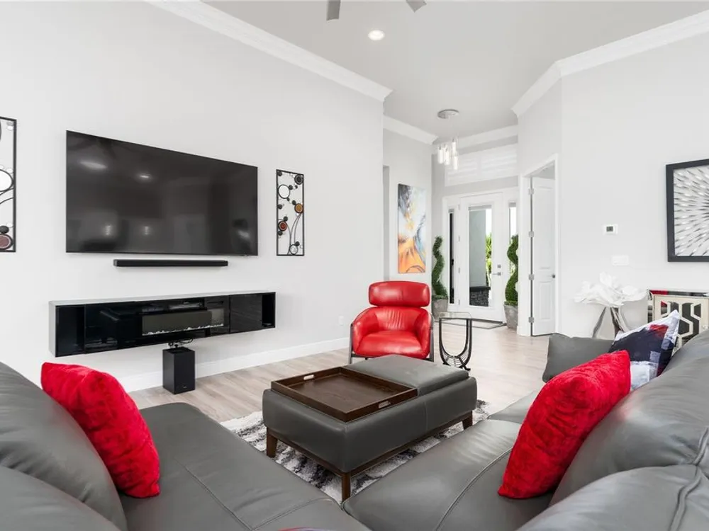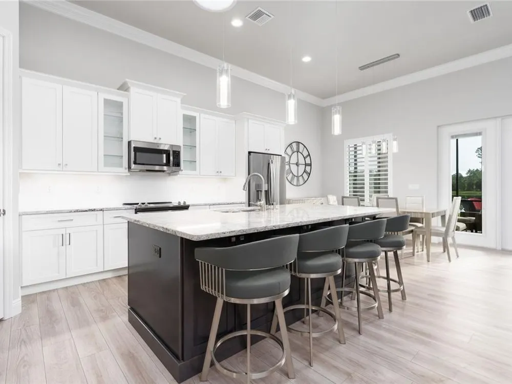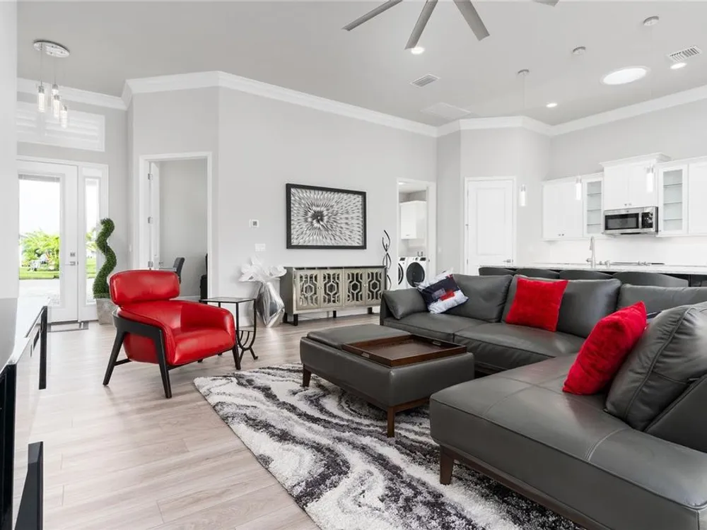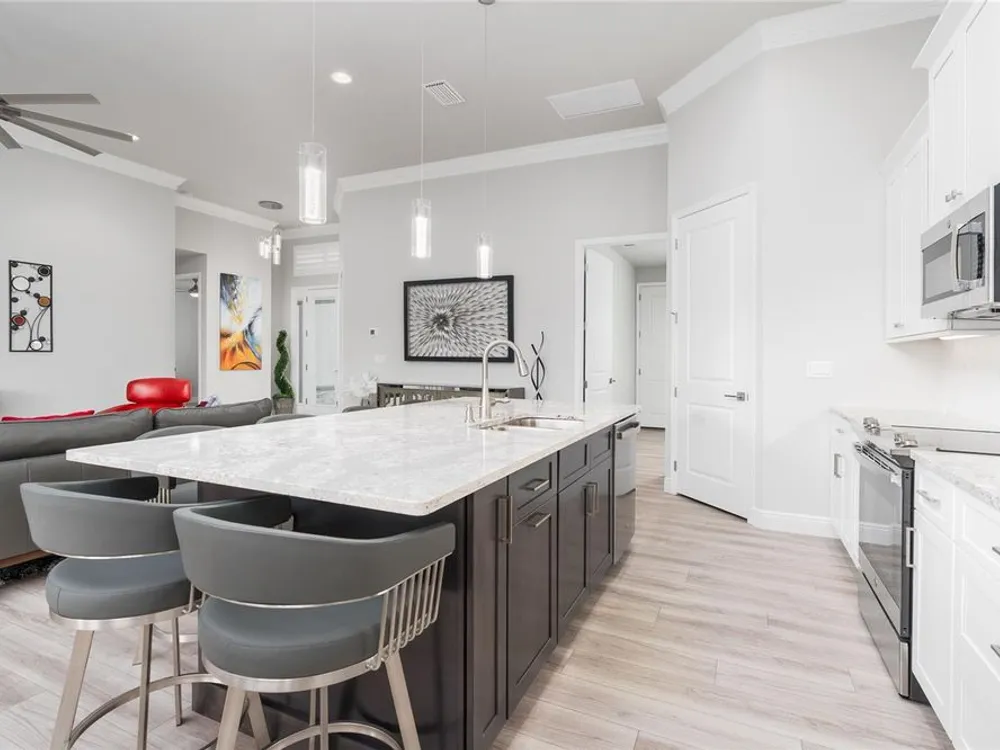 - Crown Molding, Living/Dining Room, Open Floorplan, Main Level Primary, Split Bedrooms, Stone Counters, Walk-In Closet(s)