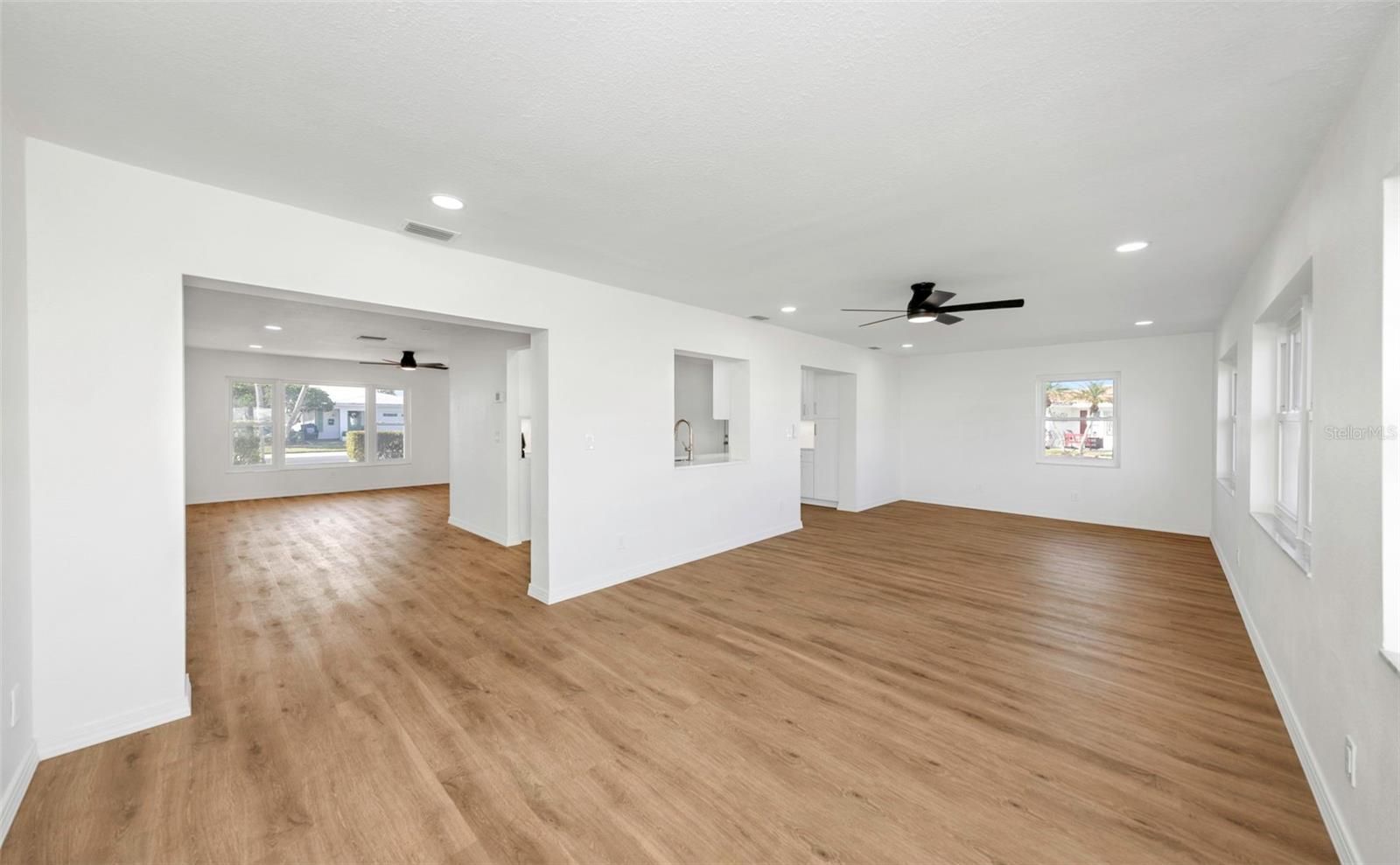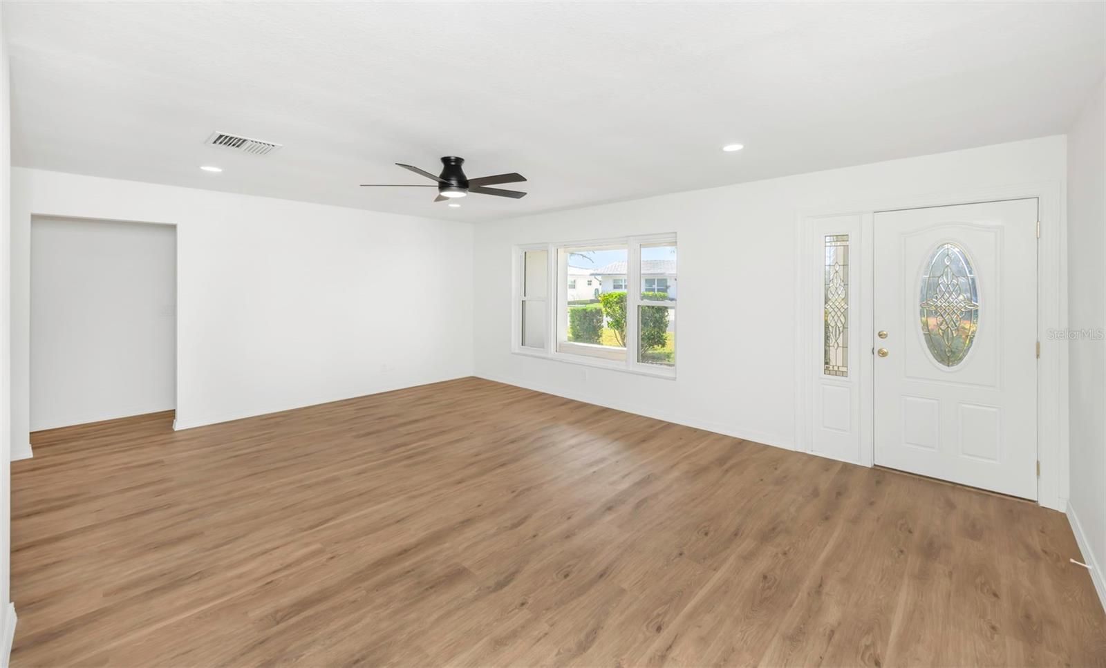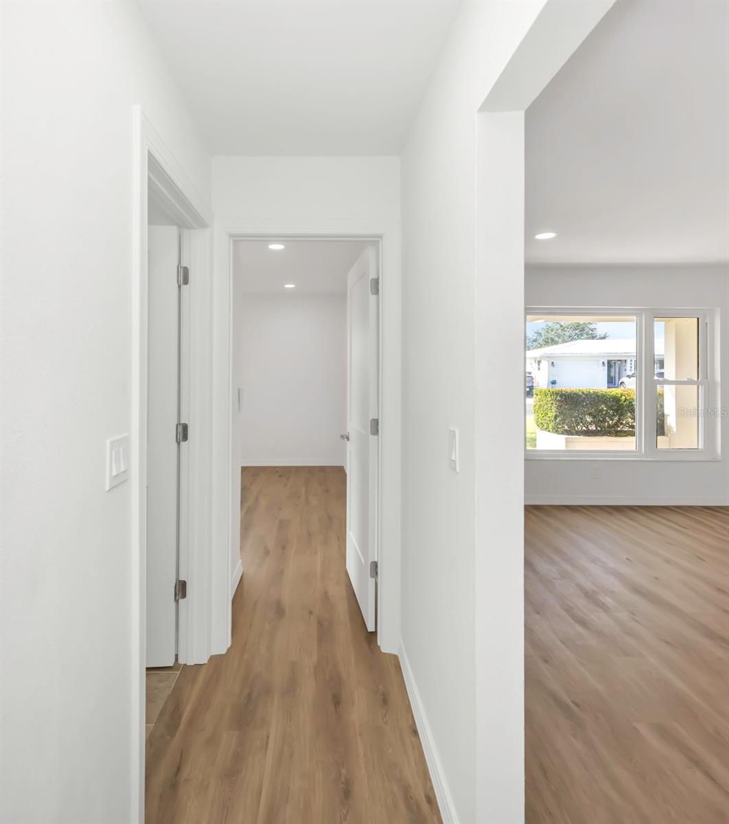The oversized covered front porch welcomes you into this completely renovated home in the desirable Mainlands of Tamarac 55+ community. Featuring impact-rated windows and a front door with decorative glass and sidelight, this move-in ready residence offers style and peace of mind. Inside, enjoy over 1,600 square feet of new waterproof vinyl plank flooring with no transitions, neutral colors, recessed lighting, and ceiling fans throughout. The updated kitchen showcases white shaker cabinets — including select glass-front cabinets for a modern touch — quartz countertops, stainless steel appliances, and under-cabinet lighting. Retreat to the spacious primary suite featuring a walk-in closet and a stylishly renovated en-suite bath. The second bedroom includes built-in closets for ample storage and functionality. Both bathrooms have been fully updated with tiled showers (no tubs), new vanities, and contemporary finishes throughout. Washer and dryer with utility tub are located in the garage, which also features a reinforced garage door and newly finished floor. Flat roof - 2014, HVAC - 2022, Flood Zone X. Affordable monthly maintenance fee of $485 includes roof repair and replacement, lawn care, exterior painting, water, sewer, trash, reclaimed water irrigation, internet, and two digital cable boxes — providing exceptional value and peace of mind. Mainlands community offers clubhouse, heated in-ground pool, shuffleboard courts, and a full calendar of activities. The neighborhood surrounds an 18-hole public golf course and is adjacent to Freedom Lake Park, featuring paved walking trails around two lakes, outdoor fitness equipment, bocce courts, playground, picnic pavilions, dog park, and sailboat racing. Conveniently located near shopping, dining, medical facilities, banking, and cultural and sporting venues.