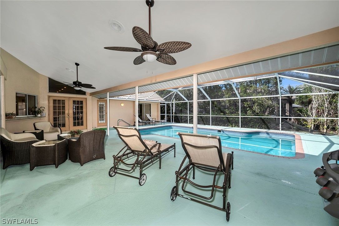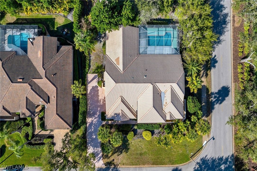Set within the desirable Longlake enclave of Pelican Landing, this light-filled residence captures private tropical landscape views and effortless Florida living with spacious screened lanai, expansive pool and three-car garage. Designed for entertaining and everyday comfort, the home offers three bedrooms, two-and-a-half baths, and seamless indoor-outdoor flow enhanced by multiple French doors and expansive glass sliders. The covered outdoor living area features dual ceiling fans and overlooks the sparkling pool framed by lush, mature landscaping, creating a serene and secluded setting for relaxed afternoons or evening gatherings. A welcoming French door entry with transom window opens into the foyer and flows directly into the impressive great room, where a stunning chandelier and vaulted ceilings elevate the space. Glass sliders with transom windows invite abundant natural light indoors and connect effortlessly to the lanai. Diagonal tile flooring, white plantation shutters, and plentiful windows throughout create a bright, airy ambiance. The formal dining area is elegantly appointed with a bay window featuring an arched transom, chandelier, decorative wall trim, and a custom mirror for added sophistication. The kitchen blends functionality and style with granite countertops, stainless steel appliances, including a cooktop, wall oven, dishwasher, refrigerator/freezer, and under-counter microwave, along with an island featuring a bar counter for casual seating. A convenient pass-through window to the lanai enhances entertaining, while the adjacent dining area offers recessed lighting and a French door providing direct outdoor access. The family room showcases transom windows, vaulted ceilings and charming built-in shelving with a window bench, creating a cozy yet open retreat. The primary suite is a private sanctuary with glass sliders to the lanai and a spa-inspired bath designed as a tropical retreat overlooking a secluded courtyard through panoramic windows. Two mirrored-door closets provide ample storage, while the bath features dual vanities with a full-width mirror and makeup counter, a large walk-in shower with bench and glass enclosure, and a separate jetted soaking tub. Two guest bedrooms with ceiling fans are near a full bath with dual sinks and a shower-tub combination with glass enclosure, also serving as a convenient pool bath. A generously sized walk-in closet with shelving is off the hallway, and a powder bath adds further convenience for guests. Residents of Pelican Landing enjoy a premier lifestyle with championship golf (membership waitlist), private beach access, nature trails, kayak waterways, and tennis and pickleball. Just minutes from Gulf beaches and the shopping and dining of Mercato and Fifth Avenue South, this home offers exceptional privacy and convenience.
