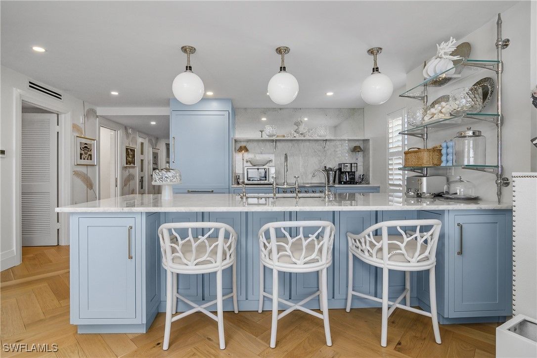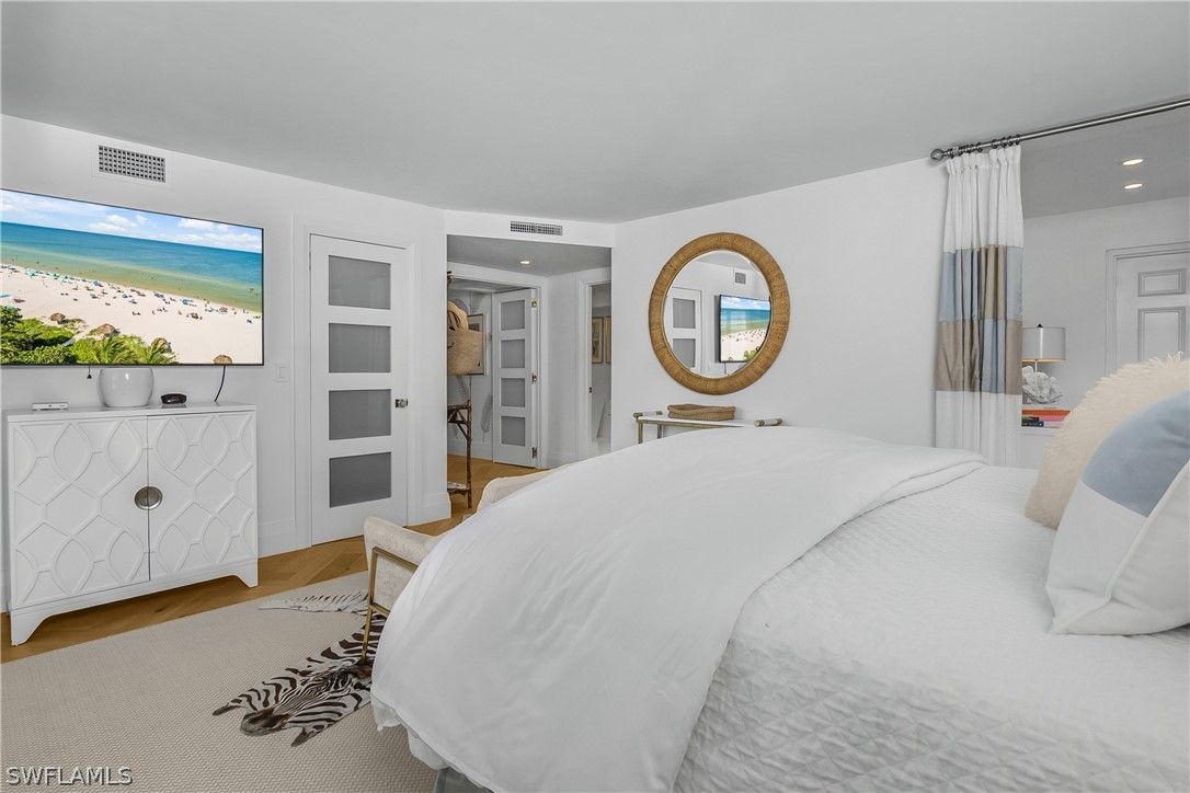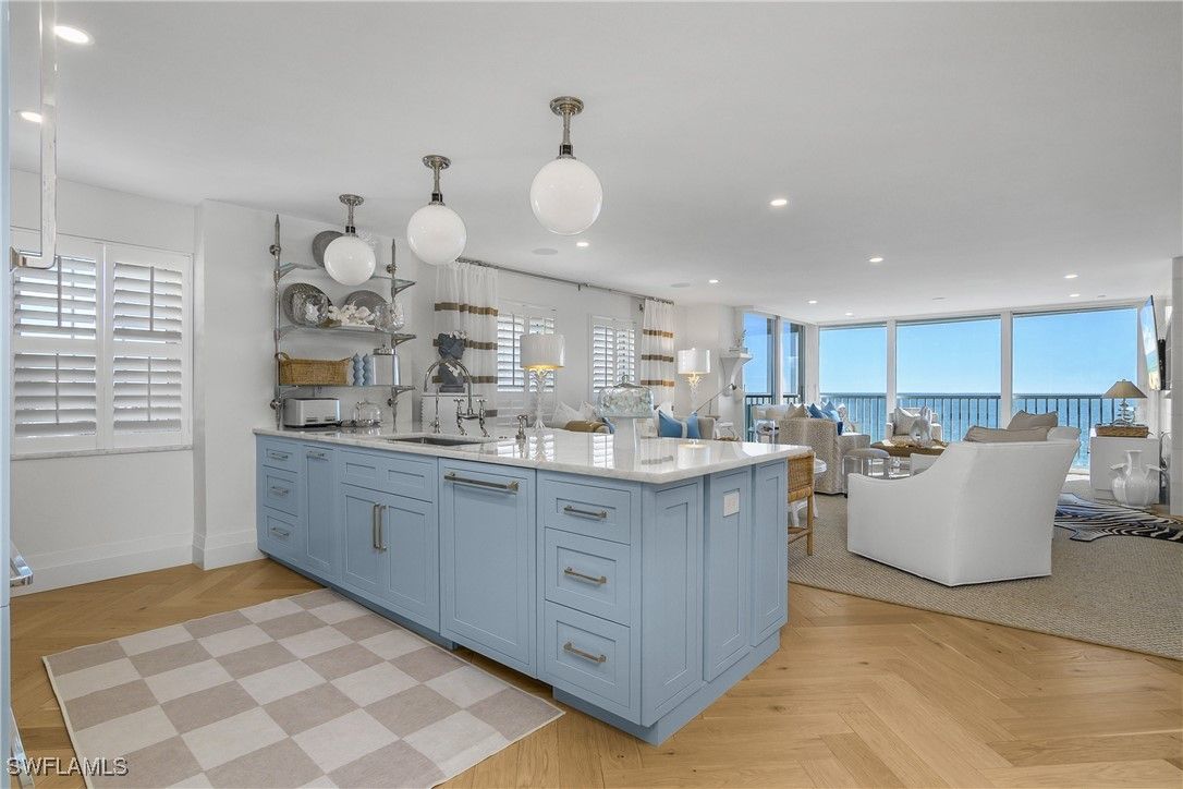 Welcome home to this luxurious beachfront end condominium residence at the St. Croix Club on the Moorings beach. This is a beautifully updated property which has been remastered by Joy Tribout Interiors, well known in St. Louis, Chicago, Arizona, and of course, Naples! She & her design specialists have rendered all of the elements which seamlessly make this property the epitome of coastal living. Here you'll enjoy the highest level of appointments, finishes, & fixtures. From its 5th floor vantage point, the best of sunsets, surf, and seaside memories present the beach lifestyle of your dreams. This is the ultimate destination for your winter getaway! The kitchen is both beautiful and functional for the most discerning gourmet chef. Gather around the stunning Cristallo Quartzite island, looking out to pristine Gulf views. The La Cornue stove is the pinnacle of gourmet luxury - imagine the meals, and memories, you'll savor here. There are gorgeous custom light fixtures throughout reminscent of the most luxurious hotel retreats and, of course, a Lutron lighting system too. Other features include SubZero refrigerator, Miele dishwasher, induction range and convection oven, as well as wine storage/chiller. Also, marble walls grace the full height of both the main living space and baths. The primary bedroom is spacious with two closets & pocket office space. The en-suite bathroom is a masterpiece! There is a walk-in rainfall shower, dual sinks, and a soaking tub which beckons you to relax. And, the guest BR space features ample room and privacy for your guests with an adjacent bath every bit as appealing and luxurious as the master bath. Positioned in the coveted 02 front stack, property offers breathtaking western and SW Gulf views, as well as a hint of a serene evening cityscape at twilight. Abundant natural light is often the hallmark of all of the premier destination buildings at the Gulf, and this residence perfectly captures that essense. St. Croix Club offers recently updated amenities, including an on-site fitness center, beachside pool and cabana/baths, a grilling area, community room, and seasoned, thoughtful on-site management. The Moorings community is the perfect springboard to launch any and all of your Naples adventures including world-class shopping, dining, galleries, golf, boating, pickleball/tennis, & more. For great boutiques & bistros, it's an easy stroll to the wonderful restaurants and shops at Venetian Village, and also close to downtown Old Naples, 5th Ave. S. and historic Third St. S., as well as the Waterside Shops, Artis-Naples, & Mercato. If you are a boater, there may be opportunities at the nearby Venetian Yacht Club for boat slip purchase/lease. St. Croix #502 is inviting, sophisticated, modern and magnificent. It's a peaceful space in the sun and a true beauty on the beach. One underbuilding parking space is adjacent to your private storage unit. Ample guest parking spaces, too.