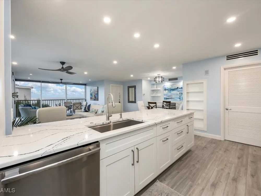 Sweeping Gulf Views in The Moorings! Perched on the top floor of St. Croix Club, this two-bedroom residence captures sunrise-to-sunset views with the soothing sounds of the Gulf just outside your windows. Inside, you’ll find a beautifully re-designed open kitchen with quartz countertops, stainless steel appliances, breakfast bar & under-cabinet lighting. An expanded living area with a dry bar makes entertaining easy. The primary bedroom suite offers a cozy office alcove complete with a city view. An in-unit laundry, abundant storage & luxury vinyl flooring throughout are also part of this offering. With only two residences per floor, natural light pours in from three sides. St. Croix Club has completed exciting new amenities, including: a reimagined beachfront pool with extended deck, pergolas & social area, a new fitness center & redesigned social room. Additional conveniences include secured entry, under-building parking, and private storage. All of this is located just moments from the boutique shopping and fine dining of Venetian Village.