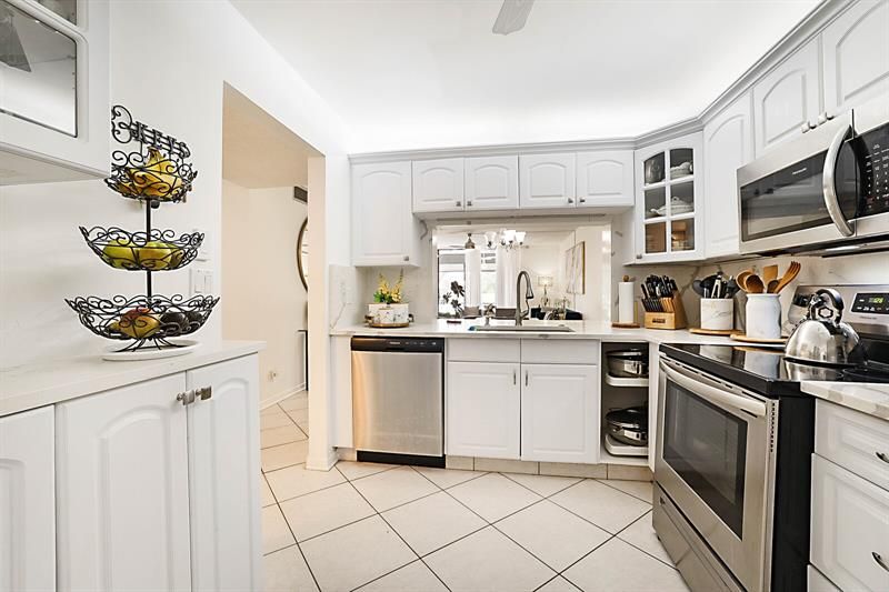 CORNER UNIT! FIRST FLOOR. 55+ Community. This beautiful 2/2 apartment features remodeled kitchen equipped with white cabinets, elegant quartz countertops & new stainless-steel appliances. Two full bathrooms and in-unit washer & dryer. Tile flooring throughout. Corner unit gives you added natural light. Located on the first floor for easy entrance. Parking easily accessible right in front. The extra-large screened porch, accessible from both the master bedroom and living room, offers tranquil views of the water, nature, and stunning sunsets, complemented by roller shutters for storm protection. The community boasts a well-appointed center, pool, gym, and various activities, all within proximity to restaurants and shopping malls, making it must-see. Nature all around won’t disappoint.