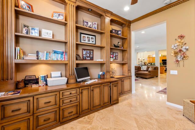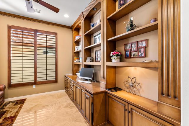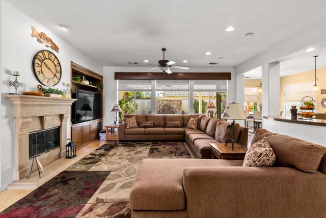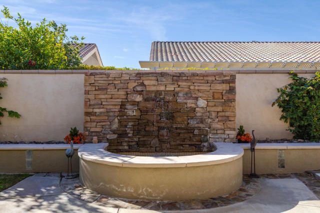 Wonderful 2,318 sq ft open floor plan Monterrey model. There have been many recent upgrades to this south-facing home including the house being painted in June 2025, as well as new appliances in June 2025, and NEW water heater! Great Room with fireplace and built-ins. 2 bedrooms + den/office, 2.5 bathrooms with the primary bright and spacious, with updated closet. Travertine tiles throughout the house with plantation shutters. Large eat-in kitchen with plenty of counter space, center island, granite counters, pantry, and lots of natural light. The backyard is very private and beautiful flagstone waterfall, terrific for entertaining. Includes BBQ, misting system, and has an Alumawood patio cover. Primary bedroom has French doors leading out to the back patio. The garage has epoxy floors, a ''mini split'' AC, and a workstation. This house is located in the newer section of Sun City, built in 2003, and has been lovingly maintained. A great home in a great community with so many clubs and activities for you to enjoy!