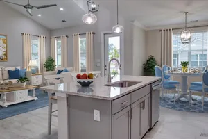 Soothing Neutral tones! Popular 2023 "Dreamsicle Model" Margaritaville cottage on an outside lot w/ green space! Desirable phase 5 location facility!! A short golf cart ride to both the town center and the lake house! A wrap around porch too! Cottage style home w/ many upgrades! Crown molding, natural gas range, refrigerator, Washer and Dryer included- a convenient plus! Elegant 8' doors & 42" soft close cabinets! Upgraded tile & hard surface floors throughout. Quartz countertops! Recessed lights! Exterior painting, landscaping, grass & irrigation included. Wonderful neighbors! Enjoy a vibrant 55+ community w/ a variety of activities & clubs. Experience a "vacation resort lifestyle" everyday.