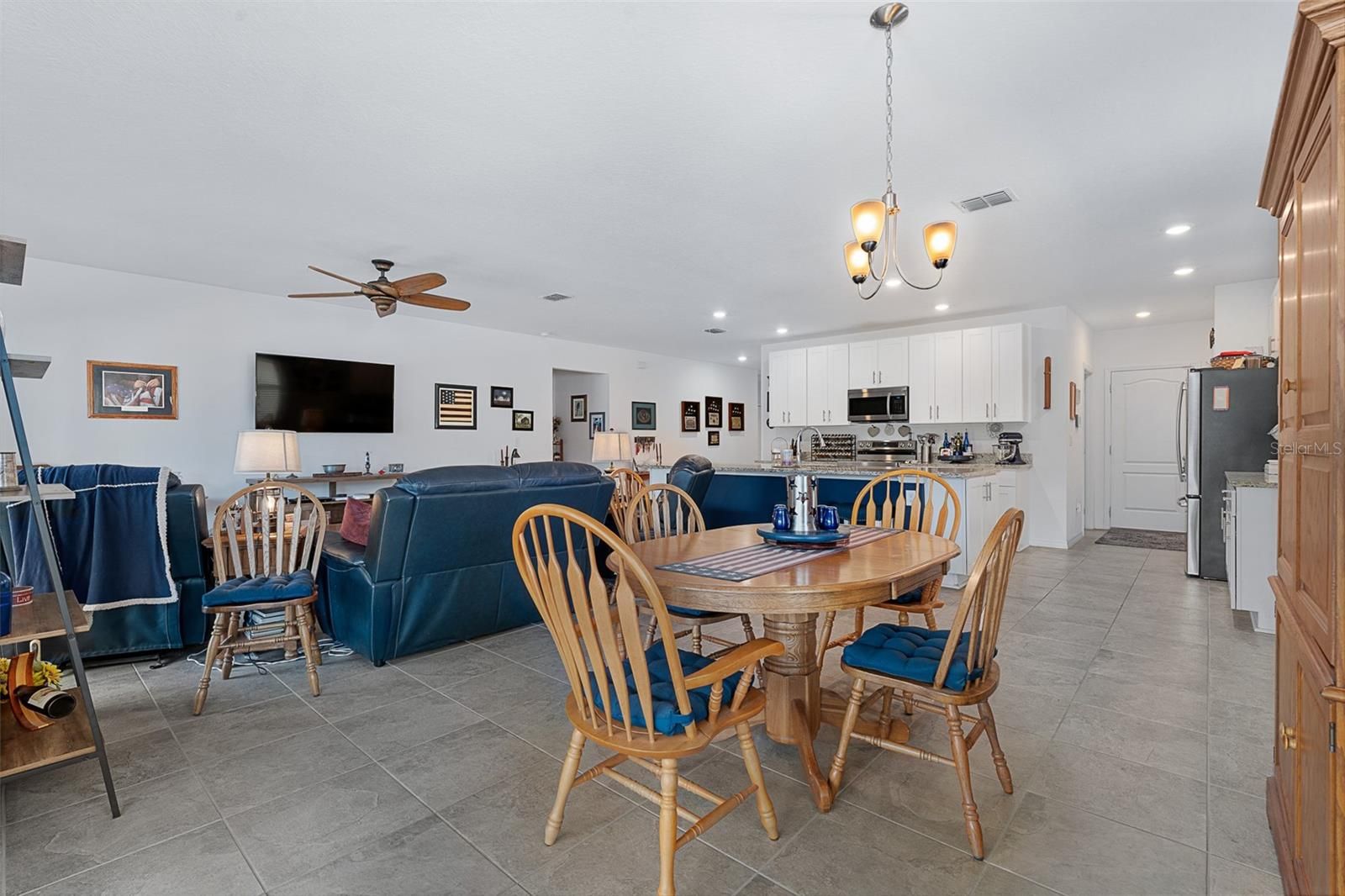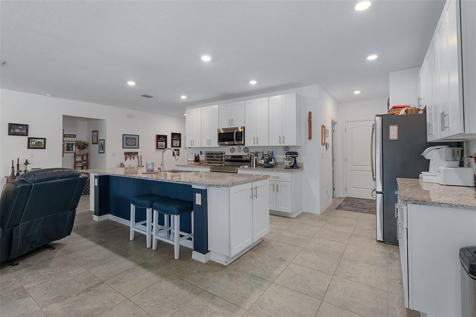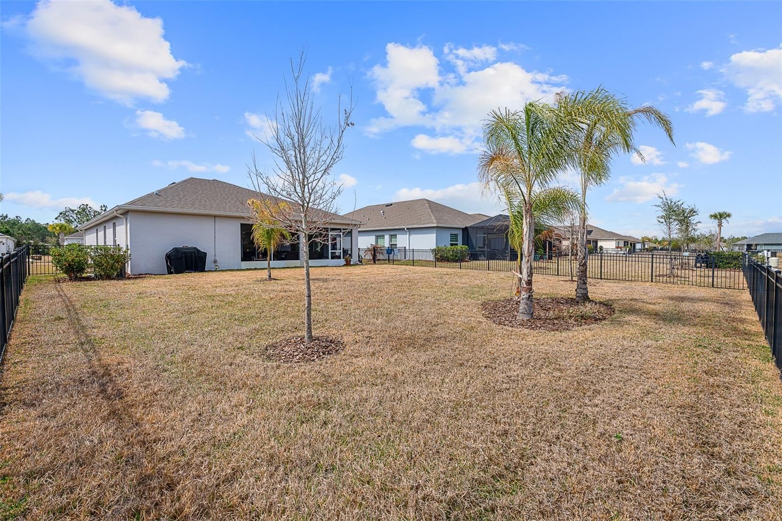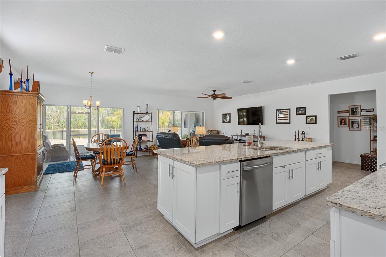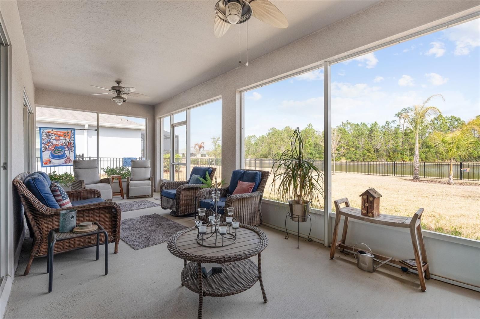 Welcome to 35 Fawn Haven Trail, a beautifully appointed three bedroom, two bath maintenance-free home located in the sought-after 55+ Huntington Village community within Hunter's Ridge. Built in 2022, this concrete block is a thoughtfully designed residence that offers an open floor plan and an exceptional setting on a large lake with preserve views beyond, creating a truly grand and private backdrop that can be enjoyed from multiple rooms throughout the home. From the moment you enter, you are drawn to the wide open kitchen featuring granite countertops, 42-inch white cabinetry, stainless steel appliances, and a large island that overlooks the dining area. Tile floors flow seamlessly through the main living spaces, enhancing the light and airy feel. The dining room offers sliders that open to the lanai, while the spacious family room continues the tile flooring and features additional sliders leading to the extended lanai where breathtaking lake and preserve views become the focal point. These stunning water views are visible from the kitchen, dining room, and family room. The owner's retreat is tucked away for privacy and features a tray ceiling, large walk-in closet, and an en suite bath complete with dual granite vanities and an oversized walk-in shower with a seat and grab bar inside and three shower heads including a rain feature. Bedrooms two and three are positioned at the front of the home and are both finished with ceiling fans. The second bath offers a granite countertop and a tiled tub and shower combination. This home is completed with a generously sized laundry room and a full two-car garage. Outside, truly enjoy all that Florida living has to offer with a fully fenced backyard. Fence is low maintenance aluminum combining elegance and durability. An extended lanai overlooks the lake and preserve, providing peaceful views and added privacy. Every detail has been carefully finished, including a full gutter system, Ecobee thermostat, security system, whole house water purifier, additional professional landscaping, and upgraded light fixtures throughout. Huntington Village is a beautiful 55+ community offering a clubhouse and social gathering spaces, swimming pools, walking and biking trails, and expansive green space as part of the larger Hunter's Ridge master plan, which includes an impressive nature preserve. Residents enjoy organized social activities, community events, fitness opportunities, and neighborly meet-ups, along with access to the larger Hunter's Ridge clubhouse and pool area. This is low-maintenance living paired with breathtaking views in one of Ormond Beach's most desirable active adult communities.