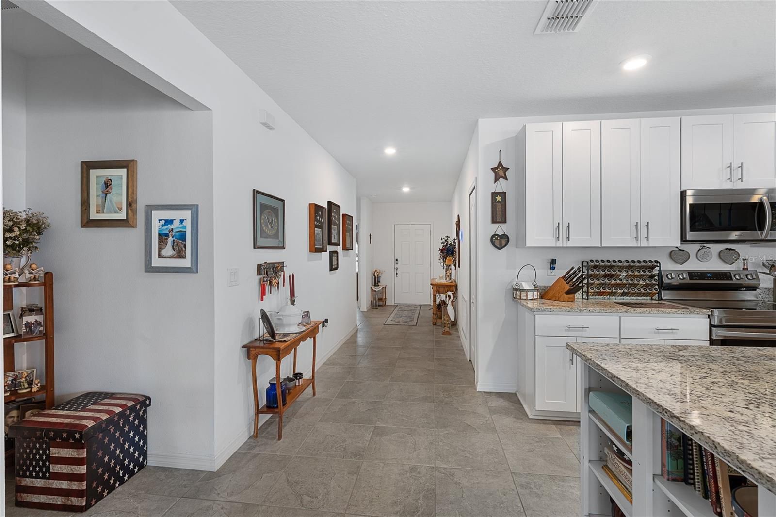 - Ceiling Fan(s), Eat-in Kitchen, High Ceilings, Kitchen/Family Room Combo, Open Floorplan, Solid Surface Counters, Split Bedrooms, Stone Counters, Thermostat, Tray Ceiling(s), Walk-In Closet(s), Window Treatments