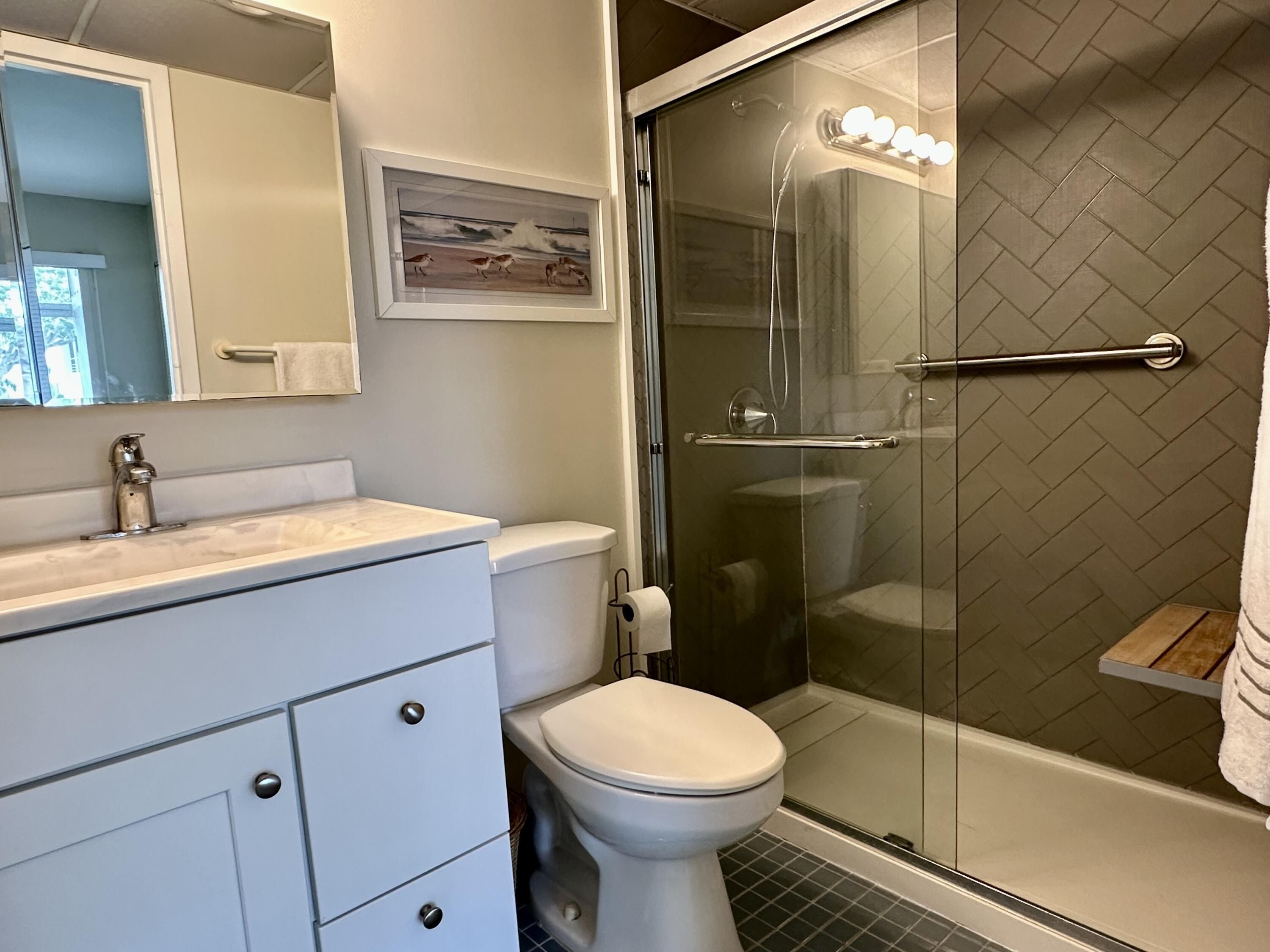 - Entry Level Living Area, Florida Room, Living/Dining Room, Impact Glass, Plantation Shutters, Primary Downstairs, Separate Shower