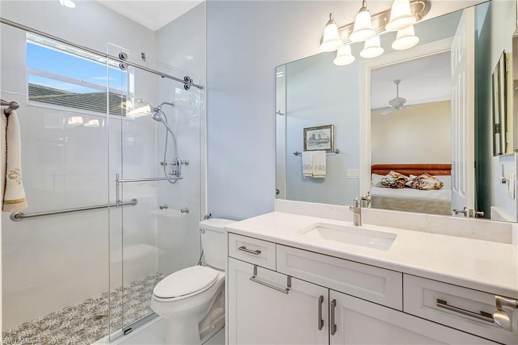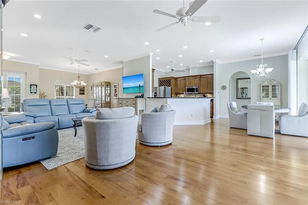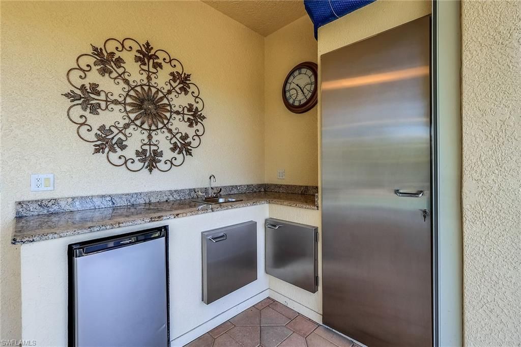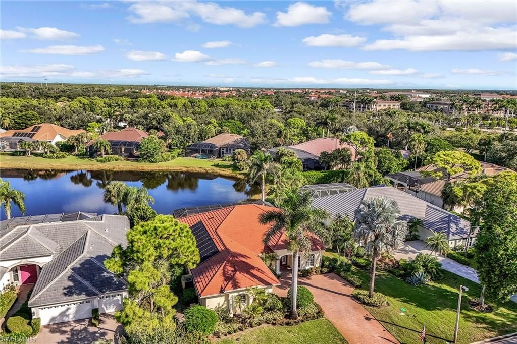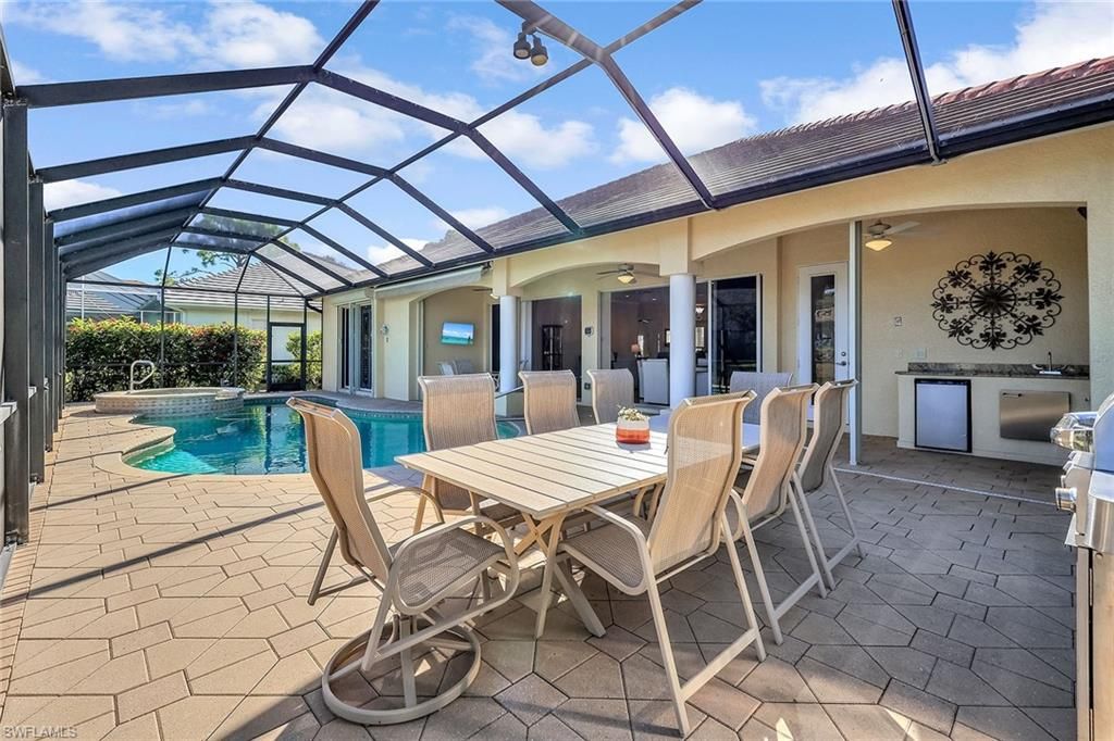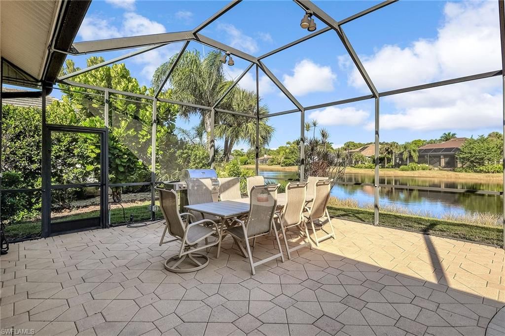 Sweeping lake and pool views define the experience at this refined Pelican Landing residence. With water vistas framed through wide sliding doors, the great room opens directly to a screened lanai with an outdoor kitchen. The pool and spa are heated by both solar and electric systems, offering year-round comfort. A dedicated gas line is installed for the built-in grill—conveyed with the sale—and connected to a 250-gallon propane tank. The outdoor area is ideal for entertaining in a private, lakeside setting.Designed for flexibility, the residence includes four bedrooms and three baths. One bedroom has been transformed into a custom-built office with dual workstations and bay windows that welcome abundant natural light. Engineered wood flooring flows throughout, complementing a recently completed full interior repaint. Two guest baths have been fully remodeled with stylish finishes, including one with en-suite access. The primary bath is thoughtfully designed for comfort and function.A dedicated generator provides backup power to the garage, kitchen, primary suite and office. The oversized two-and-a-half-car garage includes a water purifying system and central vacuum.Located in a gated, amenity-rich community, residents enjoy access to a private beach park with complimentary boat shuttle, tennis and pickleball courts, a fully equipped fitness center, kayak and canoe launch, butterfly garden, sailing club and miles of nature trails. This home combines waterfront serenity with a premier Southwest Florida lifestyle.