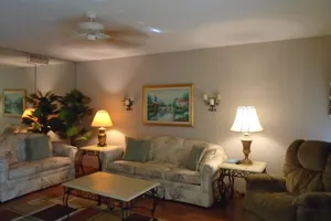 Very clean 2 bedroom 1.5 bath unit. Great view from the screened porch. Laminate floor in the living room carpet in the bedrooms.All the furniture stays. Regal Palms is an active 55+ community featuring clubhouse, pool, shuffleboard billiards and more. Well maintained grounds centrally located near shopping, airport, beaches and pharmacy.All figures are approximate.