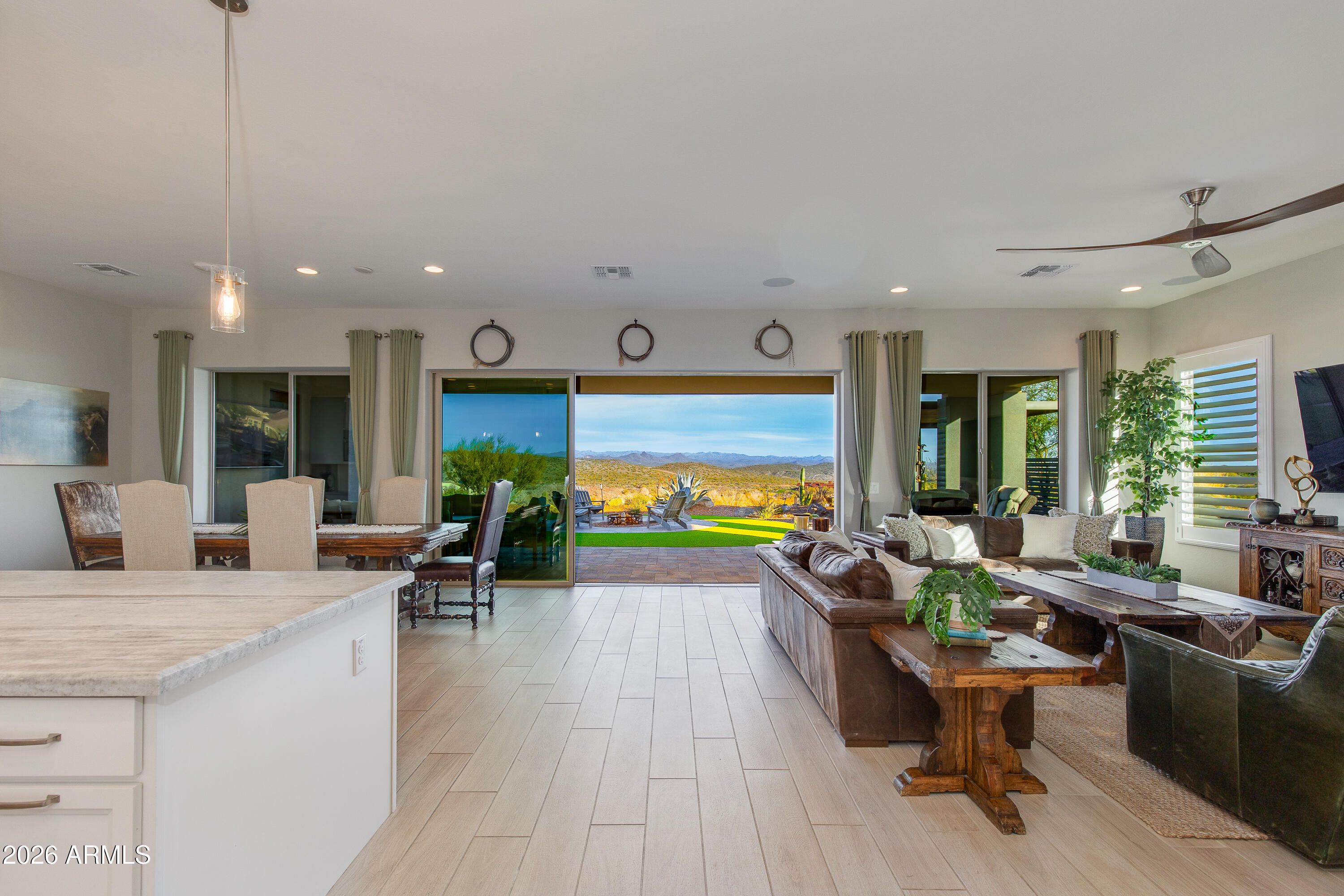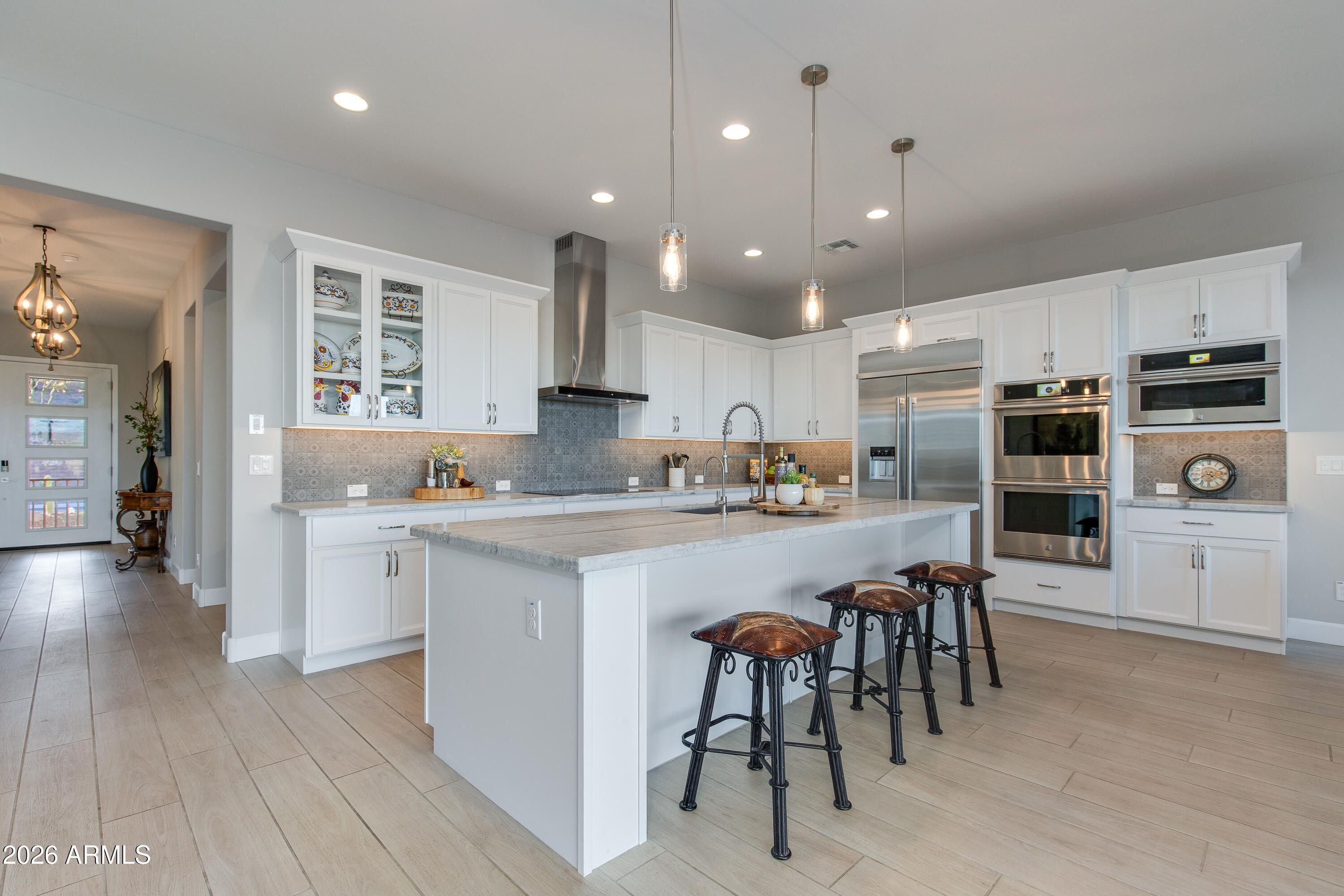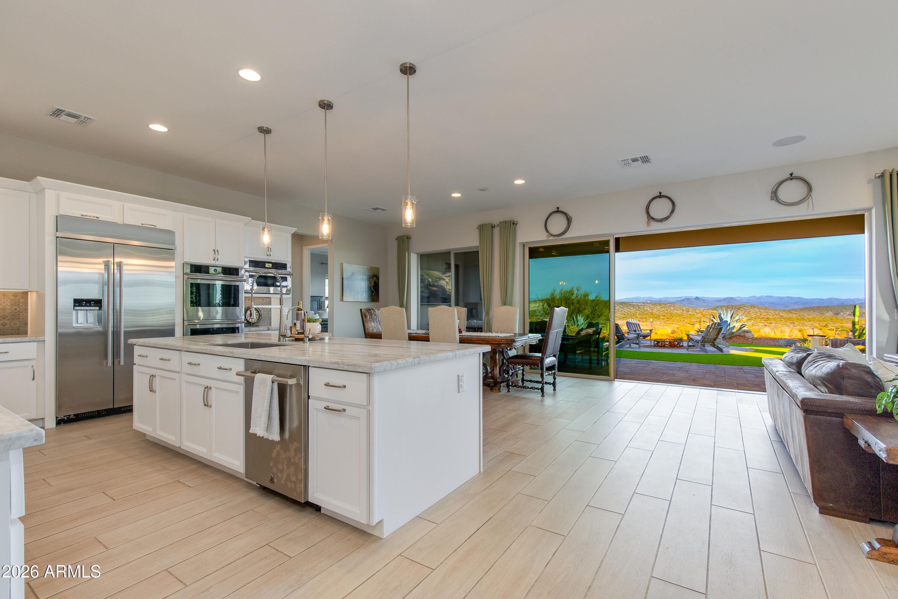 Spectacular elevated homesite with sweeping eastern views, perfectly positioned just moments from Wickenburg Ranch's premier amenities. Expanded Cordoba plan with optional Bed 3 & Bath 3 offers over 2,700 sqft of thoughtfully designed living. Gourmet kitchen showcases Arctic White cabinetry, AZT Fantasy White satin marble counters, JennAir induction cooktop, double ovens, built-in 42'' refrigerator, custom backsplash & wine room. Dramatic multi-slide glass doors create seamless indoor/outdoor flow. Luxurious primary suite features heavy glass shower enclosure, custom tile surrounds & curated finishes throughout. Extensive lighting, upgraded flooring, two-tone paint, smart wiring & designer hardware complete this exceptional home.