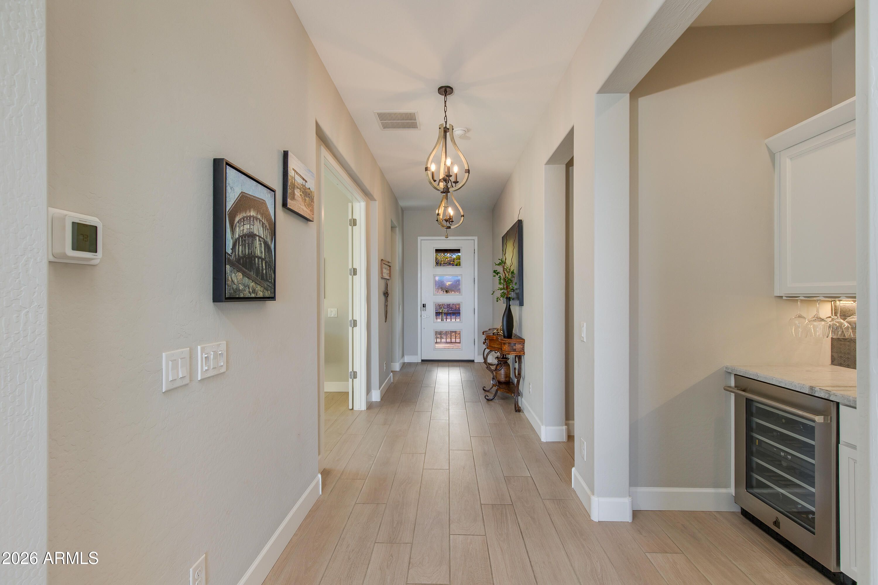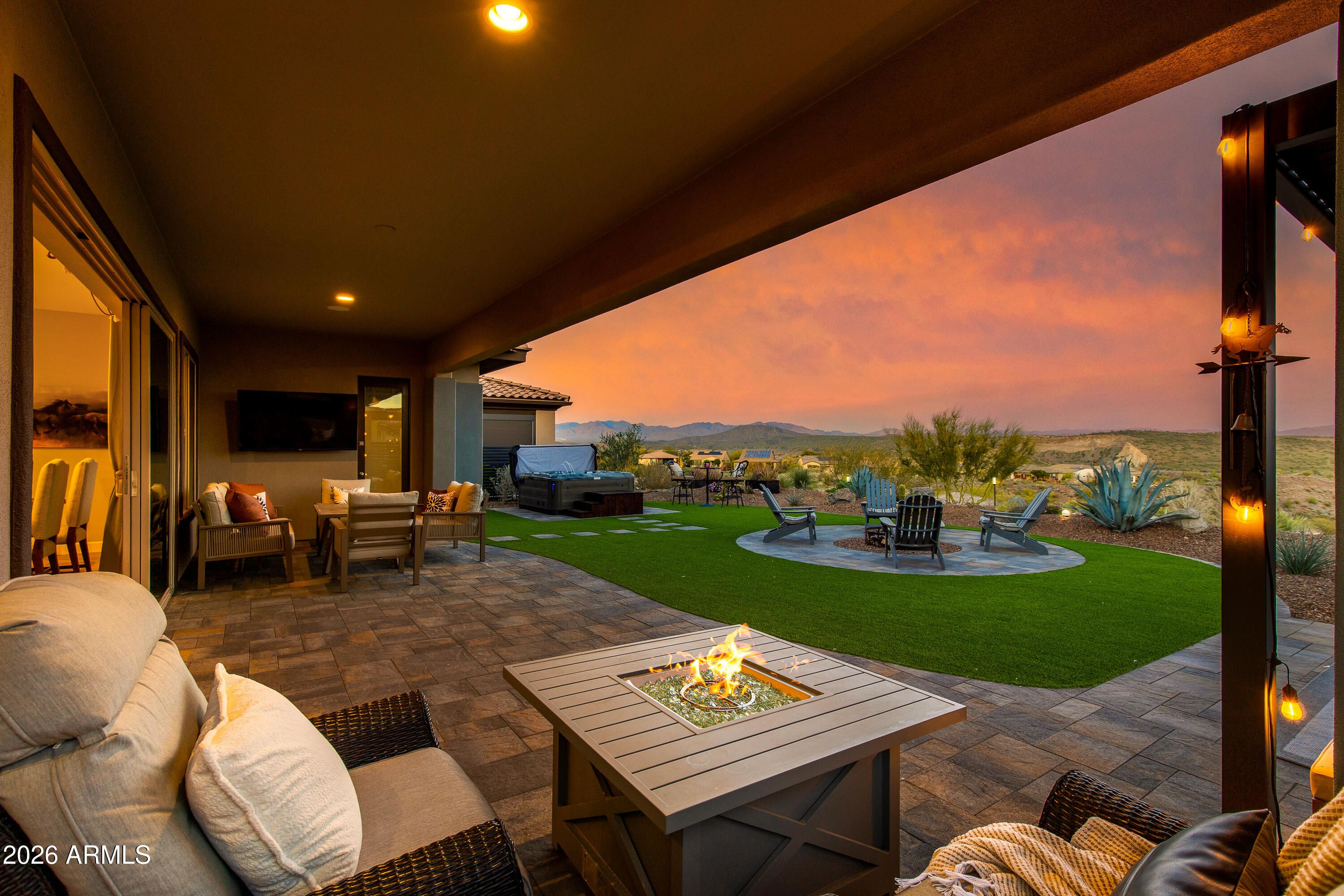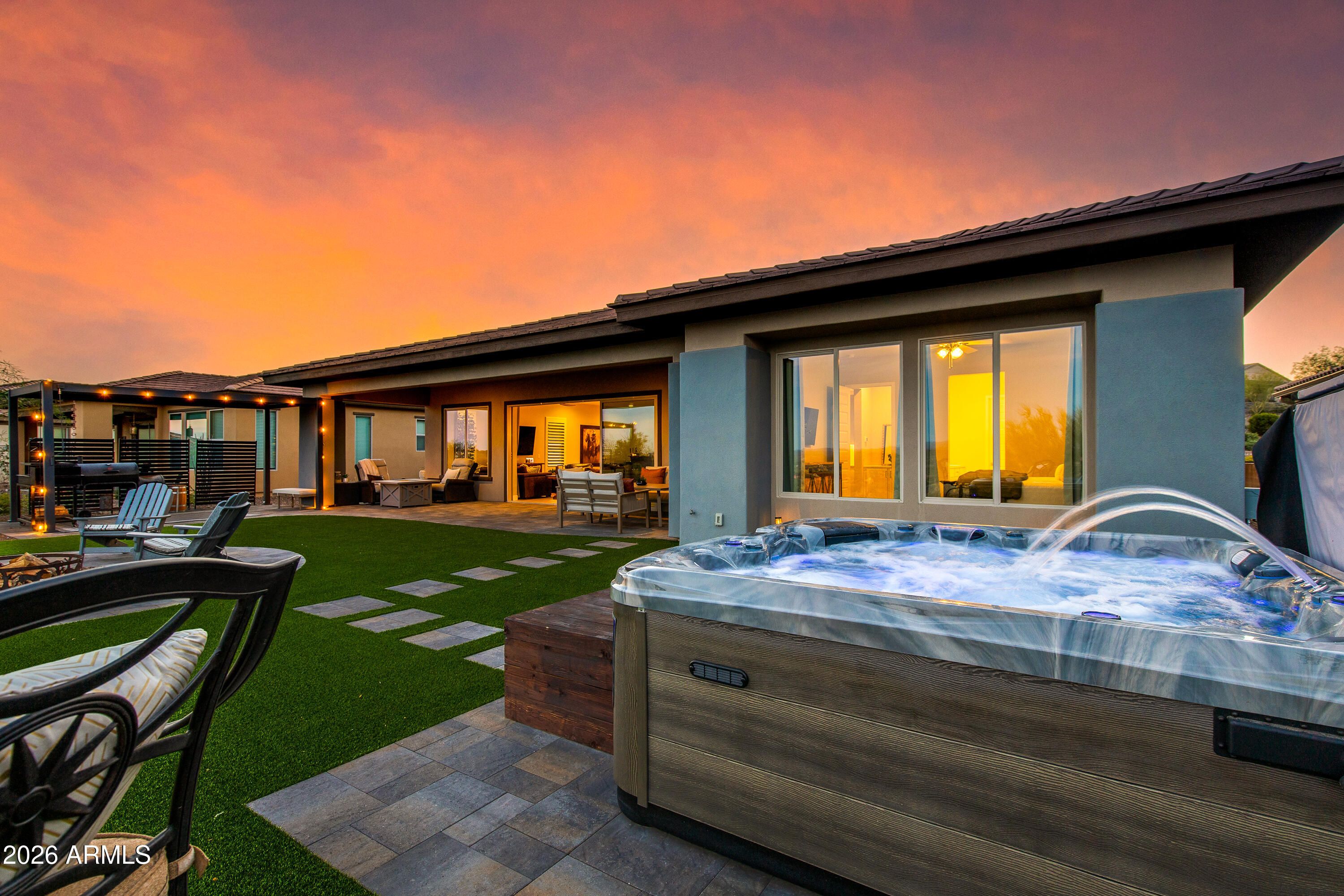 Spectacular elevated homesite with sweeping eastern views, perfectly positioned just moments from Wickenburg Ranch's premier amenities. Expanded Cordoba plan with optional Bed 3 & Bath 3 offers over 2,700 sqft of thoughtfully designed living. Gourmet kitchen showcases Arctic White cabinetry, AZT Fantasy White satin marble counters, JennAir induction cooktop, double ovens, built-in 42'' refrigerator, custom backsplash & wine room. Dramatic multi-slide glass doors create seamless indoor/outdoor flow. Luxurious primary suite features heavy glass shower enclosure, custom tile surrounds & curated finishes throughout. Extensive lighting, upgraded flooring, two-tone paint, smart wiring & designer hardware complete this exceptional home.