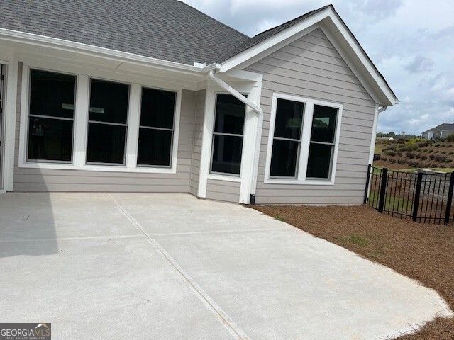 Quick Move-In opportunity on Homesite 100, a large pie-shaped homesite across from the lake, just shy of 1/4 acre, at The Courtyards at Bailey Farms! Our award-winning Portico floor plan, with a bonus suite, has 3 bedrooms and 3 bathrooms with a large, very open, courtyard in our 55+ Active Lifestyle Community. A deluxe kitchen with a gas cooktop, quartz countertops, light wicker color stain full overlay kitchen cabinets, soft closing doors and drawers, roll out shelves and pull-out trash center. Wall ovens with microwave and French 3 door refrigerator included. The open-concept family room, with a fireplace, flows seamlessly into the kitchen and dining area, allowing you to be a part of all your gatherings, even while cooking in the well-equipped kitchen. Enjoy all the natural light from the many over-sized Pella windows at the front and side of the home along with views of the lake from the private courtyard. The owner's bath features a spa-like zero-entry shower, dual quartz vanities with undermount sinks, and a large linen closet. Spacious bonus suite with large bedroom, bathroom with a walk-in shower, and a fabulous view of the lake from the living area. Located in a prestigious Epcon community, The Courtyards at Bailey Farms, residents enjoy resort-style amenities including a pool, large clubhouse with fitness center, pickleball courts, fenced-in dog park, fire pit area and a lake with a dock and plenty of fish! With easy access to I-85 and just minutes from the local grocery and other shopping and dining, 15 minutes to Mall of GA, golf courses, Little Mulberry Park, this home offers both convenience and an active lifestyle. Amenities and lawncare is covered by monthly HOA fees of $185. Ask agent for special quick move in promotions.