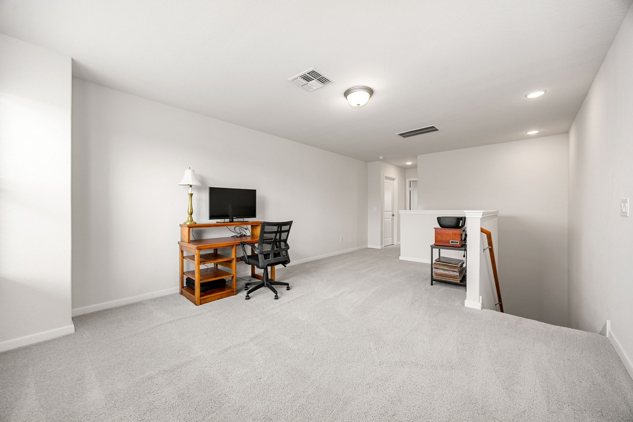 Welcome to Del Webb Sweetgrass, an exclusive 55+ community offering resort-style amenities & a great location near I-69, shopping & dining. This beautifully maintained 3-bedroom, 3-bath home by Pulte features 2,650 square feet of thoughtful design & comfortable elegance. A welcoming foyer opens to the formal dining area & flows into a bright, open-concept living space with high ceilings & a cozy gas-log fireplace. The gourmet kitchen impresses with granite countertops, stainless steel appliances, & a large island. A sun-filled bonus room offers versatility as a second living space or reading nook. The first-floor primary suite includes a spa-inspired bath with dual vanities & a walk-in shower. A second bedroom & bathroom located downstairs is ideal for guests. Upstairs, enjoy a spacious game room, plus a third bedroom & bathroom. Outdoors, relax on the covered patio overlooking the greenbelt. Just minutes from the clubhouse, pools, fitness center, scenic walking trails & more!