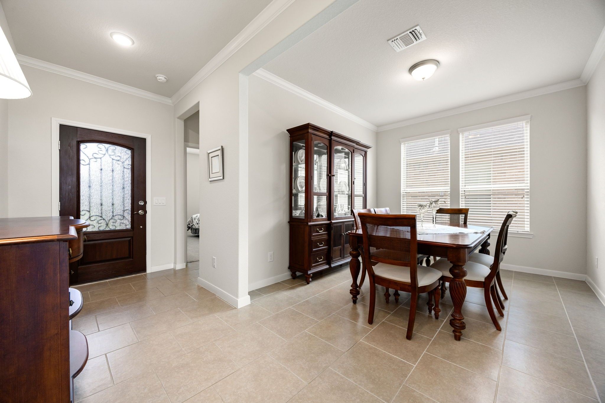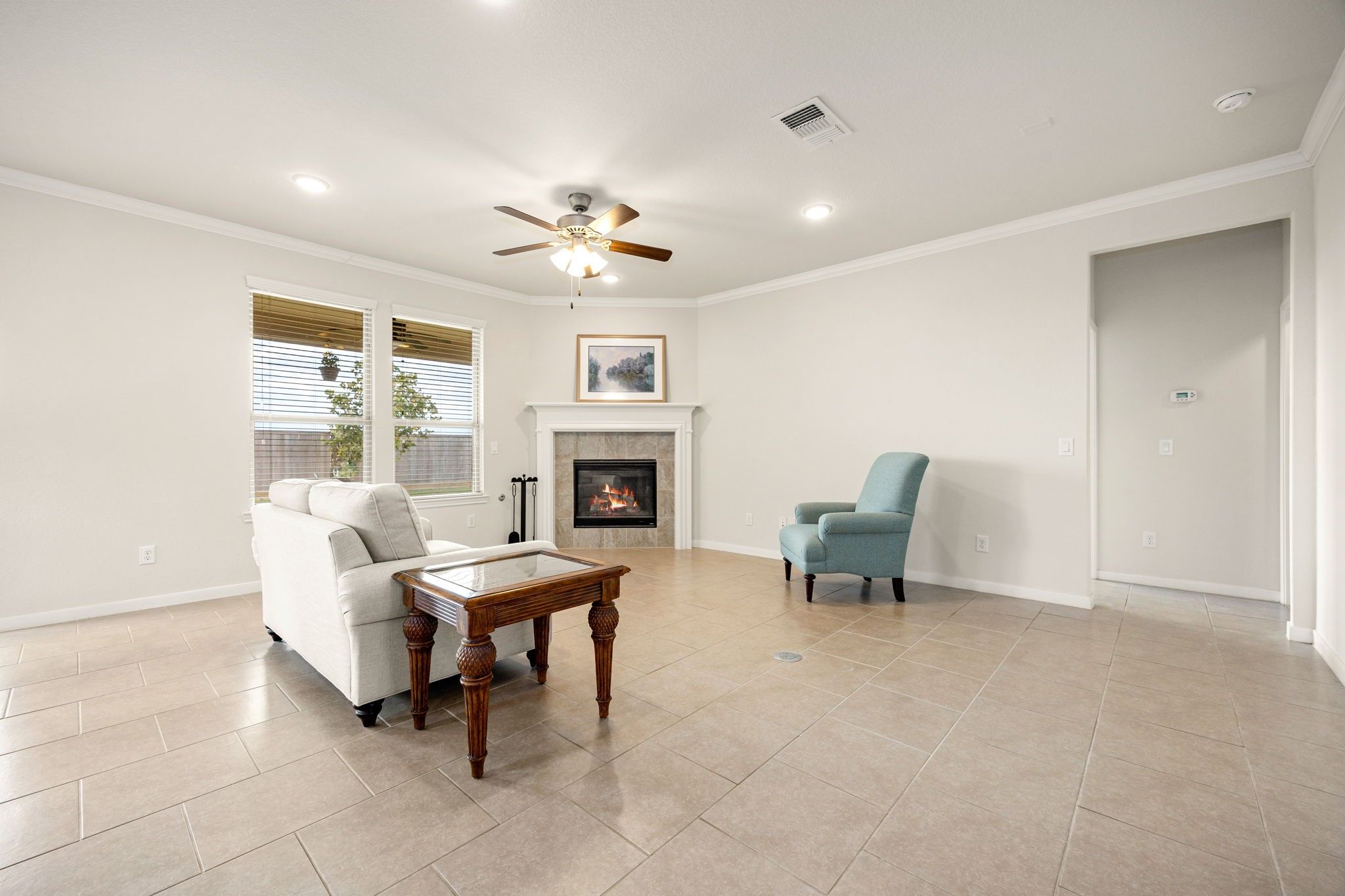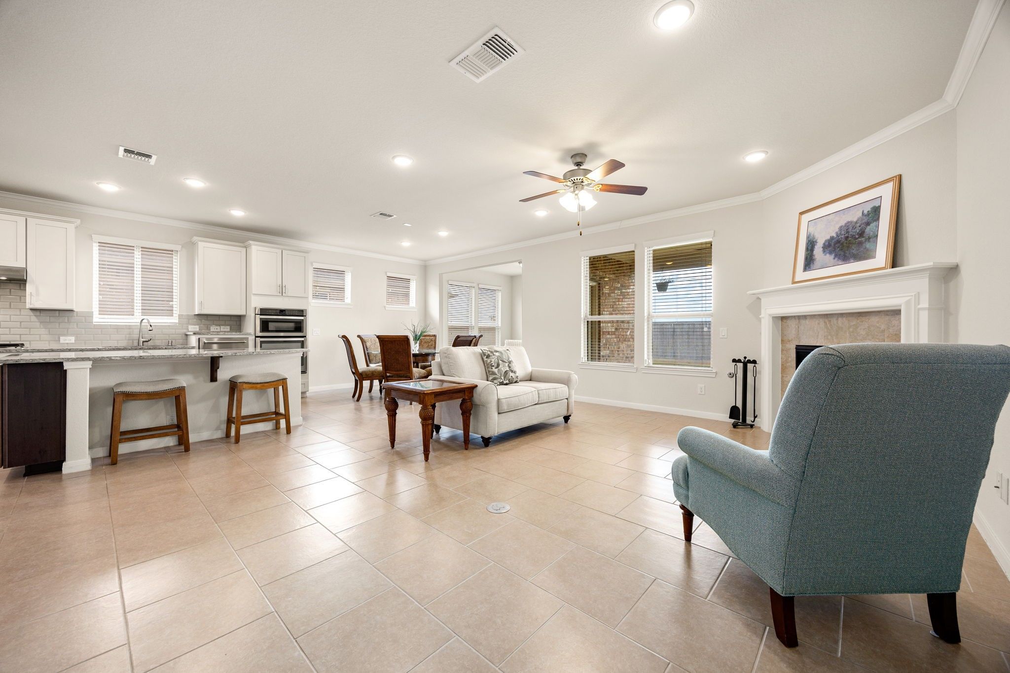 - Breakfast Bar, Crown Molding, Double Vanity, Entrance Foyer, Granite Counters, High Ceilings, Kitchen Island, Kitchen/Family Room Combo, Pantry, Tub Shower, Window Treatments, Ceiling Fan(s), Kitchen/Dining Combo, Programmable Thermostat