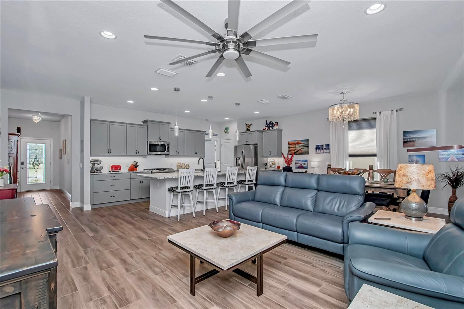 This Semi-Custom Shea Built home offers Superior Build Quality combined with $80k in additional upgrades and premier location across from the golf course on a spacious, association-maintained corner lot in the sought-after 55+ section. Experience resort-style living and minutes from WEC (World Equestrian Center), and downtown Ocala! Step inside to find a warm, inviting interior enhanced by wood-style porcelain tile flooring, designer lighting, and an open layout, 9 1/2 foot ceilings that blend comfort with contemporary elegance. The bedrooms feature new high-grade, pet-resistant carpet with an 8 lb. pad, offering both durability and softness. Large walk-in closet off master bath. Granite countertops run throughout the home, including the expanded laundry room, which adds convenience with extra cabinetry, an upgraded sink, built-in desk, and a reverse osmosis water dispenser. The guest bedroom provides a place for that special guest. Just off the foyer you will find the perfect space for an office/study. Stylish designer lighting including sleek pendants and sparkling crystal-inspired fixtures adds a touch of modern sophistication throughout the home. The large covered and fully screened lanai (85% UV protected) with a stylish tongue and groove ceiling provides a peaceful outdoor retreat, complete with coordinating porcelain tile flooring for maximum enjoyment. The extended paver patio and driveway enhance both appearance and functionality. Low-maintenance rock landscaping, flowering shrubs, and solar landscape lighting elevate curb appeal year-round. Additional upgrades include a whole-house ECO water softening system, 3M window tinting for energy efficiency, gutters, and a whole-house Generac generator for added peace of mind. The garage offers exceptional storage with approximately 230 sq ft of overhead racks. HOA amenities add exceptional value, covering lawn and landscape maintenance (including irrigation water and system upkeep), high-speed fiber-optic internet, and access to an impressive array of recreational options. Gated community access. Residents enjoy walking/biking trails, a state-of-the-art fitness center with group classes, multiple pools with poolside food and beverage service, a lakeside dock, kayaks, canoes, paddle boat, tennis, pickleball, bocce, horseshoe pits, a fenced dog park, outdoor fitness zone, and a rubberized walking circuit. The on-site restaurant/bar and spa offer convenience and resident discounts, while golf is available pay-to-play with no membership fees offering organized golfing events and community events through the on-site activities director. This home blends comfort, style, and an amenity-rich lifestyle truly a standout opportunity in this thriving golf cart community. NO CDD FEES!