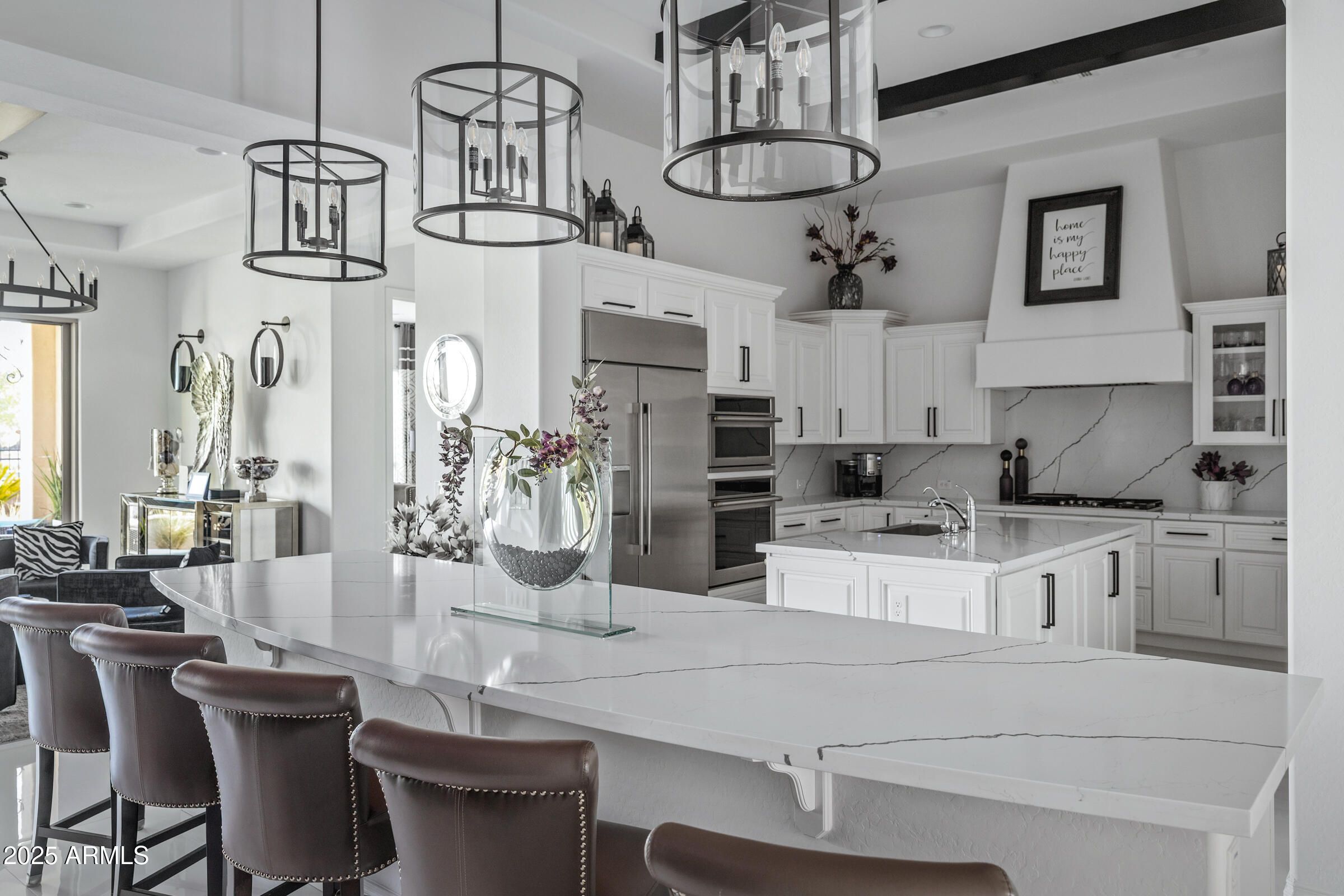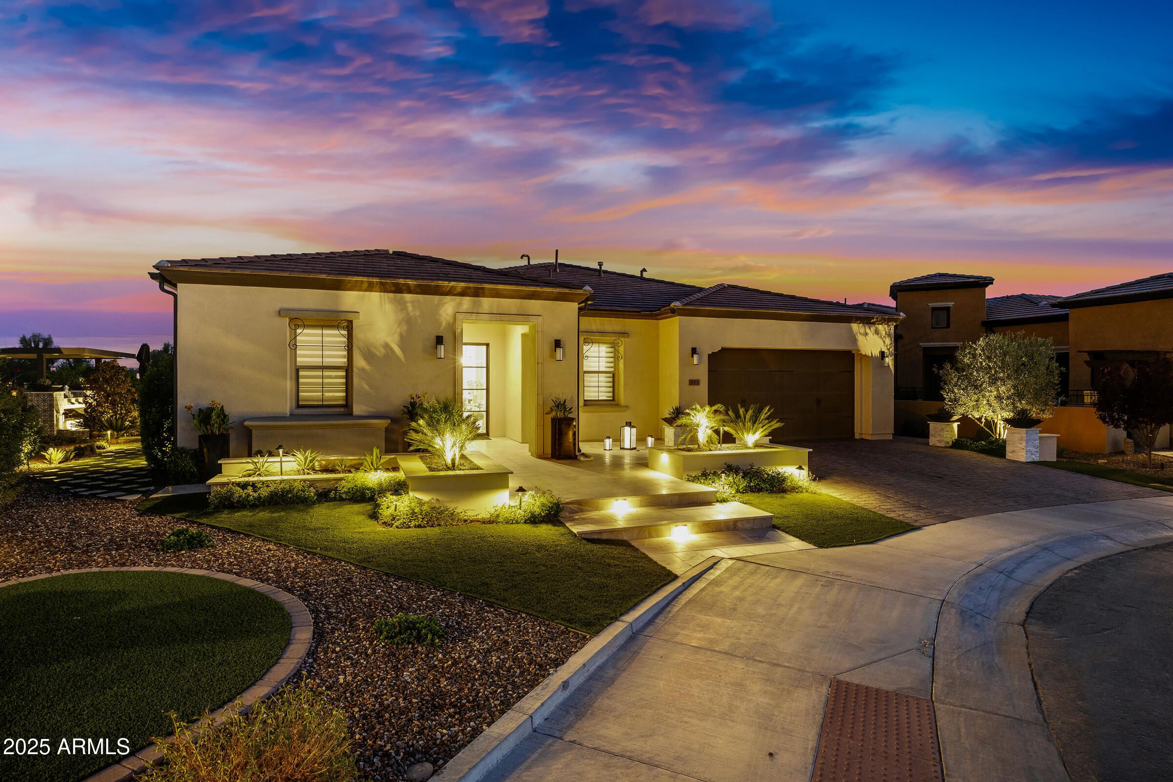Discover unmatched elegance and privacy in this fully remodeled home with over $500,000 in upgrades, located on one of the most premier lots in the guard-gated Encanterra Country Club. With no neighbors behind, and panoramic views, this residence offers true resort-style living. Step inside to soaring 14-foot ceilings with custom beams, Alaskan porcelain tile, and designer finishes throughout. The chef's kitchen features Monogram appliances, dual refrigerators, wine/beverage coolers, and custom cabinetry with LED lighting. A striking marble entertainment wall and 5.1 surround system set the stage for incredible gatherings. The primary suite is a private retreat with spa-inspired finishes, while the backyard transforms into an entertainer's dream—featuring a 16x16 pergola, outdoor kitchen, water and fire features, and a 16-foot glass wall for seamless indoor-outdoor living. Additional highlights include a designer office, custom lighting, custom racedeck garage floors with golf cart parking, and whole-home sound. Turnkey, modern, and one-of-a-kindthis Encanterra gem is ready to impress.