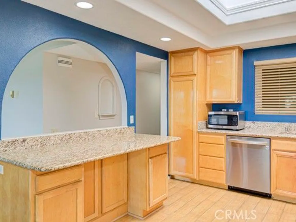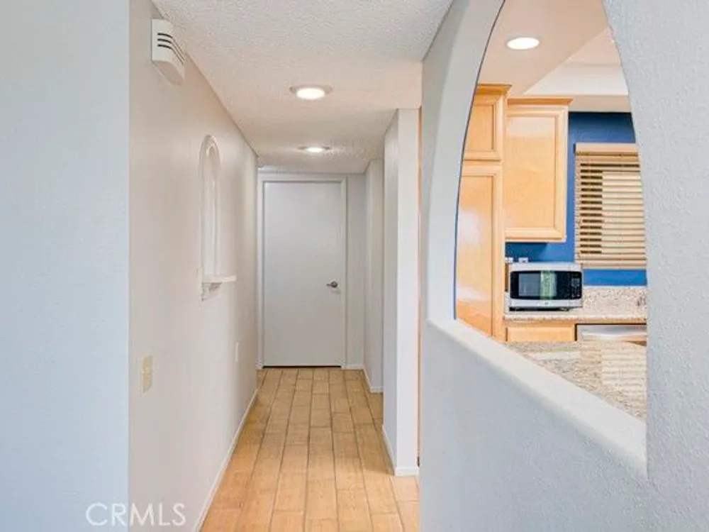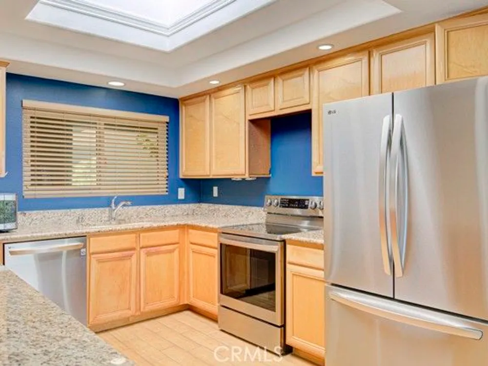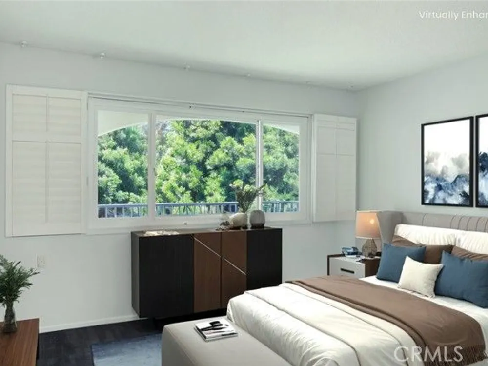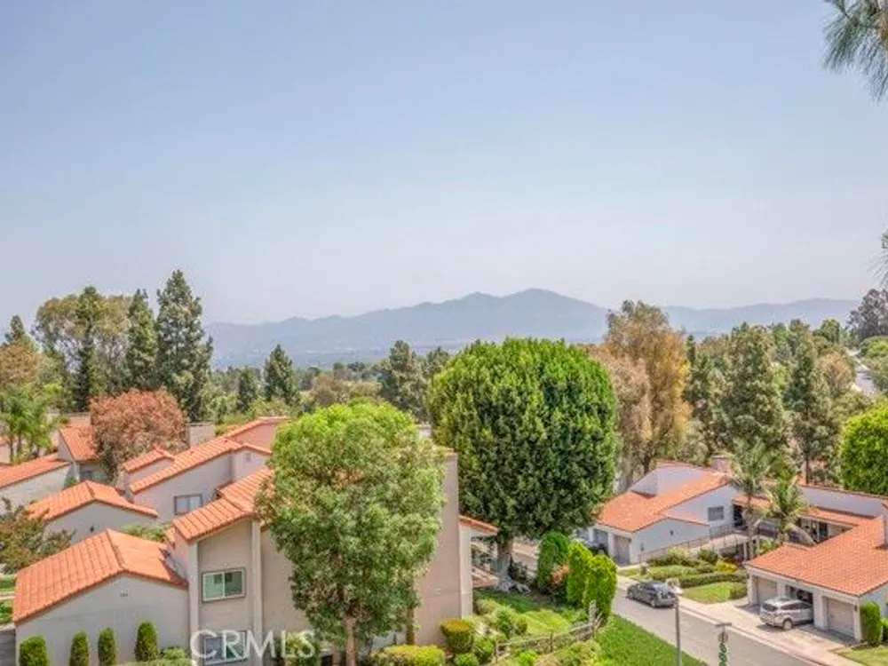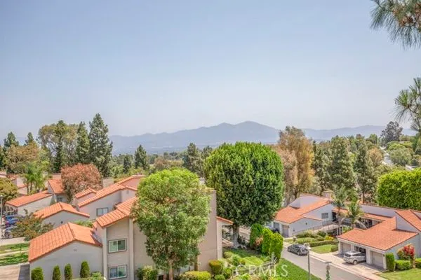 EXPERIENCE THIS HOME BY CLICKING ON THE 360's - An elevator takes you practically to the front door of this beautifully upgraded, top floor VILLA NUEVA model, with oh, what a view! This home is perched atop a hill, surrounded by trees and greenery. Enjoy vistas of the neighborhood, valley lights and Saddleback Mountain, and nearby access to the 73 Toll Road. The heart of the home — an extraordinary, transformed kitchen — features custom cabinetry topped with luxurious slab granite and high-quality LG appliances. A rare skylight fills the space with natural light. Elegant ceramic tile floors mimic wood while offering water resistance. An ingenious bar under the arched opening connects the kitchen to the living room — perfect for a casual bite or storing large serving pieces. The kitchen opens to the dining area and living room, making entertaining easy. The dining room’s mirrored wall reflects the sweeping view through large glass doors, drawing your eye outdoors to the serene neighborhood and trees below. The generous living room features lush slate-gray carpet with extra-thick padding and a large dual-paned window that frames the view and welcomes coastal breezes. A central hallway leads from the front door through the main living areas, and in the opposite direction to bedrooms and bathrooms. The guest bedroom offers a peaceful view of the trees through dual-pane windows with plantation shutters, plush carpet, a large closet, and space for a queen-sized bed. The adjacent guest bathroom features a vanity, tub with newer shower door and fixtures. Welcome to the Primary Suite — your retreat. Large windows showcase serene views and plantation shutters allow you to control the light. The spacious bedroom easily fits a king-sized bed and large furniture. The Primary Bathroom features a double-sink vanity and step-in shower with updated glass doors. Behind the building, you’ll find lush, HOA-maintained park-like landscaping. Ownership includes access to Laguna Woods Village’s resort-style amenities:100+ basic cable channels, water, sewer, trash included, Two golf courses: 27-hole championship and 9-hole par-3, Seven clubhouses, five pools, three fitness centers, 250+ clubs and social groups, Fare-free bus to shopping, dining, medical. ll of this — just 6 miles from world-renowned Laguna Beach with easy access to the 73 Toll Road, 5, and 405 freeways. Enjoy the exceptional lifestyle that is Laguna Woods Village!