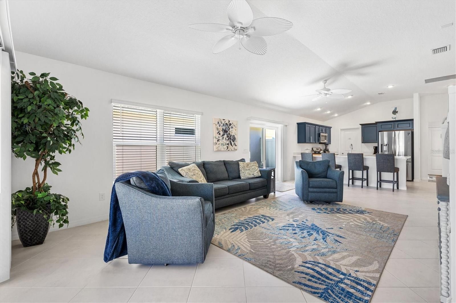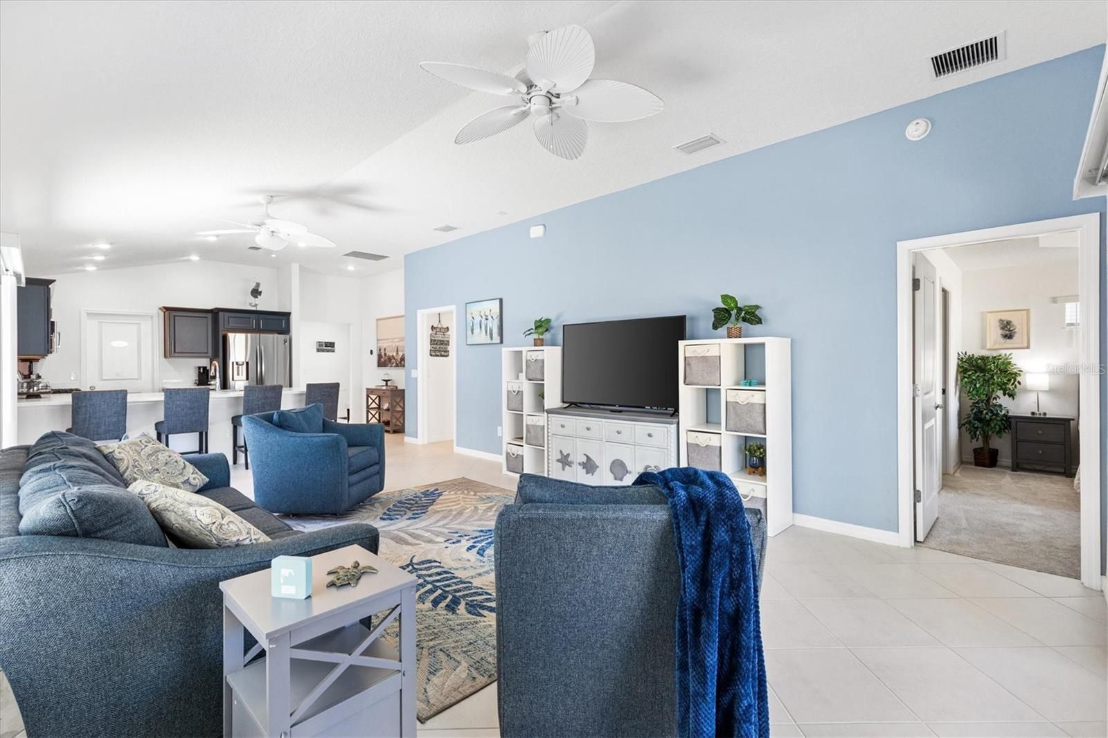 - Ceiling Fan(s), Kitchen/Family Room Combo, Open Floorplan, Main Level Primary, Split Bedrooms, Thermostat, Tray Ceiling(s), Vaulted Ceiling(s)