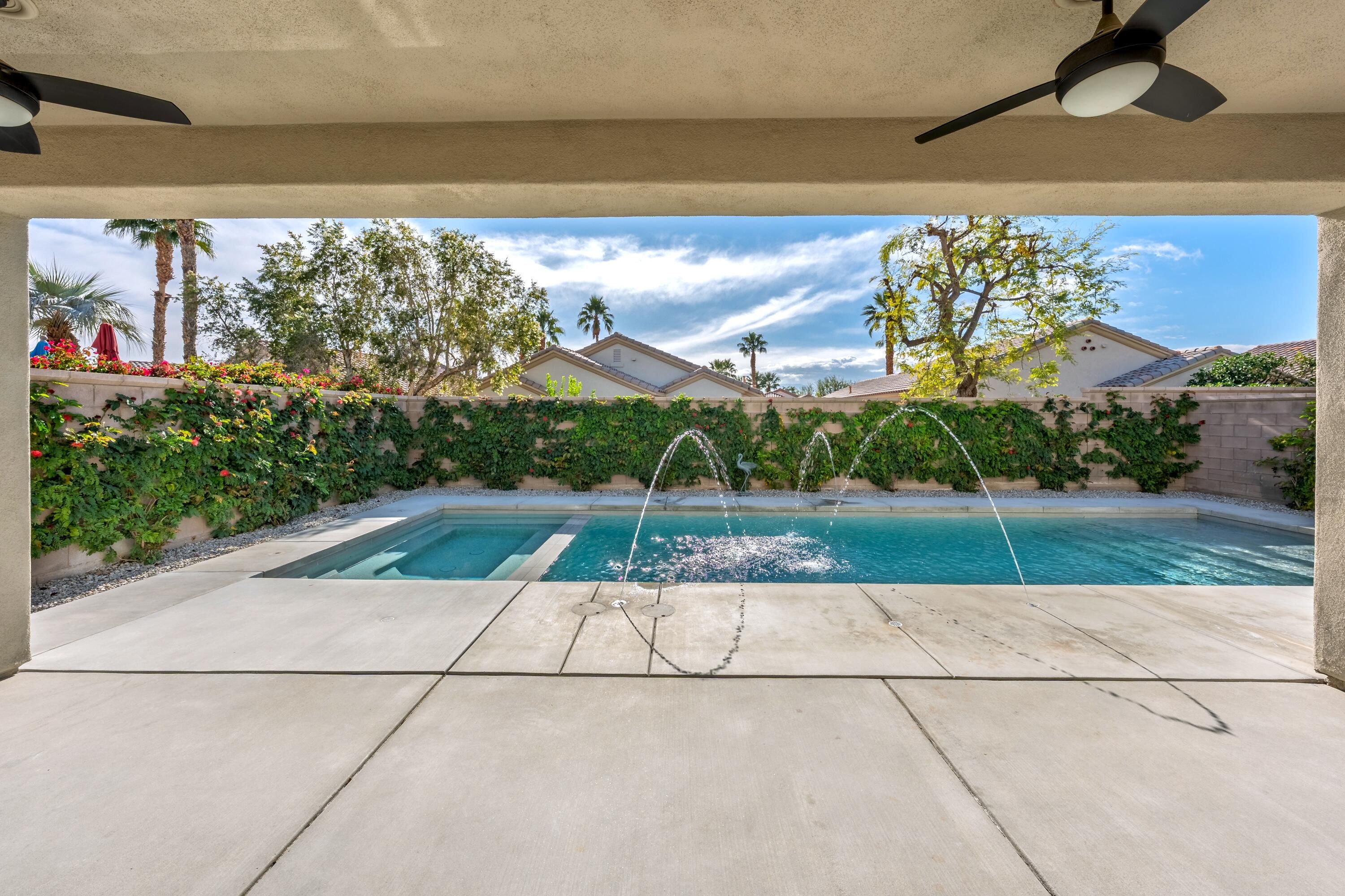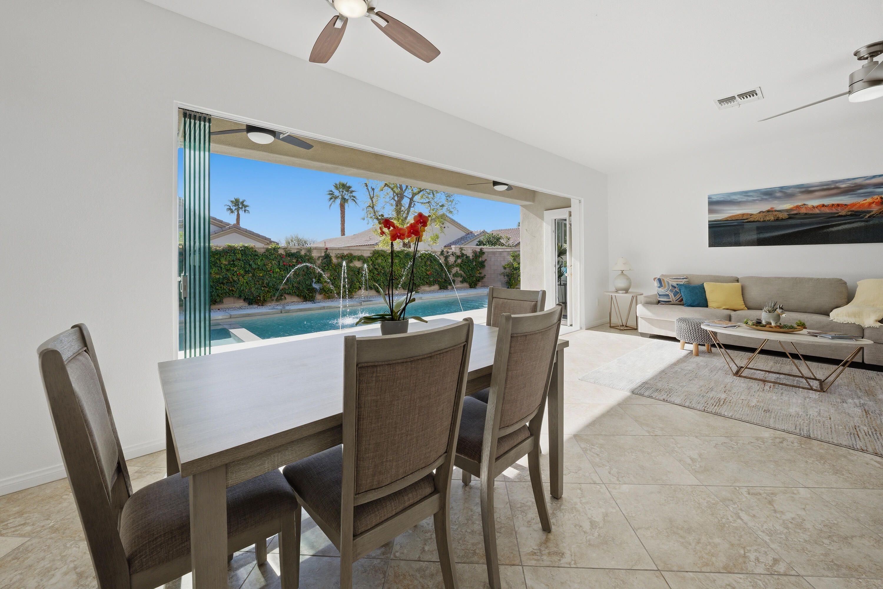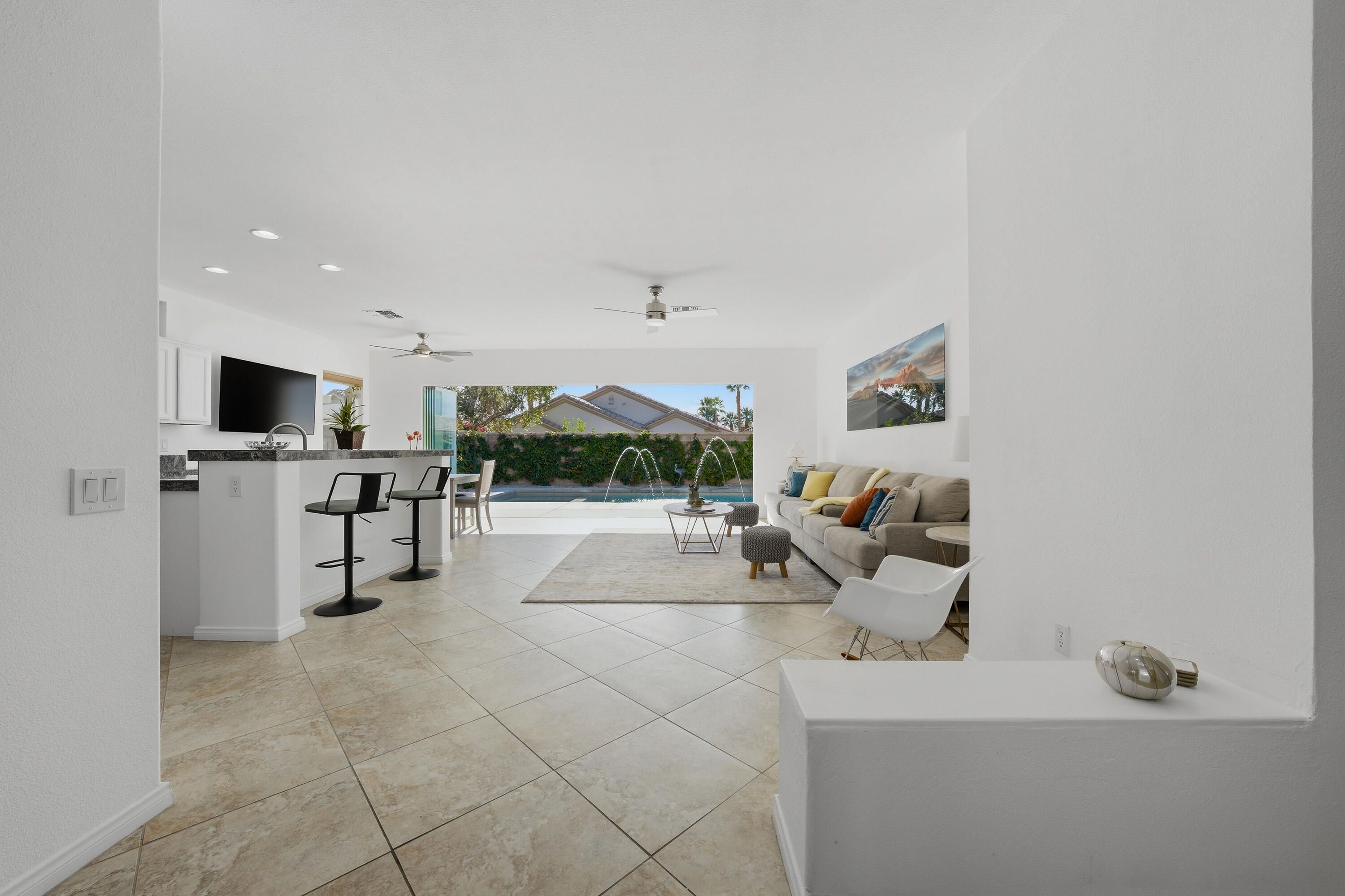 Sun City Palm Desert - Cayman. This popular greatroom home has been transformed into a private resort, featuring a stunning pebbletec pool and spa, a south facing rear yard with peekaboo mountain views, a spacious patio, and a folding glass panel wall that creates a seamless indoor-outdoor living experience. Upgraded windows, HVAC, and owned solar enhance comfort and efficiency. Inside, 20-inch tile flooring runs throughout the home—no carpeting. The upper portion of the wall between the greatroom and hallway has been removed, creating a more open, spacious feel. The kitchen is well appointed with granite countertops, stainless steel appliances, under-cabinet lighting, a chef's island, and a breakfast bar. Double pocket-doors off the greatroom open to a versatile den or office. The primary suite offers direct patio access and a walk-in closet with built-in storage. The en-suite bath includes dual sinks and a stall shower with textured glass doors. The guest bathroom features a tub/shower combination. The garage is finished with an epoxy floor, hanging rack storage, and a utility sink.