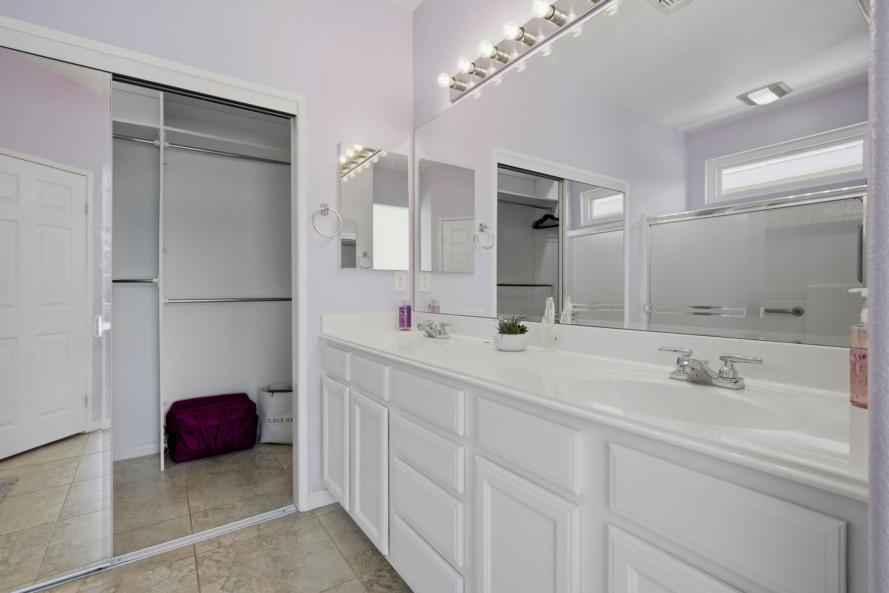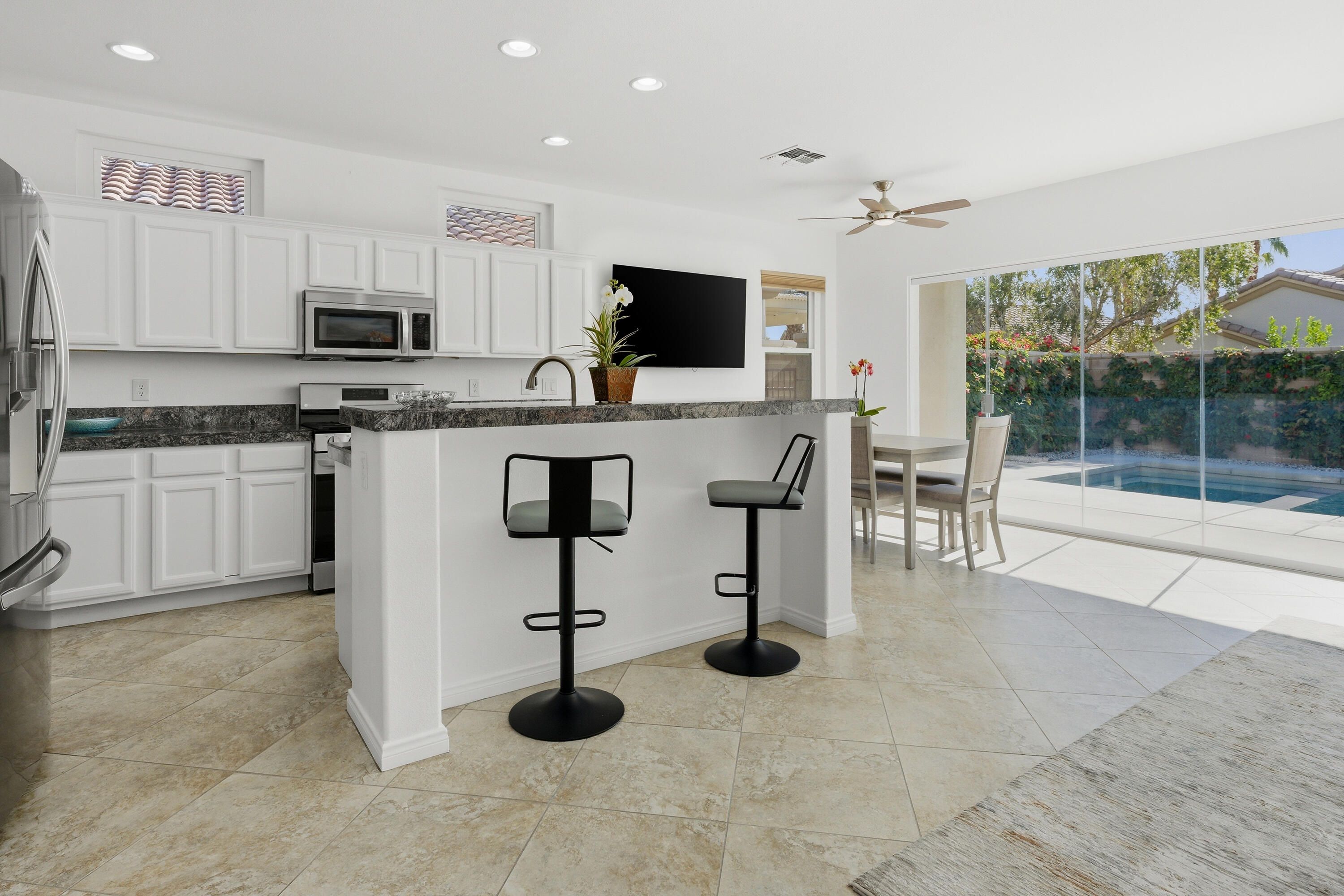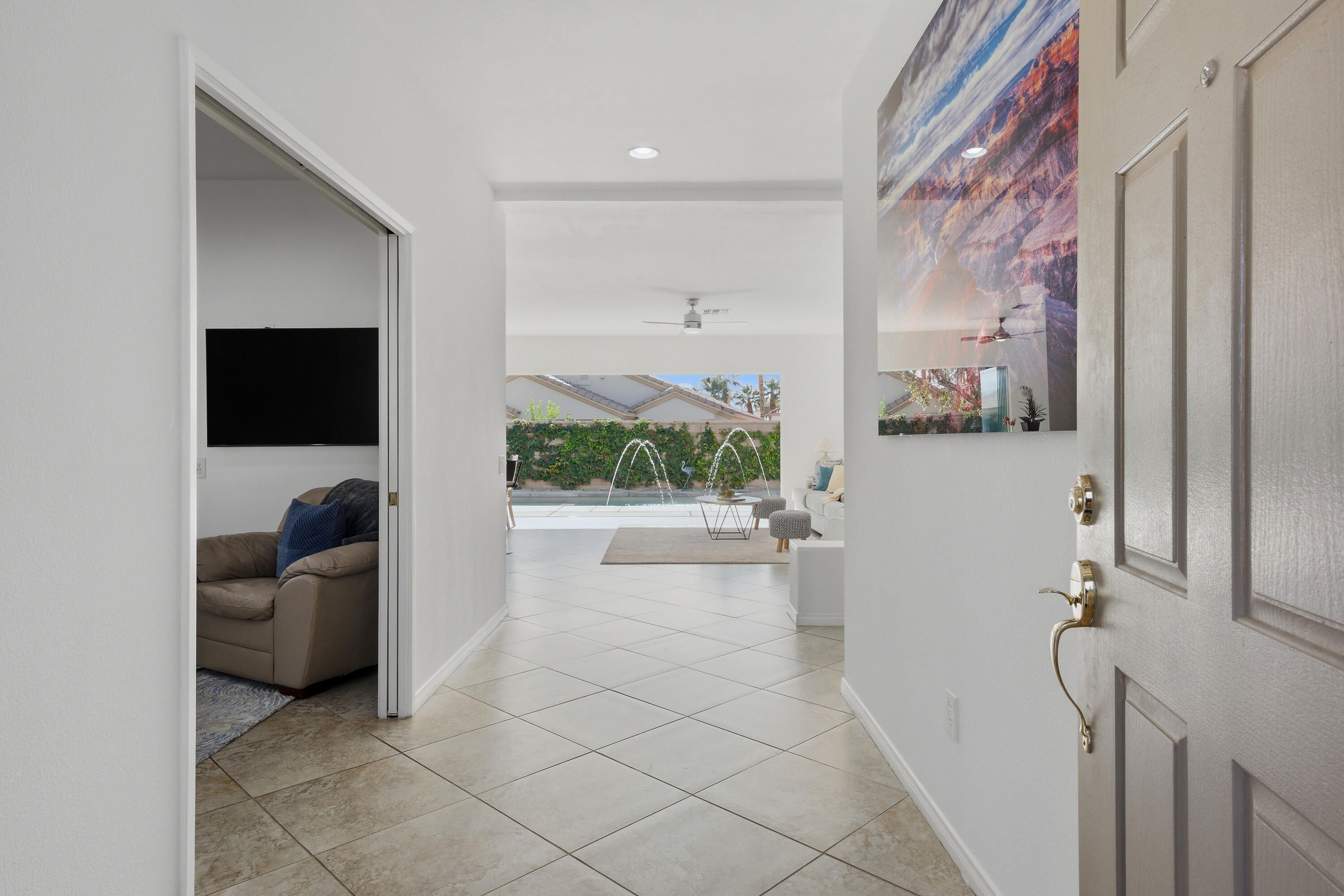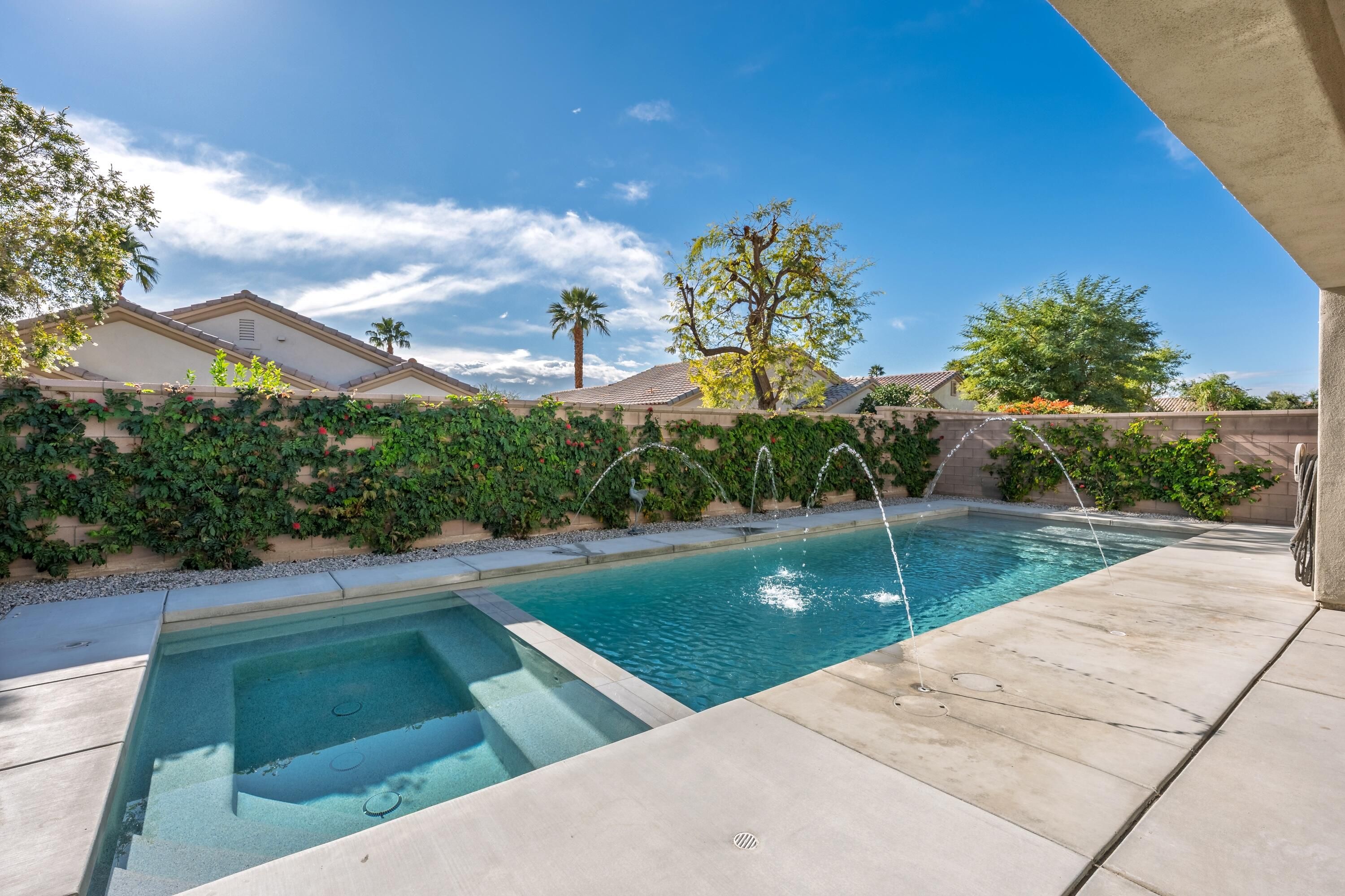 Sun City Palm Desert - Cayman. This popular greatroom home has been transformed into a private resort, featuring a stunning pebbletec pool and spa, a south facing rear yard with peekaboo mountain views, a spacious patio, and a folding glass panel wall that creates a seamless indoor-outdoor living experience. Upgraded windows, HVAC, and owned solar enhance comfort and efficiency. Inside, 20-inch tile flooring runs throughout the home—no carpeting. The upper portion of the wall between the greatroom and hallway has been removed, creating a more open, spacious feel. The kitchen is well appointed with granite countertops, stainless steel appliances, under-cabinet lighting, a chef's island, and a breakfast bar. Double pocket-doors off the greatroom open to a versatile den or office. The primary suite offers direct patio access and a walk-in closet with built-in storage. The en-suite bath includes dual sinks and a stall shower with textured glass doors. The guest bathroom features a tub/shower combination. The garage is finished with an epoxy floor, hanging rack storage, and a utility sink.