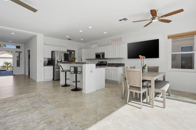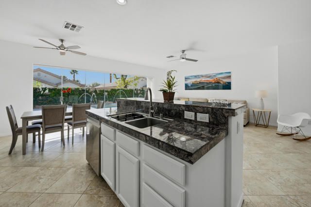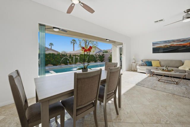 Sun City Palm Desert - Cayman. This popular greatroom home has been transformed into a private resort, featuring a stunning pebbletec pool and spa, a south facing rear yard with peekaboo mountain views, a spacious patio, and a folding glass panel wall that creates a seamless indoor-outdoor living experience. Upgraded windows, HVAC, and owned solar enhance comfort and efficiency. Inside, 20-inch tile flooring runs throughout the home--no carpeting. The upper portion of the wall between the greatroom and hallway has been removed, creating a more open, spacious feel. The kitchen is well appointed with granite countertops, stainless steel appliances, under-cabinet lighting, a chef's island, and a breakfast bar. Double pocket-doors off the greatroom open to a versatile den or office. The primary suite offers direct patio access and a walk-in closet with built-in storage. The en-suite bath includes dual sinks and a stall shower with textured glass doors. The guest bathroom features a tub/shower combination. The garage is finished with an epoxy floor, hanging rack storage, and a utility sink.
