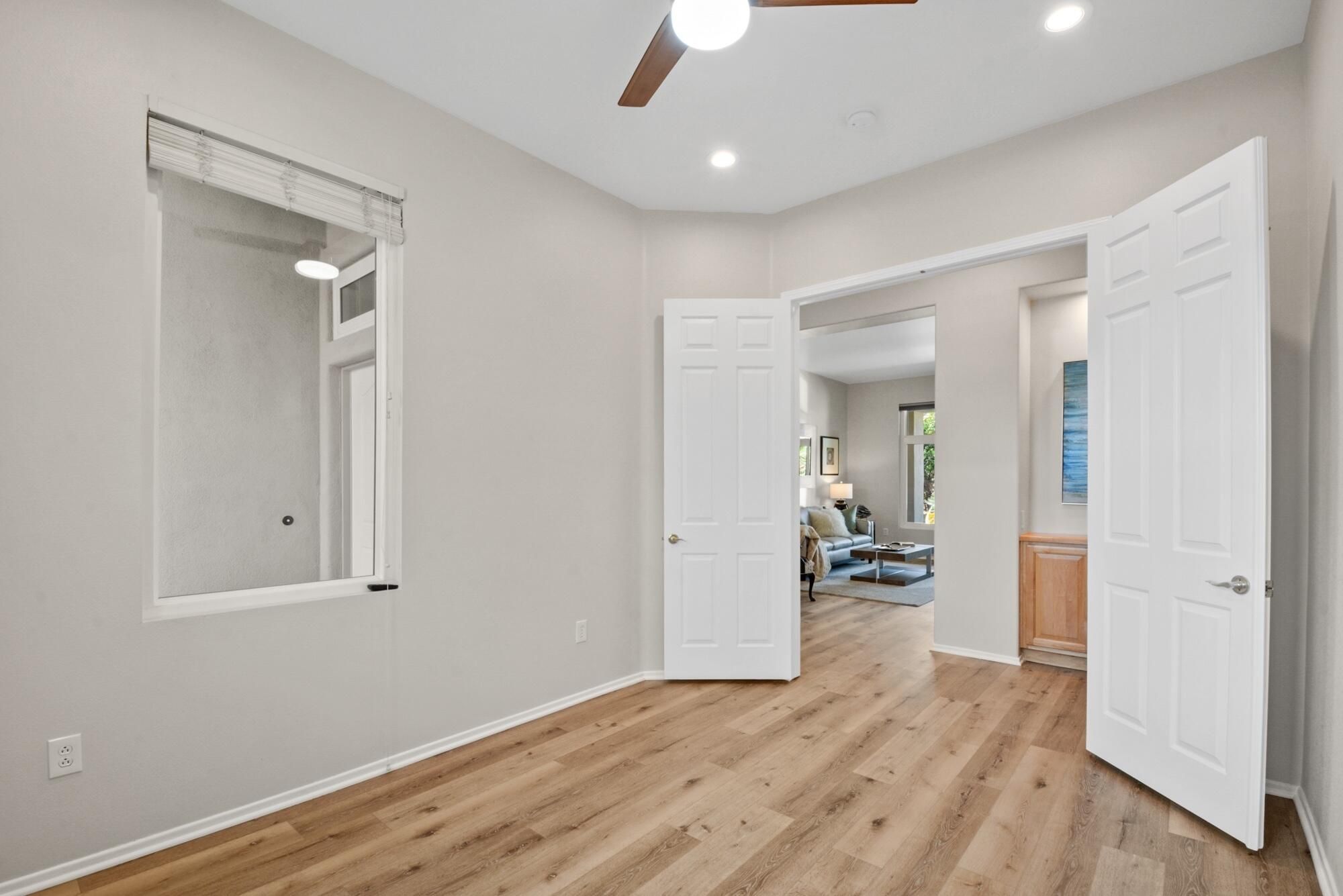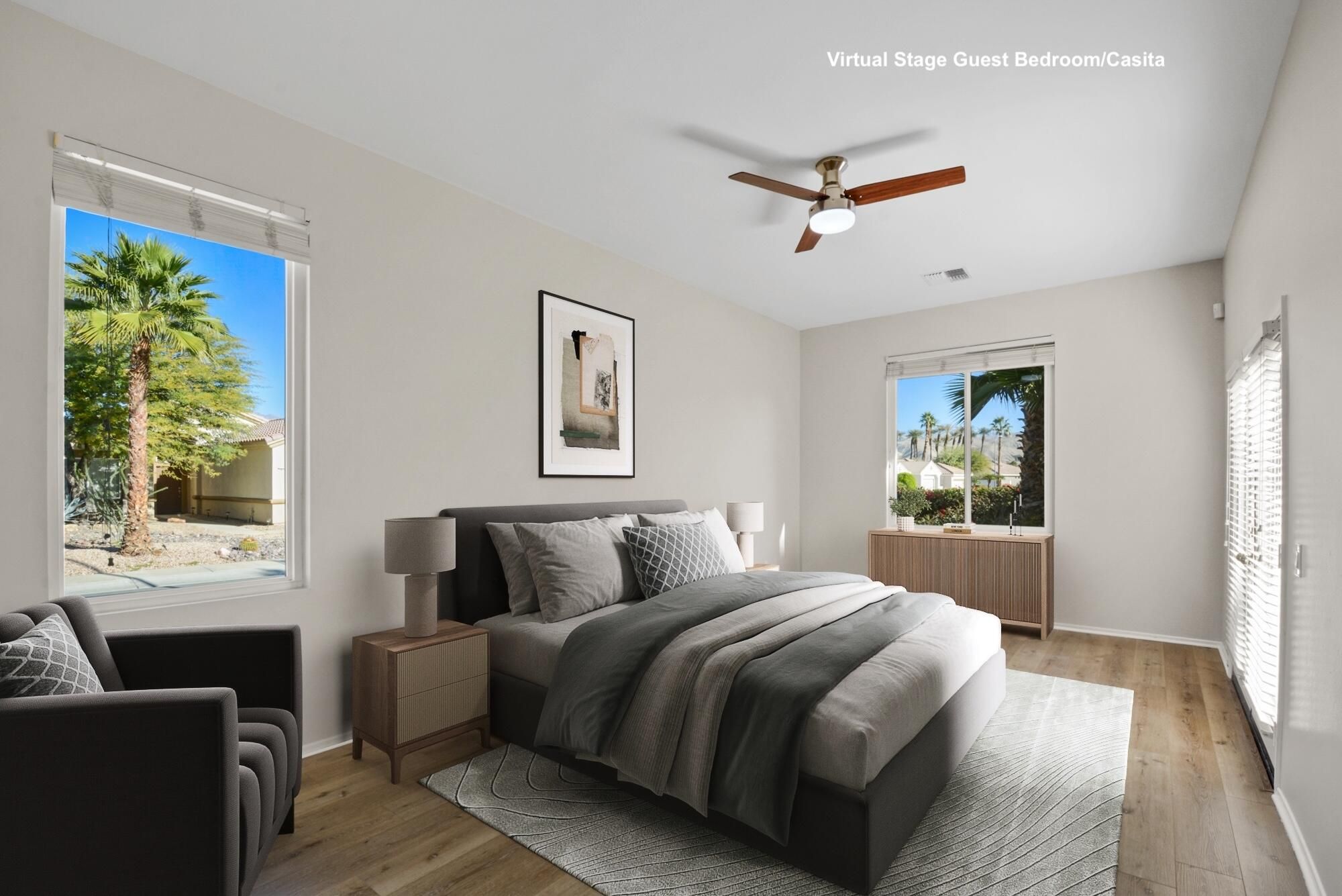 Sun City Palm Desert Home located in the North Section on a premium corner lot with mountain views from the kitchen/dining area and guest bedroom. Interior refresh completed with new flooring throughout, paint & new appliances. Seller replaced all original windows dual paned windows. Primary shower remodeled. Beautiful, light & bright Tangier floor plan with the optional Extended guest room, bay window. Extended garage. 2 bedroom (casita) plus flex room for den or bedroom. Enclosed front Courtyard and front walkway upgraded with easy care stone look coating. Extended garage has extensive storage in custom cabinetry and overhead Storage. Close to the Lake View Clubhouse. Ready now for your enjoyment of the Sun City lifestyle with extensive amenities offering fabulous amenities of resort style Dining, Pools, Spas, Putting Course & Fitness Center, all at a reasonable monthly association fee.