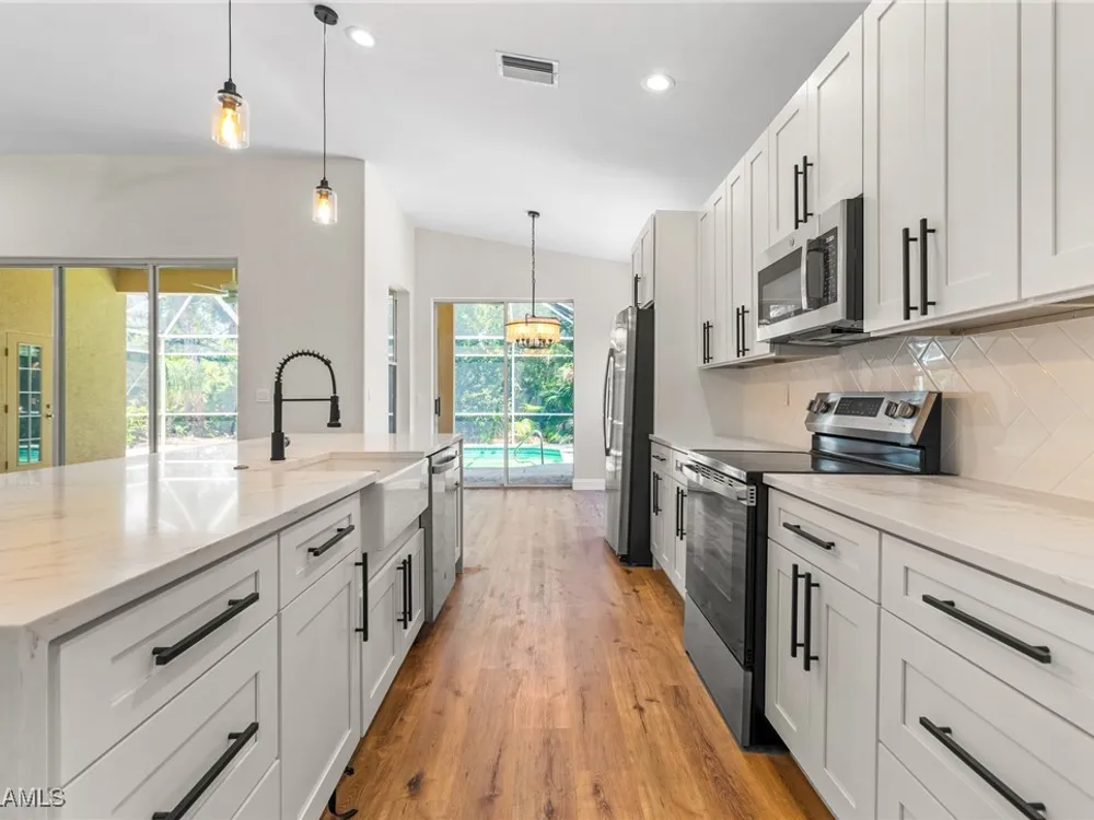 Wow! Looking for a remolded home in Bonita Springs This single-family home with your own private pool and two car garage on a cul-de-sac in Heron Cove at Pelican Landing. This home has 3 bedrooms with an open floor plan and vaulted ceilings. Enjoy the rear southeast exposure with great morning and midday sun. Pelican Landing amenities include gated security, community center with planned social activities, professional fitness center, 12 Har-Tru tennis courts, 6 pickleball courts, Bocce, canoe/kayak park, marina w/ boat slips, sailing center w/ boats, butterfly garden, fishing pier, children's play park, and a private 34-acre island gulf beach park serviced by PL shuttle boats. Optional golf memberships are available at 36-hole Pelican's Nest Golf Club.