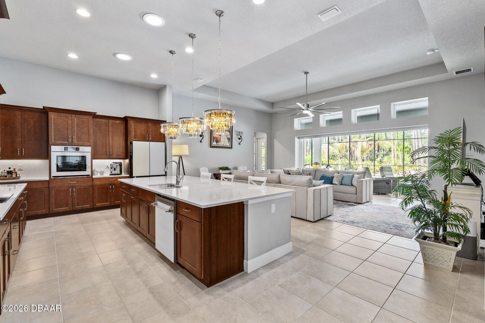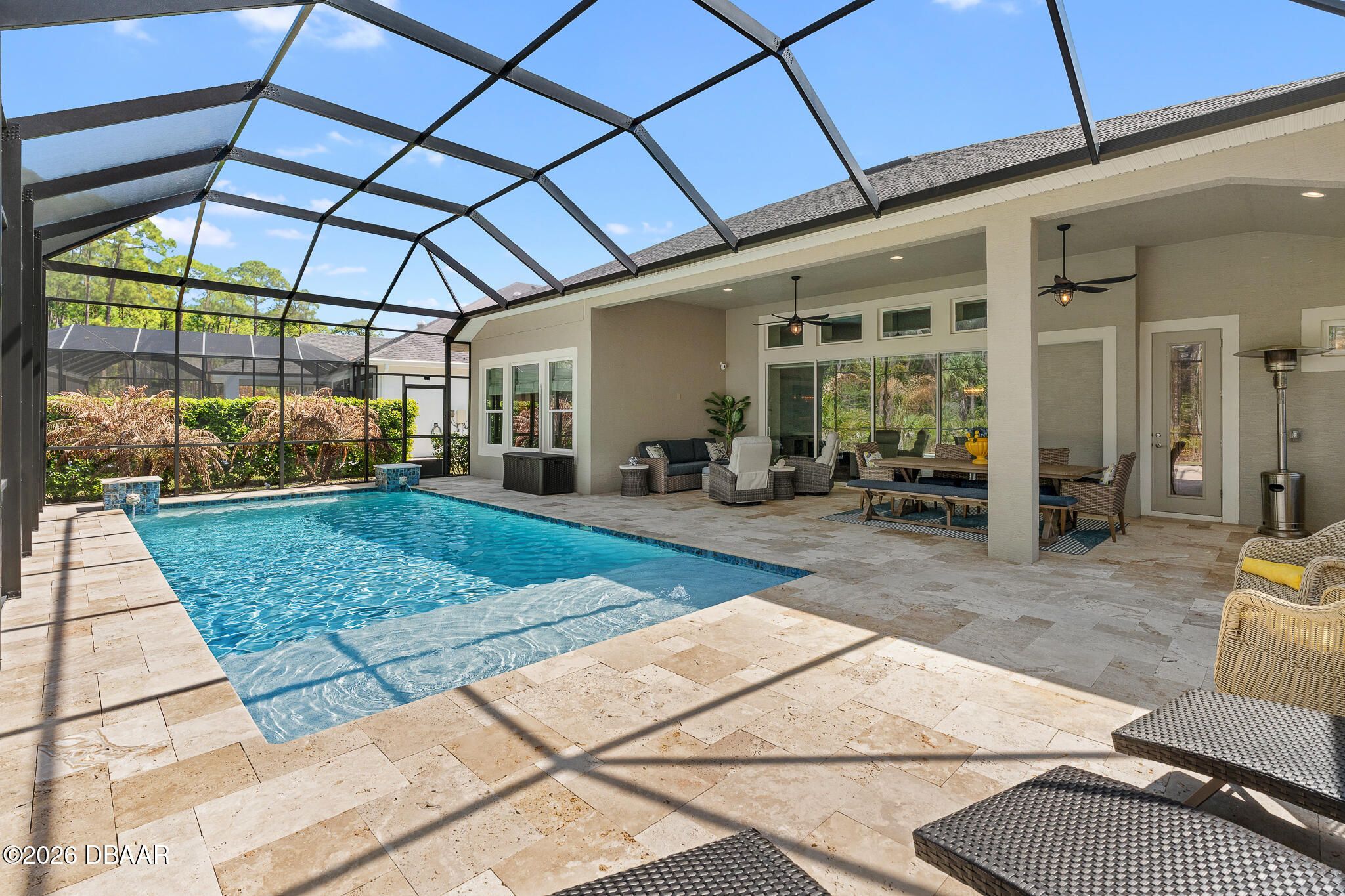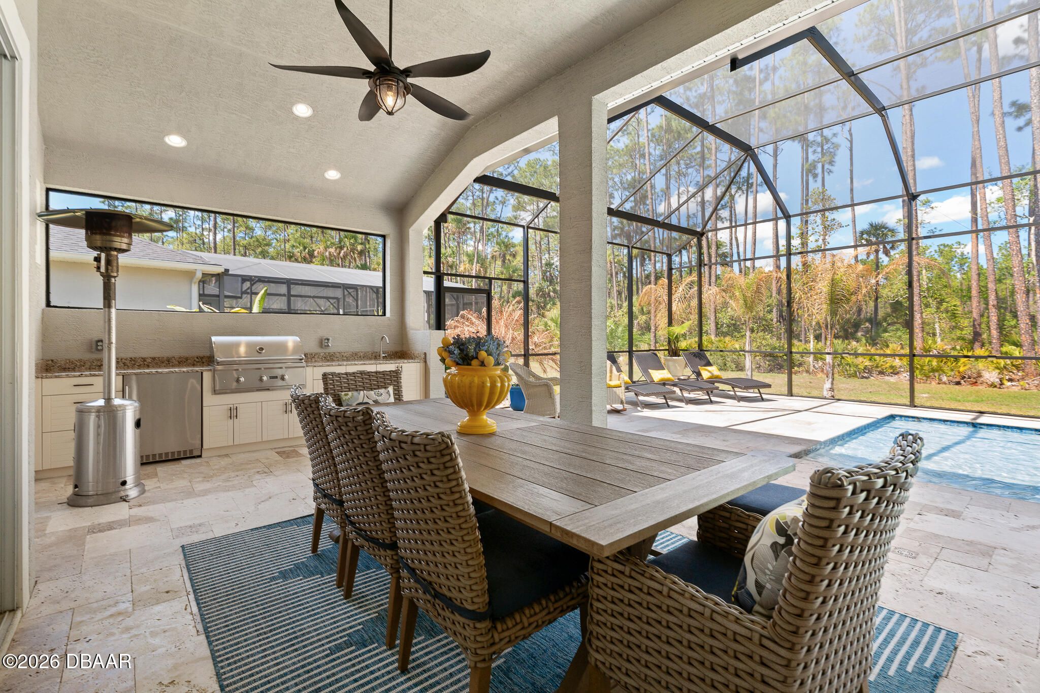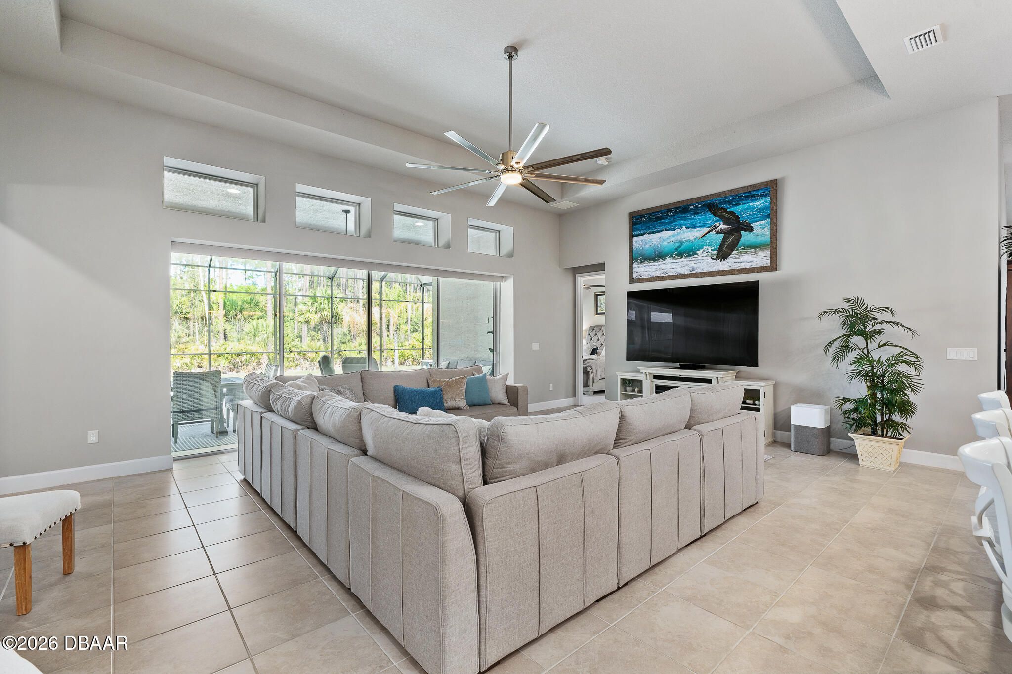 Welcome to 352 Stirling Bridge Drive, an exceptional residence showcasing the highly sought-after Costa Mesa floor plan with the rare and desirable guest suite configuration, offering a level of flexibility and comfort not commonly found in this model. Designed with a timeless Mediterranean-inspired exterior and enhanced with numerous upgrades, this home features 3 bedrooms, 3 full bathrooms, and a spacious 3-car garage complete with overhead storage racks and a whole-house water filtration and softening system. With two suite-style bedrooms, the layout is ideal for accommodating guests, extended family, or multi-generational living while maintaining privacy for everyone. Upon entering the home, you are welcomed by an open flex space to the left, perfect for a home office, den, library, or additional sitting area, while to the right you will find the generously sized guest suite, designed to feel like a second owner's retreat. This private space is filled with natural light from multiple windows and includes its own full bathroom with walk-in shower, large vanity, and an oversized walk-in closet, creating a comfortable and inviting environment for visitors or family members. As you continue into the main living area, the design that has made the Costa Mesa an award-winning floor plan truly comes to life. The expansive great room, dining area, and chef's kitchen blend seamlessly together, creating the perfect setting for both everyday living and entertaining. The kitchen is highlighted by high-end Samsung appliances, a hidden pantry with custom shelving, abundant cabinetry, and an impressive, oversized island measuring approximately eleven feet wide, providing ample space for dining, serving, and gathering. The owner's suite is privately positioned at the rear of the home and offers beautiful views of the pool and outdoor living area through large windows that bring in natural light throughout the day. The en-suite bathroom features a spacious walk-in shower, dual vanities, and a customized walk-in closet with built-in storage designed for both function and style. On the opposite rear side of the home, the third bedroom is tucked away for added privacy and is located next to a full bathroom that also serves as a convenient pool bath, making it ideal for guests and outdoor entertaining. One of the standout features of this home is the seamless transition to the outdoor living space. The great room showcases 12-foot ceilings and a wide pocketing sliding glass door that opens fully to the expanded covered lanai and screened pool enclosure, creating a true indoor-outdoor lifestyle. The saltwater pool was thoughtfully designed with decorative fountains, upgraded travertine decking, and generous space for relaxing or entertaining. The fully built-out summer kitchen includes a refrigerator, propane grill, sink, granite countertops, and upgraded outdoor cabinetry, making this space perfect for enjoying Florida living year-round. Additional enhancements throughout the home include solar tubes for added natural light, upgraded lighting fixtures and designer ceiling fans, enhanced landscaping with decorative rock beds, upgraded carpeting in the owner's suite, and a UV light enhancement installed in the HVAC system for improved air quality. This home is located within the gated and golf-cart-friendly community of Plantation Bay Golf & Country Club, where residents enjoy optional membership opportunities featuring 45 holes of championship golf, multiple clubhouses, tennis and pickleball courts, resort-style and lap pools, a fitness and spa center, and an active social calendar. Buyers of this home may also be eligible for a substantial discount on the club's initiation fee, please contact the listing agent for details.