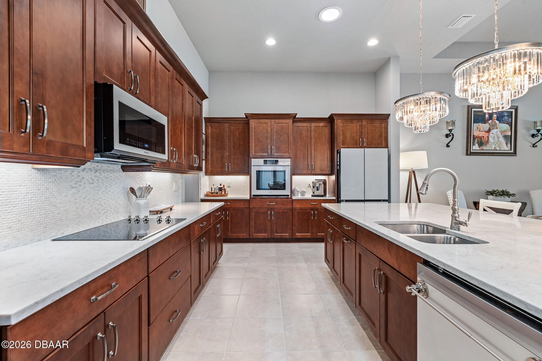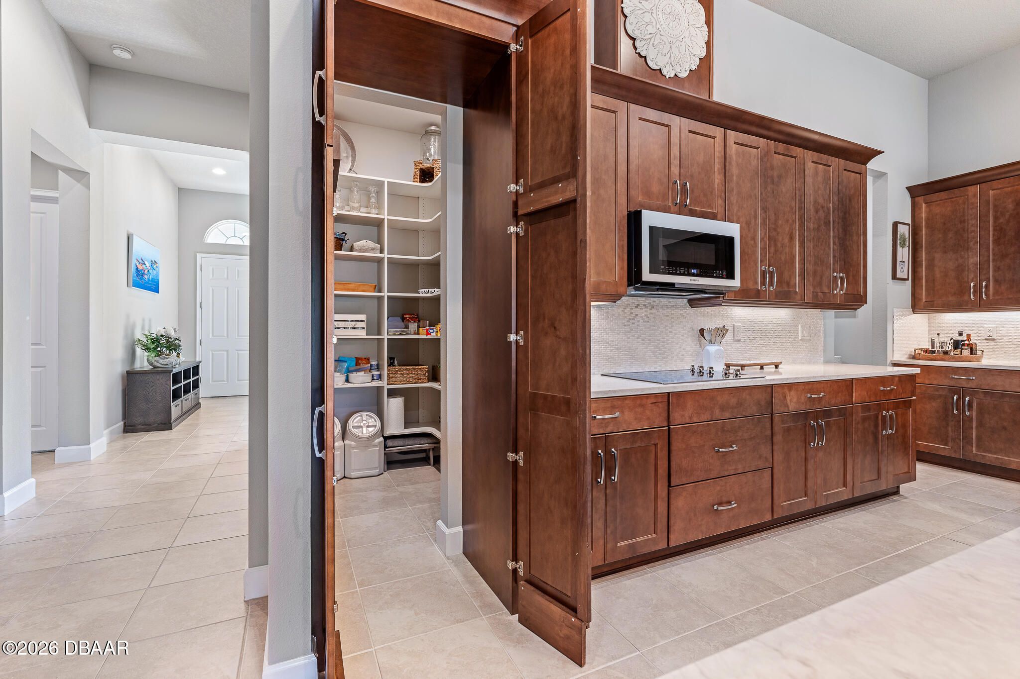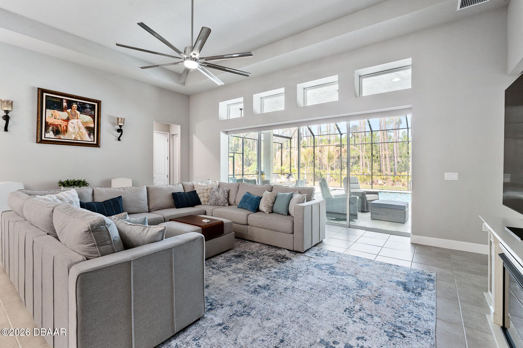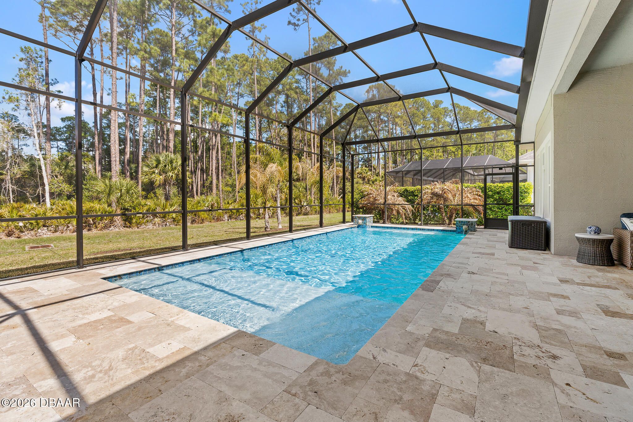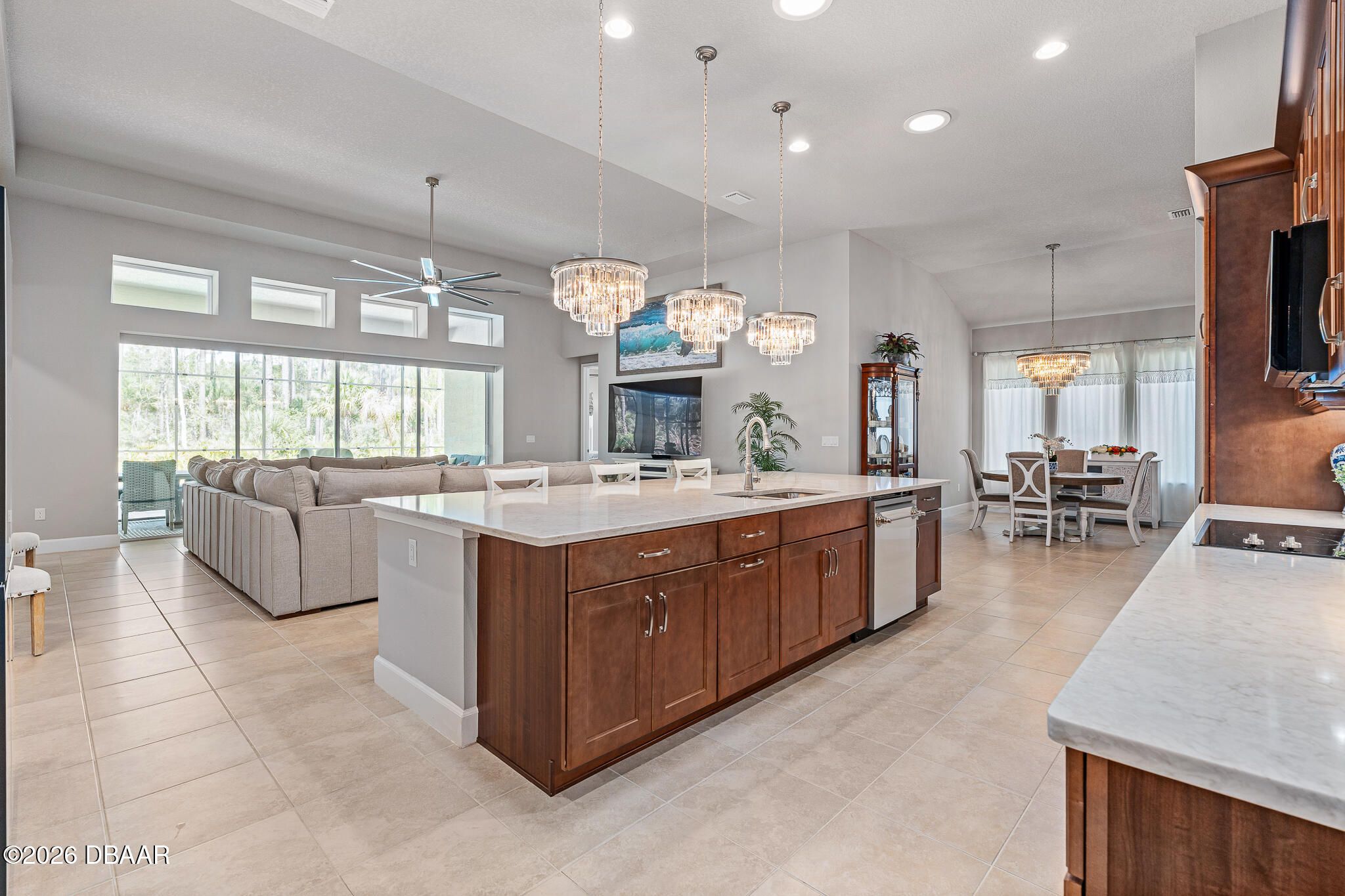Welcome to 352 Stirling Bridge Drive, an exceptional residence showcasing the highly sought-after Costa Mesa floor plan with the rare and desirable guest suite configuration, offering a level of flexibility and comfort not commonly found in this model. Designed with a timeless Mediterranean-inspired exterior and enhanced with numerous upgrades, this home features 3 bedrooms, 3 full bathrooms, and a spacious 3-car garage complete with overhead storage racks and a whole-house water filtration and softening system. With two suite-style bedrooms, the layout is ideal for accommodating guests, extended family, or multi-generational living while maintaining privacy for everyone. Upon entering the home, you are welcomed by an open flex space to the left, perfect for a home office, den, library, or additional sitting area, while to the right you will find the generously sized guest suite, designed to feel like a second owner's retreat. This private space is filled with natural light from multiple windows and includes its own full bathroom with walk-in shower, large vanity, and an oversized walk-in closet, creating a comfortable and inviting environment for visitors or family members. As you continue into the main living area, the design that has made the Costa Mesa an award-winning floor plan truly comes to life. The expansive great room, dining area, and chef's kitchen blend seamlessly together, creating the perfect setting for both everyday living and entertaining. The kitchen is highlighted by high-end Samsung appliances, a hidden pantry with custom shelving, abundant cabinetry, and an impressive, oversized island measuring approximately eleven feet wide, providing ample space for dining, serving, and gathering. The owner's suite is privately positioned at the rear of the home and offers beautiful views of the pool and outdoor living area through large windows that bring in natural light throughout the day. The en-suite bathroom features a spacious walk-in shower, dual vanities, and a customized walk-in closet with built-in storage designed for both function and style. On the opposite rear side of the home, the third bedroom is tucked away for added privacy and is located next to a full bathroom that also serves as a convenient pool bath, making it ideal for guests and outdoor entertaining. One of the standout features of this home is the seamless transition to the outdoor living space. The great room showcases 12-foot ceilings and a wide pocketing sliding glass door that opens fully to the expanded covered lanai and screened pool enclosure, creating a true indoor-outdoor lifestyle. The saltwater pool was thoughtfully designed with decorative fountains, upgraded travertine decking, and generous space for relaxing or entertaining. The fully built-out summer kitchen includes a refrigerator, propane grill, sink, granite countertops, and upgraded outdoor cabinetry, making this space perfect for enjoying Florida living year-round. Additional enhancements throughout the home include solar tubes for added natural light, upgraded lighting fixtures and designer ceiling fans, enhanced landscaping with decorative rock beds, upgraded carpeting in the owner's suite, and a UV light enhancement installed in the HVAC system for improved air quality. This home is located within the gated and golf-cart-friendly community of Plantation Bay Golf & Country Club, where residents enjoy optional membership opportunities featuring 45 holes of championship golf, multiple clubhouses, tennis and pickleball courts, resort-style and lap pools, a fitness and spa center, and an active social calendar. Buyers of this home may also be eligible for a substantial discount on the club's initiation fee, please contact the listing agent for details.