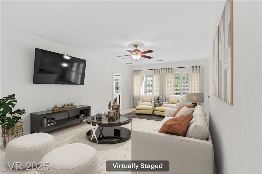 Beautiful single story home on oversized private corner lot in the highly desired 55+ guard gated community of Solera at Stallion Mountain. Features include a new whole house water softener system, evap cooling system, custom interior plantation shutters on windows & slider, custom exterior solar screens/shades, new interior & exterior paint, automatic sprinklers, landscape lighting and more! Large backyard with beautiful mountain views, and only one adjacent neighbor! Community amenities include a clubhouse, pool/spa, fitness center and tennis courts! Just minutes from shopping, dining, parks and the Las Vegas Strip!