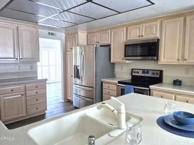Amazing opportunity to purchase this highly desirable Valencia model which offers generous living space and an open-concept, single-level layout in the heart of Leisure Village 55+. Tucked away on a quiet cul-de-sac, this end unit provides both privacy and easy access to the community's main walkways and amenities.The home features two large bedrooms and two bathrooms, along with a separate living room and dining room, creating comfortable spaces for everyday living and entertaining. The oversized eat-in kitchen is a standout, offering abundant cabinetry, ample counter space, and room for a breakfast table--perfect for casual meals or morning coffee.Recent improvements include smooth ceilings, fresh interior paint, and newer luxury vinyl plank flooring, with soft carpet in the bedrooms for added comfort. Vaulted ceilings and plentiful natural light enhance the open, airy feel throughout the main living areas.Additional highlights include a separate laundry room, an attached two-car garage with direct access, an updated HVAC system, and a new water heater installed in 2025. The refrigerator, washer, and dryer are included for added convenience.Leisure Village HOA fees include 24-hour guard-gated security, water, sewer, trash, cable TV, and internet, along with exterior maintenance, roof coverage, landscaping, and common area upkeep. Residents enjoy resort-style amenities including a pool and spa, fitness center, golf course, tennis and pickleball courts, bocce ball, clubhouse, walking paths, and a wide variety of clubs and social activities.Enjoy easy, low-maintenance living in one of Ventura County's most sought-after senior communities. This is the one you've been waiting for. Welcome Home!
