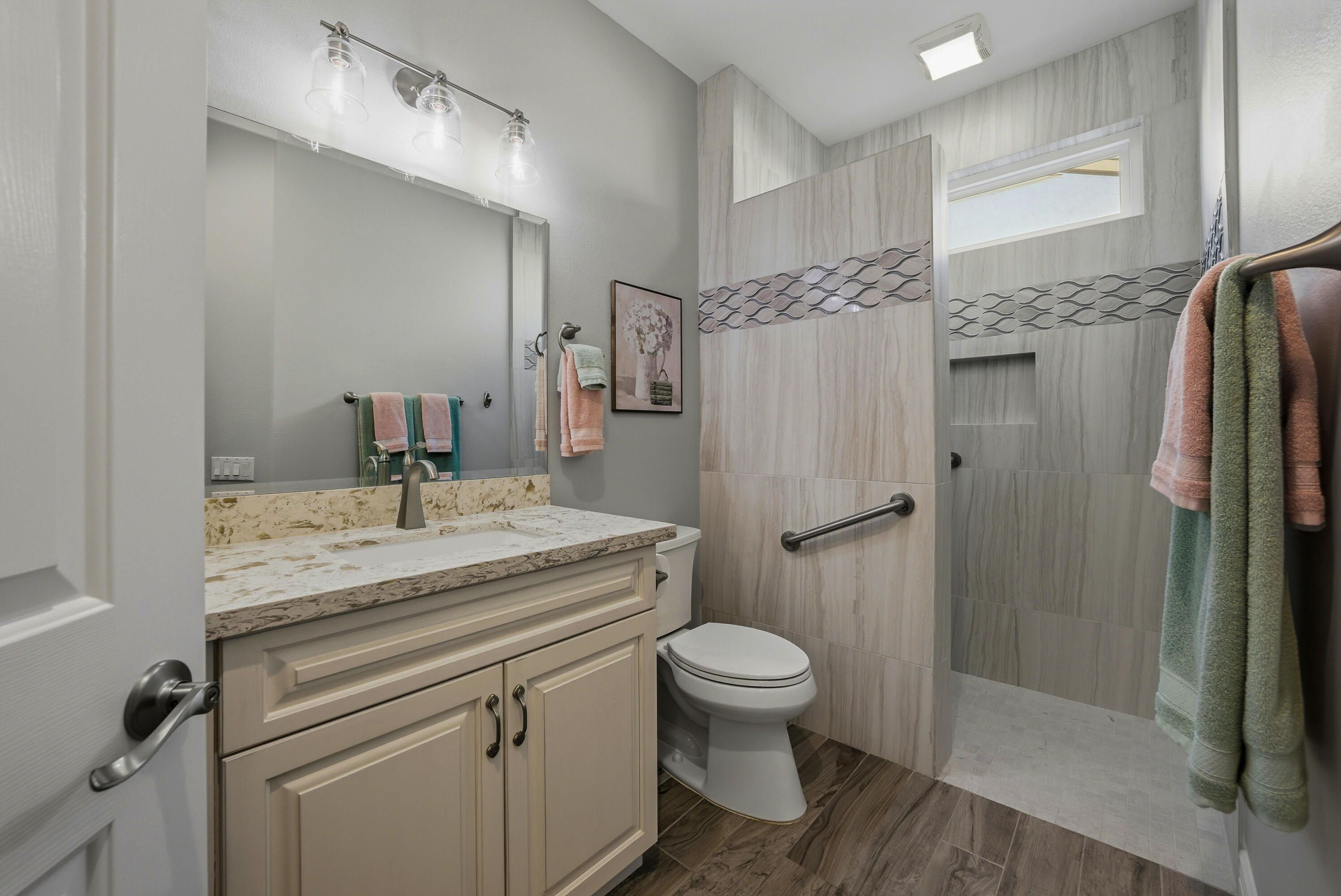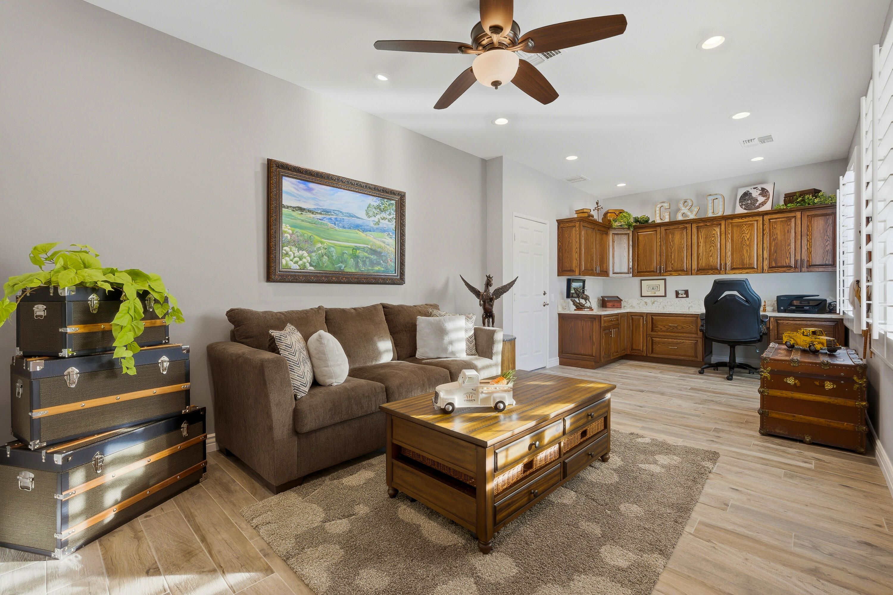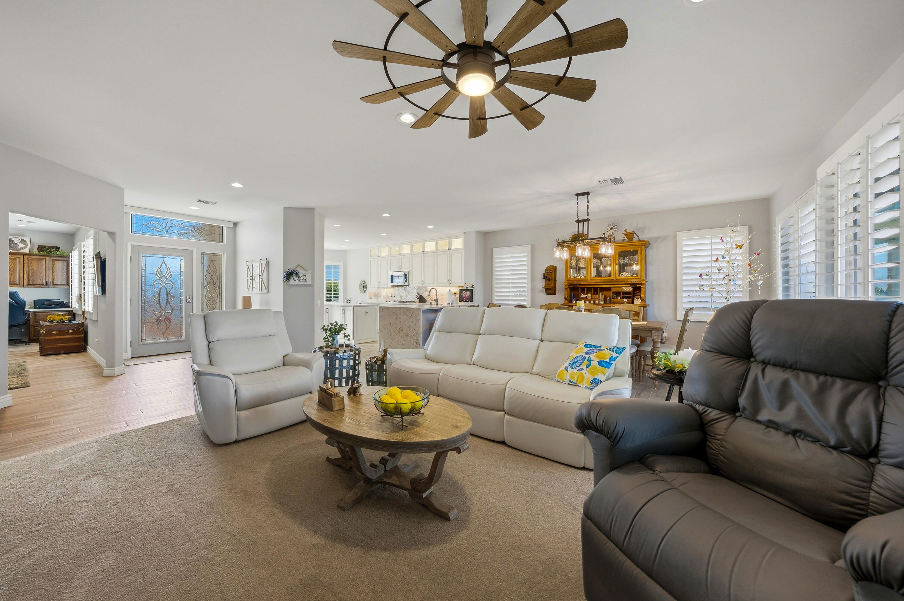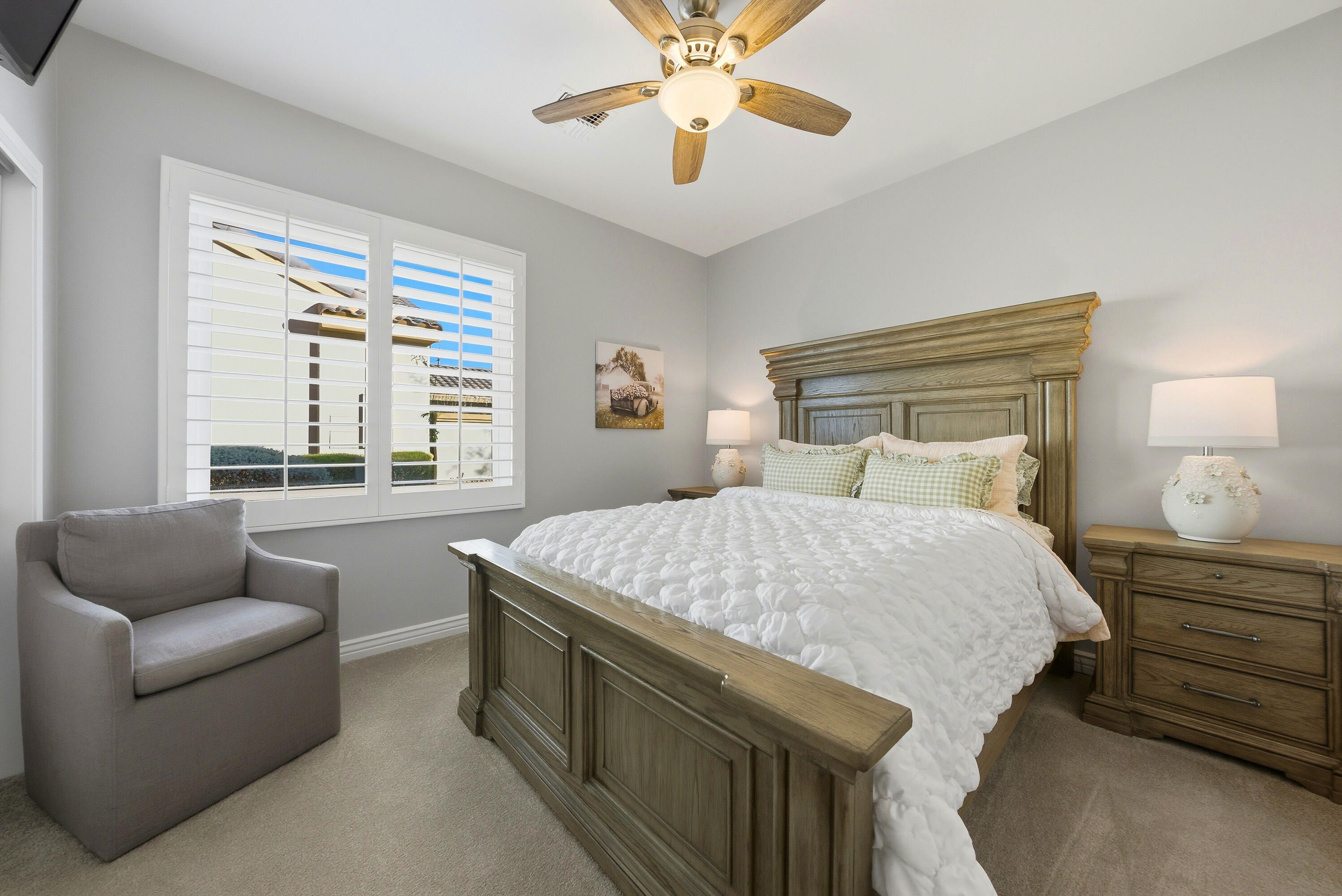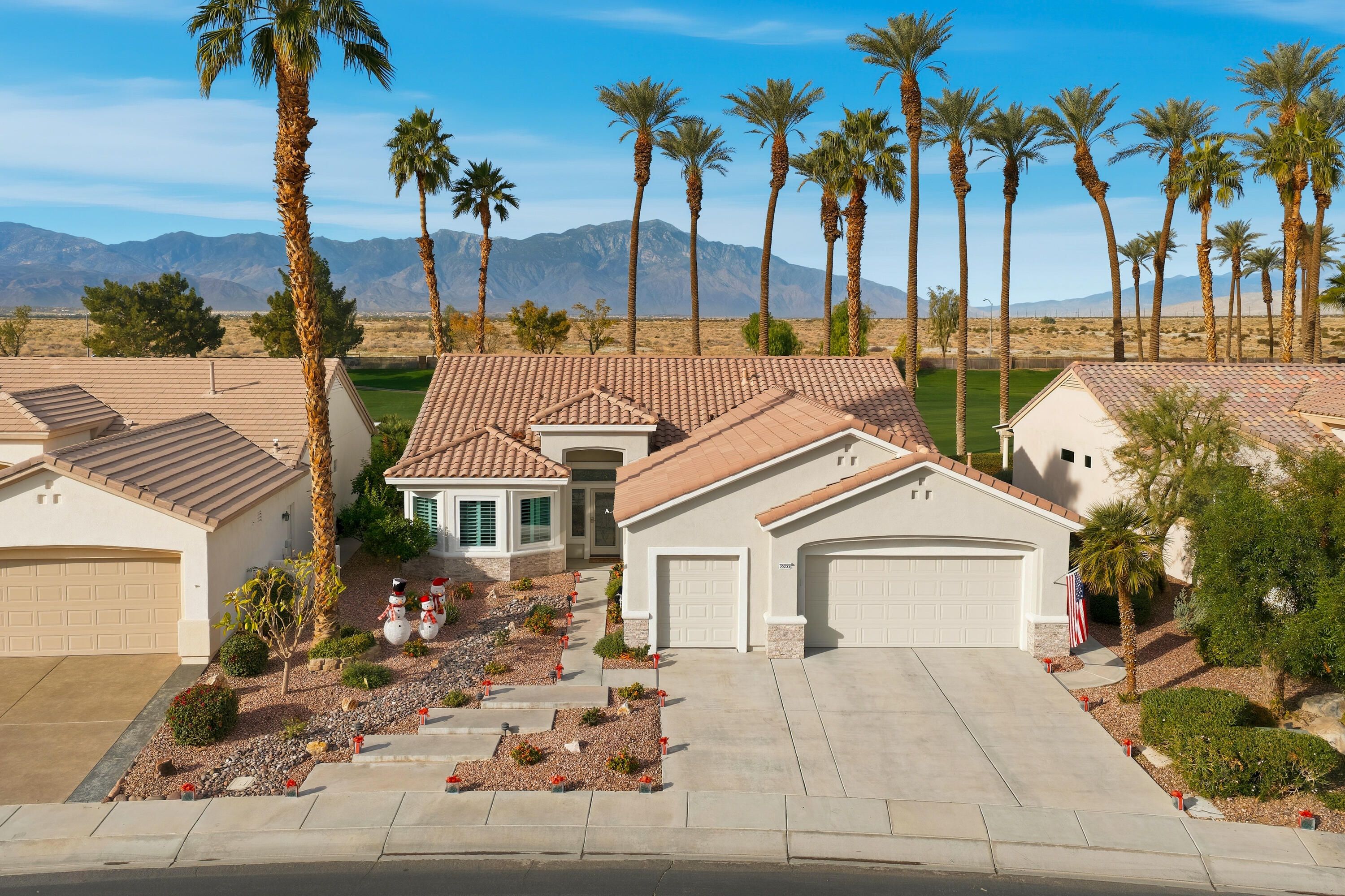 55+ Sun City Palm Desert--The 'best value'' for an active retirement community in the entire Coachella Valley. This is the most popular St. Croix model with 2 beds/2 full baths w walk-in showers, plus a DEN/HOBBY/FLEX room and an air conditioned golf cart garage. Spectacular golf course, sunset & mountain views!!! GREAT location. Stunning curb appeal features stacked stone wainscoting and desert landscaping with updated irrigation system and landscape lighting. ALL NEW EXTERIOR PAINT AND WINDOWS. NEW AC. NEW HVAC SYSTEM. COMPLETE REMODEL INCLUDES: ALL NEW CUSTOM CABINETS THROUGHOUT. CUSTOM PLANK FLOORS. NEW PLANTATION SHUTTERS throughout. Kitchen features ALL NEW KITCHEN TOP OF LINE STAINLESS APPLIANCES. The living room features a Cinematic Experience professionally installed and integrated with top of line amplifiers and sound system. The Primary bedroom is spacious, has a designer barn door concealing an EXTRA OVERSIZED WALK-IN CLOSET. Double vanity AND CUSTOM WALK IN SHOWER. Guest bedroom has fan/light,. Guest bath in hallway offers a CUSTOM WALK IN SHOWER. The famous DEN/HOBBY room is perfect for a TV room, office, workout room, and an extra guest space WHICH OFFERS A BUILT IN OFFICE. The laundry room is inside, has cabinets and sink, washer and dryer are included AND TOP SHELF. Garage is extended has TESLA CAR CHARGER, extra fridge and AC. Perfect for relaxing and/or entertaining with family and friends for the holidays! ''Buy Where you Love to Play...Sun City Palm Desert!'' ONE OF A KIND. PERFECTION.