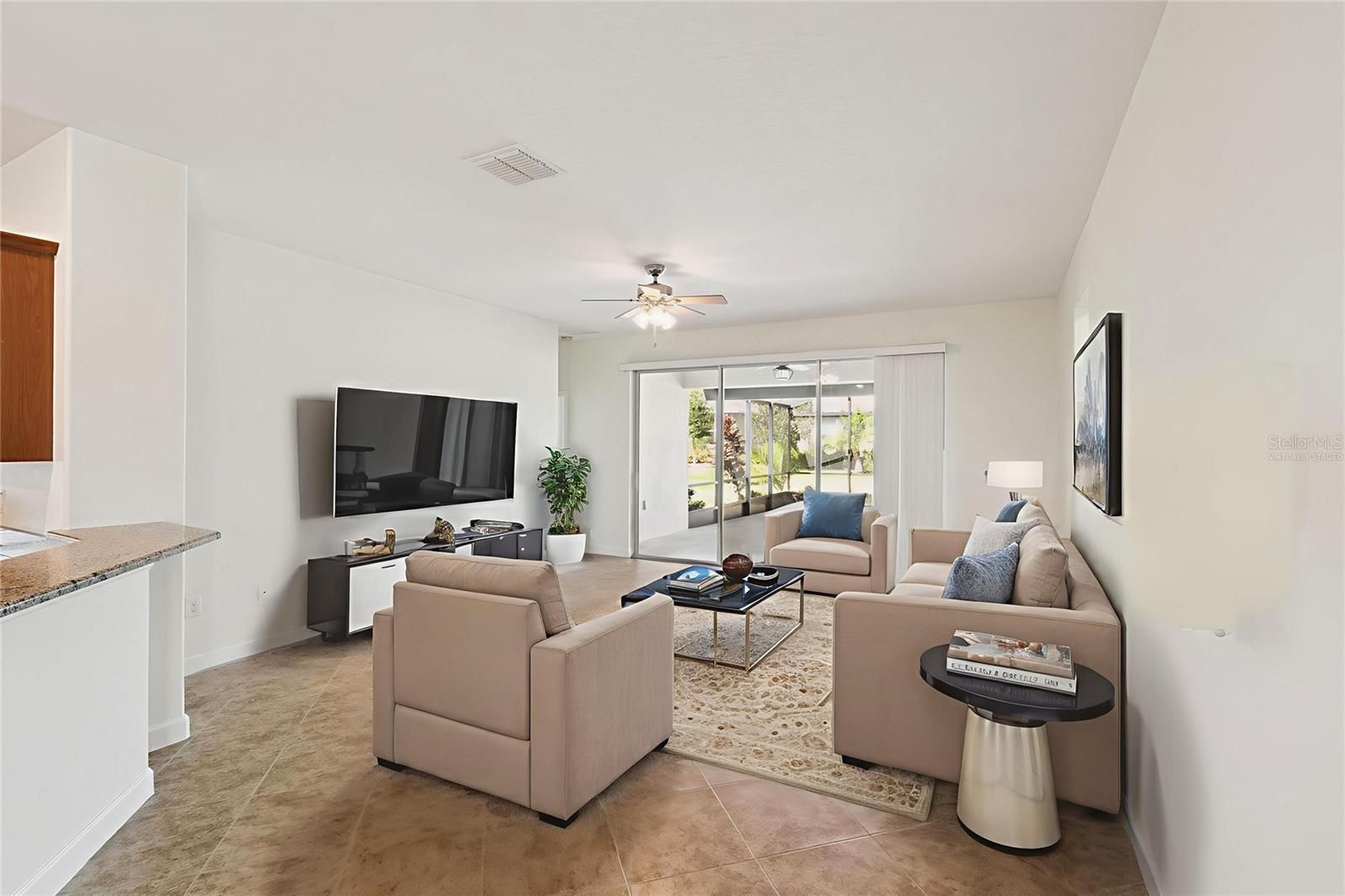 - Ceiling Fan(s), Eat-in Kitchen, Open Floorplan, Main Level Primary, Solid Surface Counters, Split Bedrooms, Stone Counters, Walk-In Closet(s), Window Treatments