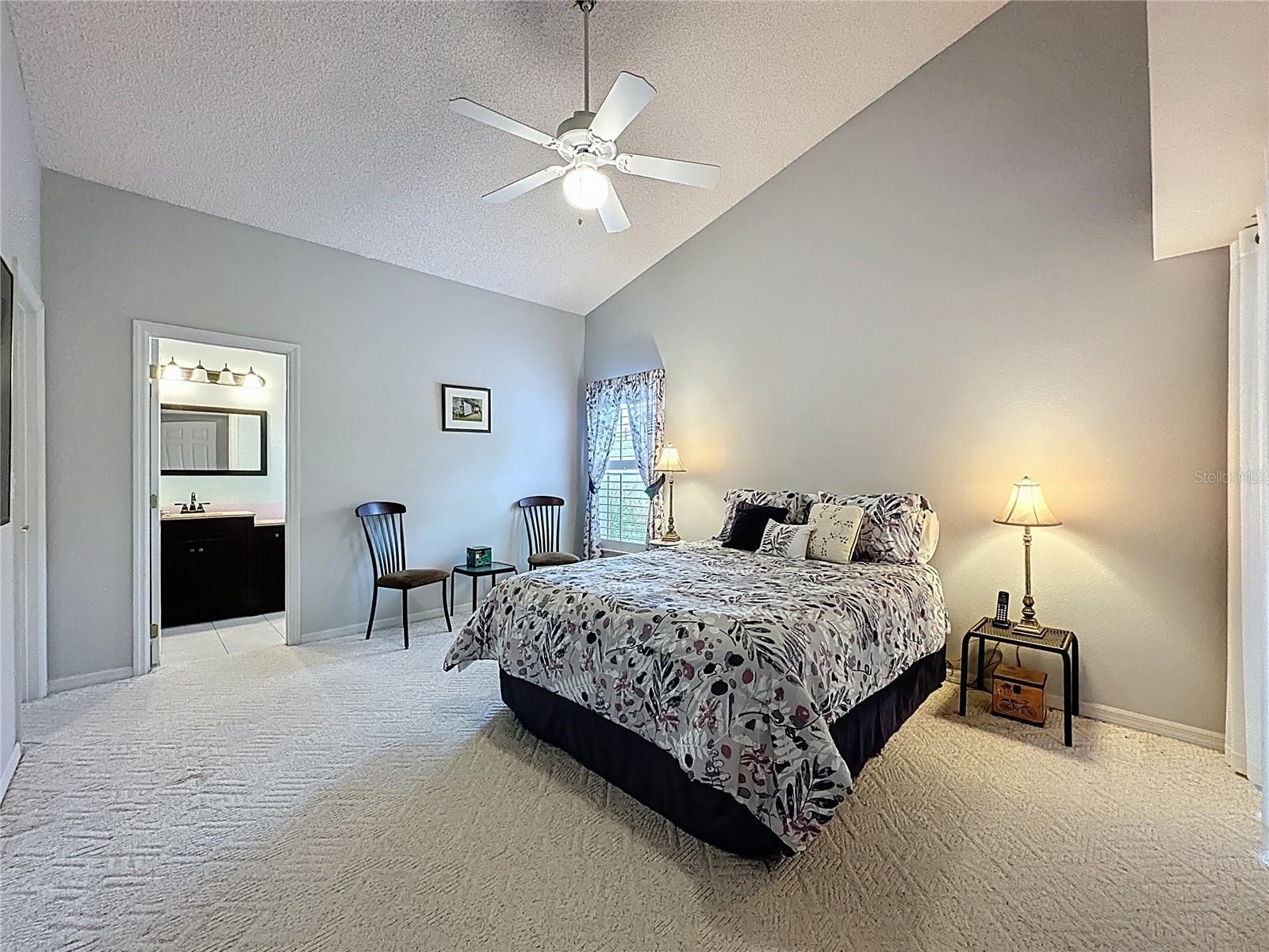 - Cathedral Ceiling(s), Ceiling Fan(s), Eat-in Kitchen, High Ceilings, Kitchen/Family Room Combo, Living/Dining Room, Open Floorplan, Main Level Primary, Split Bedrooms, Walk-In Closet(s), Window Treatments