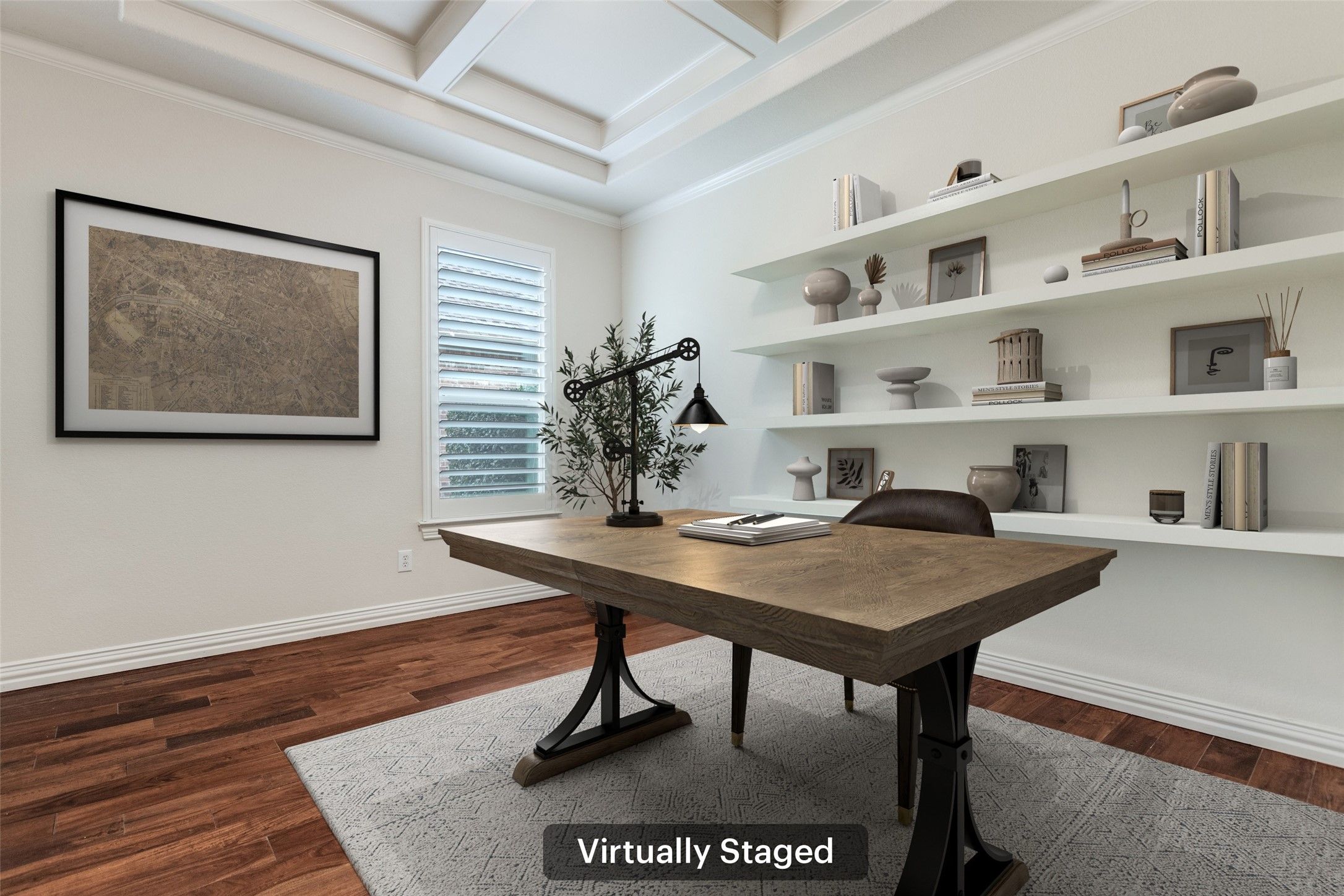Welcome to your dream home in prestigious Del Webb community, where golf course living meets thoughtful design. This stunning two-bedroom, two-bathroom residence sits on the fourth fairway, offering breathtaking views that will make your morning coffee taste even better. Step inside to discover plantation shutters and beautiful wood flooring throughout, creating an atmosphere of timeless elegance. The living room centers around a striking rock fireplace and is open to the kitchen and dining area. The kitchen features granite countertops, a convenient breakfast bar, and a gas cooktop with electric vent. The Bosch dishwasher, included refrigerator, plus organized cabinets and pantry with drawer systems make functionality a breeze. The primary bedroom suite includes dual sinks, a separate tub and shower, and a custom closet with and organizing system of drawers and shelves. The guest bedroom cleverly incorporates a Murphy bed with built-in shelving and drawers plus custom organizing shelves in closet. Additional highlights include a study with coffered ceiling and built-in shelves, a utility room with custom cabinetry, and foam insulation for energy efficiency added in 2024. Floored storage space above garage with aluminum attic access ladder and new roof in 2017. Outside, relax or entertain on the stone patio, or unwind in the screened porch while enjoying those spectacular golf course views. This home combines comfort, style, and location in one irresistible package.
