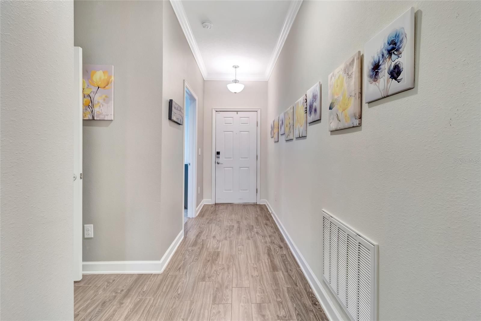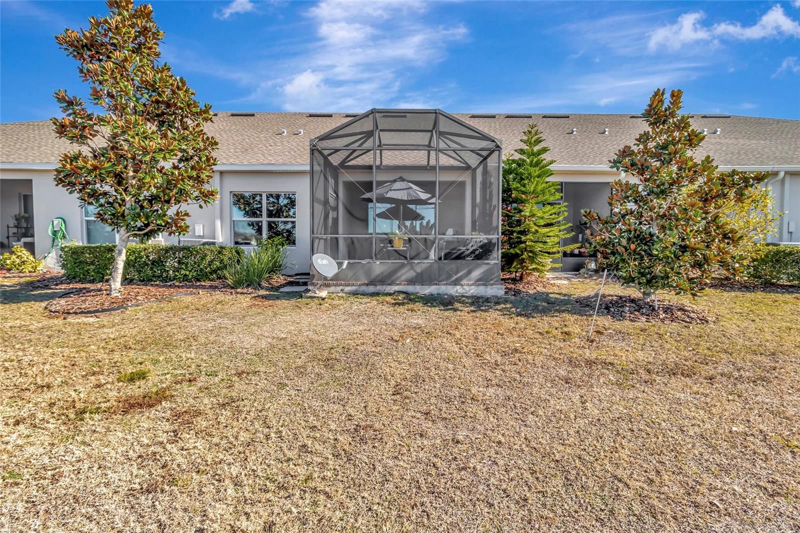 Welcome home to this beautifully maintained TURN KEY 2-bedroom, 2-bath residence located in the gated 55+ Heritage Hills community in Clermont. Built in 2018, this home offers a modern open-concept layout enhanced by upgraded tile flooring, crown molding throughout, and an extended screened-in patio perfect for relaxing or entertaining. The inviting entryway opens into a bright and spacious living area that seamlessly connects to the kitchen. The kitchen is well-appointed with stainless steel appliances, recessed lighting, solid surface countertops, and abundant cabinetry for storage. Adjacent to the kitchen is a dedicated dining space highlighted by an elegant light fixture and ample room for hosting family and guests. Natural light fills the expansive living room through sliding glass doors that lead to the rear patio. Just off the living area, the primary suite provides a comfortable retreat with generous space and a private ensuite bathroom featuring a dual-sink vanity and a glass-enclosed walk-in shower. The secondary bedroom is equally spacious, offering excellent natural light and its own private bathroom with a tub/shower combination. The flex room is currently used as a dining area but can be used as office, den or study. A separate laundry room is conveniently located near the kitchen for added functionality. Outside, enjoy a large stone patio that transitions into a fully screened porch with a screened ceiling, overlooking a serene dry retention pond. The driveway pavers and patio pavers were recently sealed and sanded. Plus a new microwave! The Heritage Hills community, offers resort-style amenities including a clubhouse, fitness center, community pool, hot tub, sauna, basketball and pickleball courts, shuffleboard, and more. The community features 24-hour guard-gated security, and the HOA covers exterior and grounds maintenance for a truly low-maintenance lifestyle.
