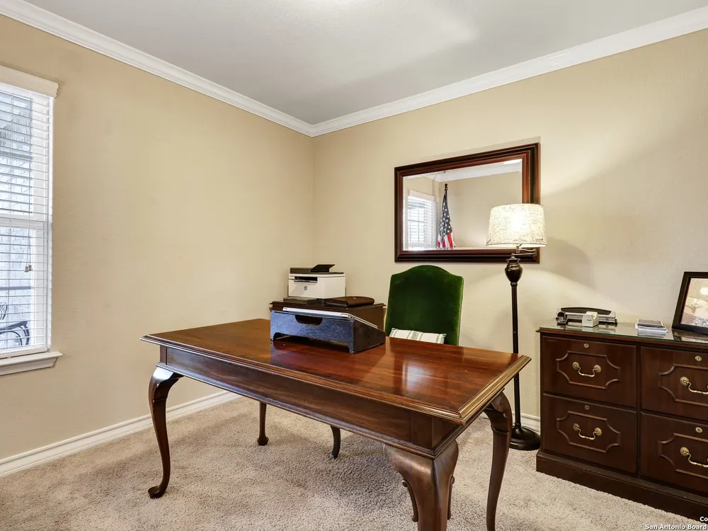 A rare find in this Taft Street plan with one of the largest flex rooms built making it 2 living areas along with a private study and split bedrooms with owner's retreat separate from 2nd bedroom. More than enough room to spread out and if you enjoy entertaining, you have room to do it in this lovely home with a large kitchen and oversized island / breakfast bar area. Tray ceilings, crown molding throughout (even the laundry room and baths). All this PLUS an extended OVERSIZED GARAGE. Large deck and part of the back is on greenbelt. Beautiful crape myrtles planted along the property line for privacy and color. Water softener, sprinkler system, gutters are a few of the features. A real gem of a home in this beautiful Del Webb community that has a multitude of amenities, clubs, and activities; plus miles of nature walking trails throughout.