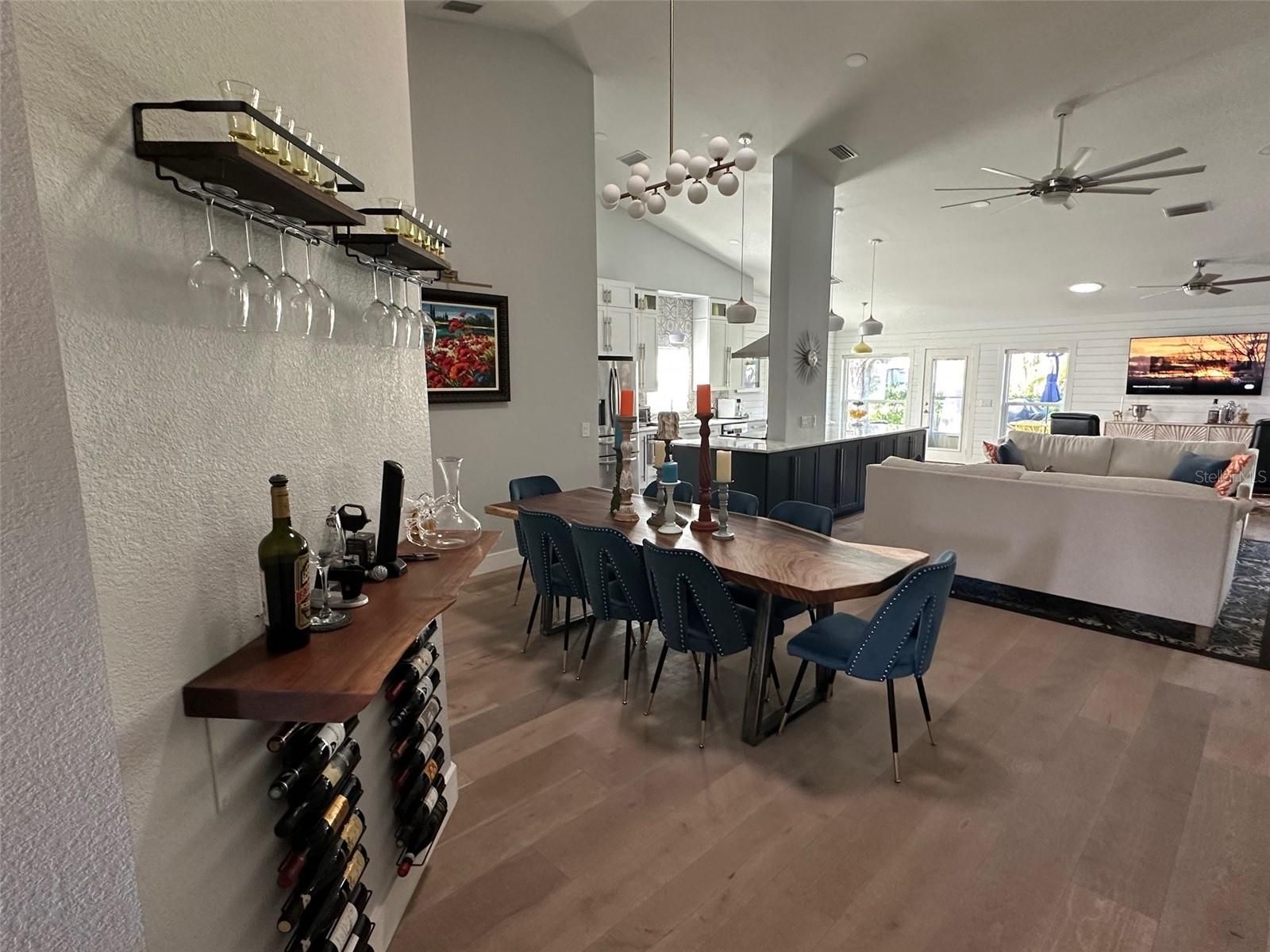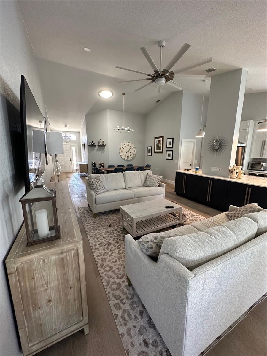- Ceiling Fan(s), Eat-in Kitchen, High Ceilings, Living/Dining Room, Open Floorplan, Main Level Primary, Split Bedrooms, Stone Counters, Thermostat, Vaulted Ceiling(s), Walk-In Closet(s), Window Treatments