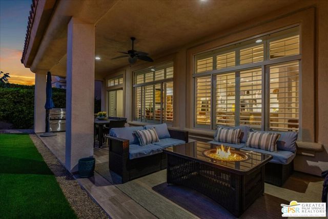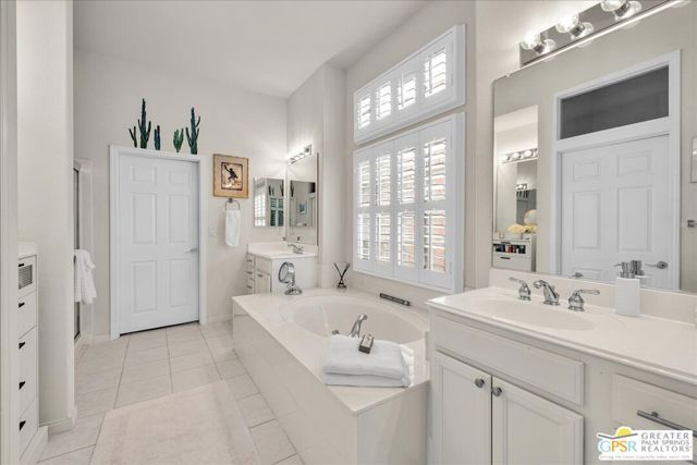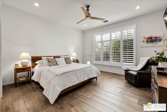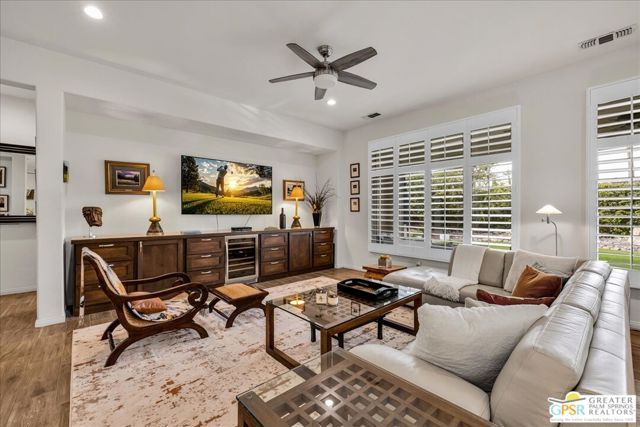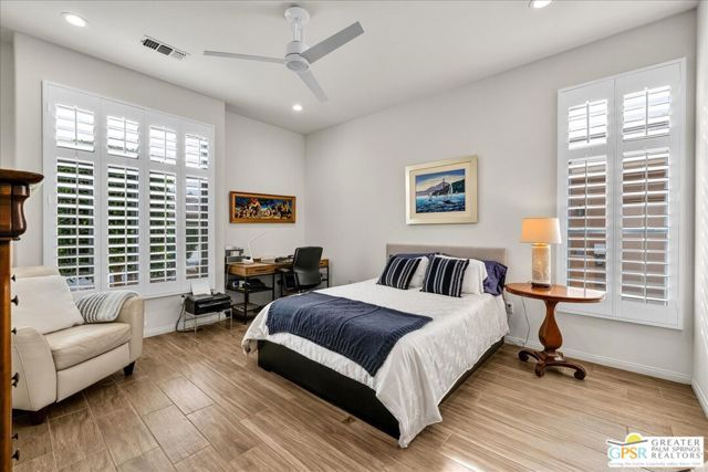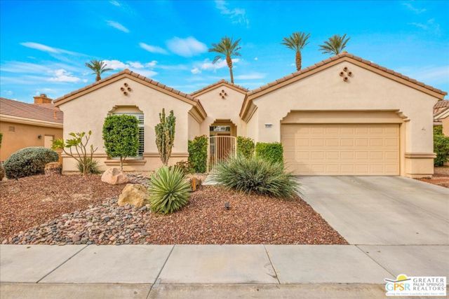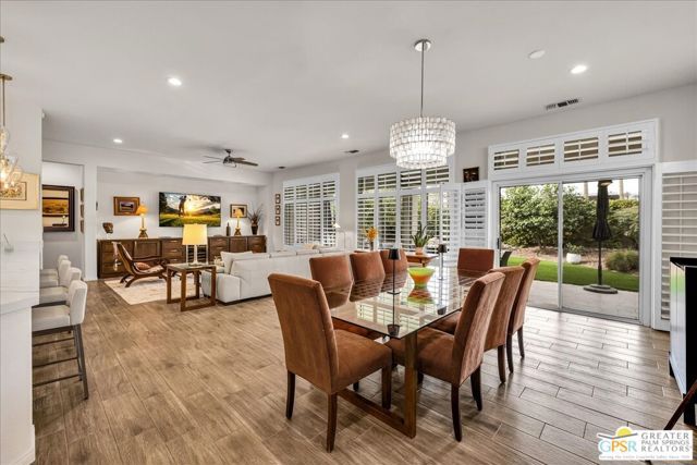 Stylishly Remodeled Home with Designer Kitchen & Private Outdoor Retreat! Beautifully updated and thoughtfully designed, this 2-bedroom + den/office, 2.5-bath home offers comfort, elegance, and exceptional functionality in the highly sought-after 55+ community of Sun City Palm Desert. From the moment you step inside, you're greeted by wood-look plank tile flooring, custom wood shutters, upgraded LED lighting, and quality ceiling fans that create a polished, cohesive aesthetic throughout. The true showpiece of the home is the fully remodeled, open-concept kitchen, designed with both everyday living and entertaining in mind. Highlights include: Expansive peninsula island with stainless sink, built-in water filtration, instant hot water, and generous seating, Additional prep island for added workspace, Two-tone cabinetry with pull-outs, lazy Susan, built-in mixer stand & abundant storage, Elegant quartz countertops, High-end stainless steel appliance suite, Hand-selected pendant lighting that adds a designer touch. The kitchen flows effortlessly into the dining and living areas, where natural light pours in and views extend to the private backyard and peekaboo mountain vistas. The primary suite is spacious and serene, featuring large windows, backyard views, and mature citrus trees just beyond. The ensuite bath offers dual vanities, a soaking tub, separate stall shower, and an impressive 17-foot-deep walk-in closet with exceptional storage. Privately situated at the front of the home, the guest wing provides ideal separation and flexibility. Here you'll find a den/office with French door entry, a convenient powder room, and a bright guest bedroom with its own full ensuite bath. Step outside to your personal desert retreat. The covered patio offers generous space for dining and entertaining, while the landscaped yard showcases citrus trees and a striking modern circular fountain, creating a peaceful and inviting outdoor setting. Additional features include: Oversized 27+ ft deep garage, Whole-home water softening system, Insulated garage door. All within Sun City Palm Desert, one of the desert's premier 55+ communities, offering two clubhouses, gold course, pools and spas, fitness centers, dining, social clubs, tennis, pickleball, and an active lifestyle calendar. Refined, remodeled, and ready to enjoy - this home delivers elevated desert living in every detail.