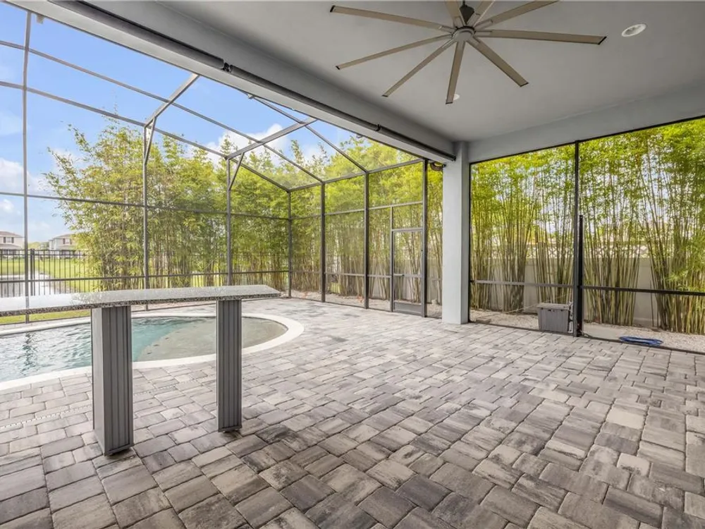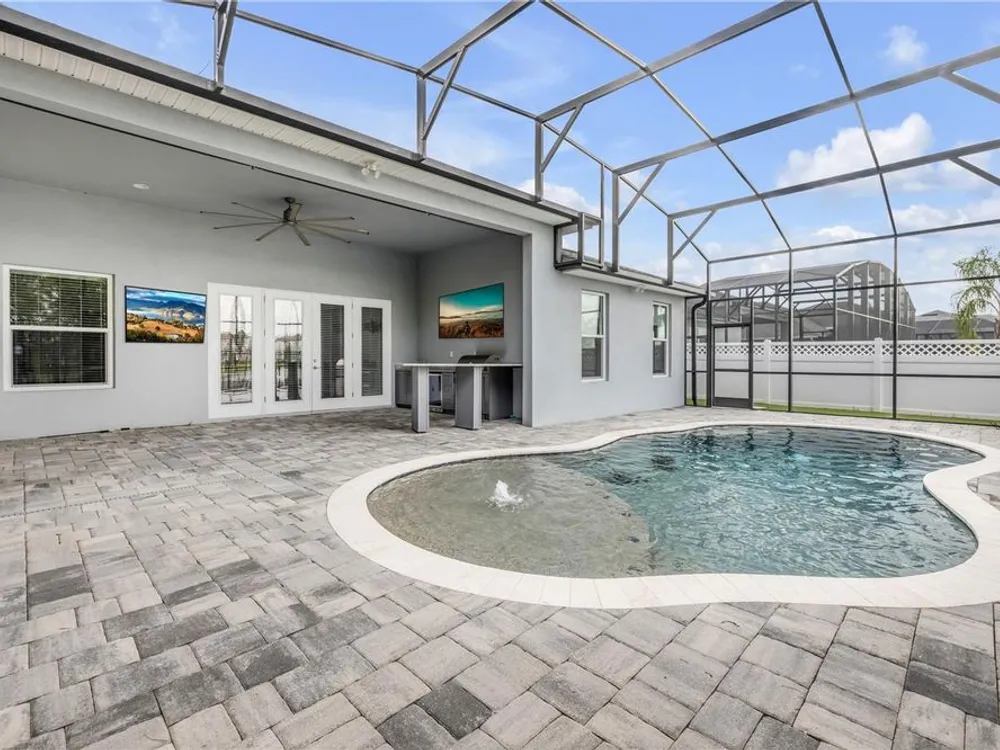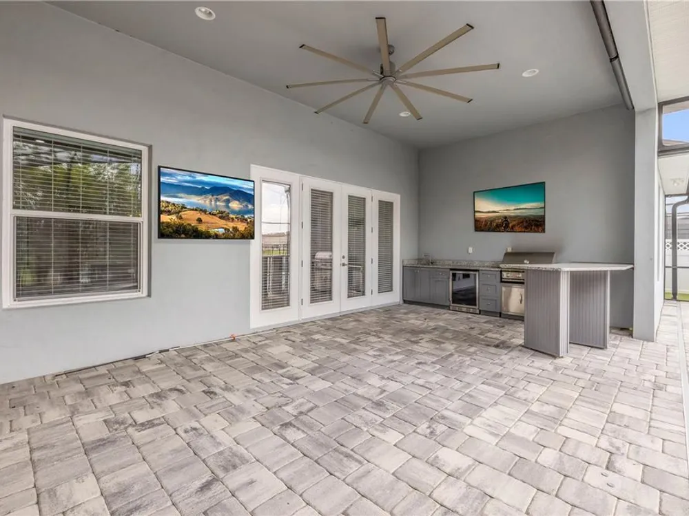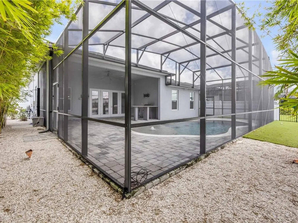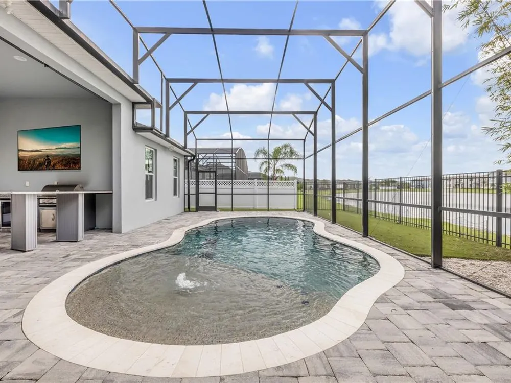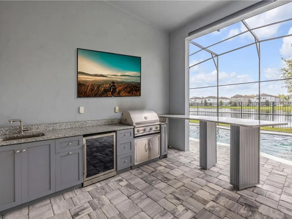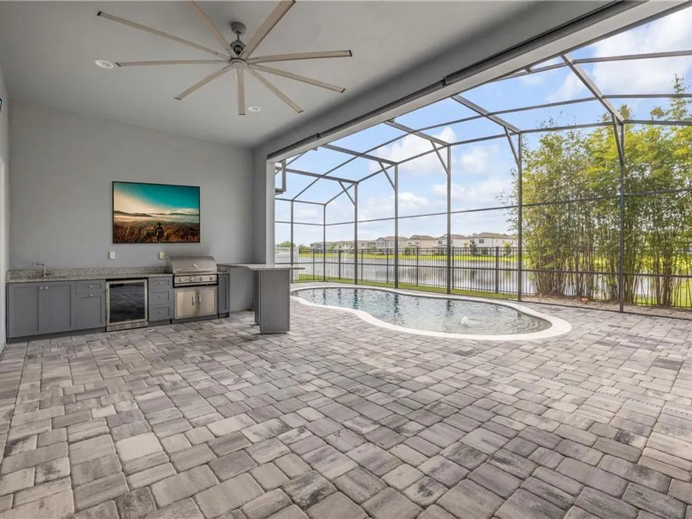 Discover a home that truly has it all. With a full three-car garage, beautiful landscape lighting, and tinted east-facing windows, the curb appeal is just the beginning. Step inside to find a built-in entertainment center with an oversized fireplace, crown molding in the main living space, and a kitchen with a stylish tile backsplash. The kitchen also boasts a corner pantry upgraded to a full chef's pantry with butcher block countertops, outlets, and under-counter lighting. The primary suite features a tray ceiling and a luxurious bathroom with dual shower heads, including an oversized rainfall shower, and a completely built-in walk-in closet. A bonus room can serve as a fourth bedroom or office. Outdoors, enjoy the show-stopping outdoor kitchen and living area under a 12-foot high covered lanai with drop-down sunshades. The space includes wraparound granite countertops, a built-in grill, and lush bamboo landscaping for privacy. The custom pool features a pebble finish, sun shelf, swim-up bar stools, saltwater system, and solar heating—all under a screened enclosure. The property also features a non-buildable common area next door for added privacy, and the backyard is designed for low maintenance with artificial turf and shell. Plus, a built-in transfer switch in the garage makes it easy to hook up a generator to power the whole house. Come see why 354 Venetian Palms Boulevard is the perfect blend of luxury and comfort!