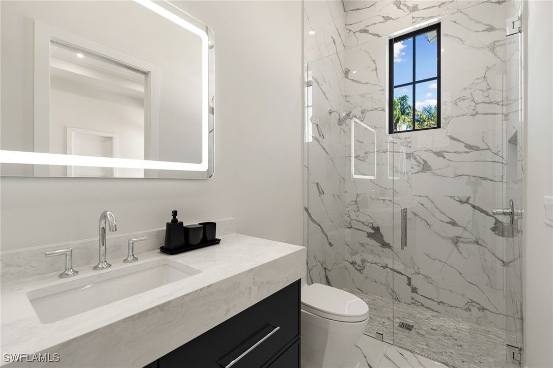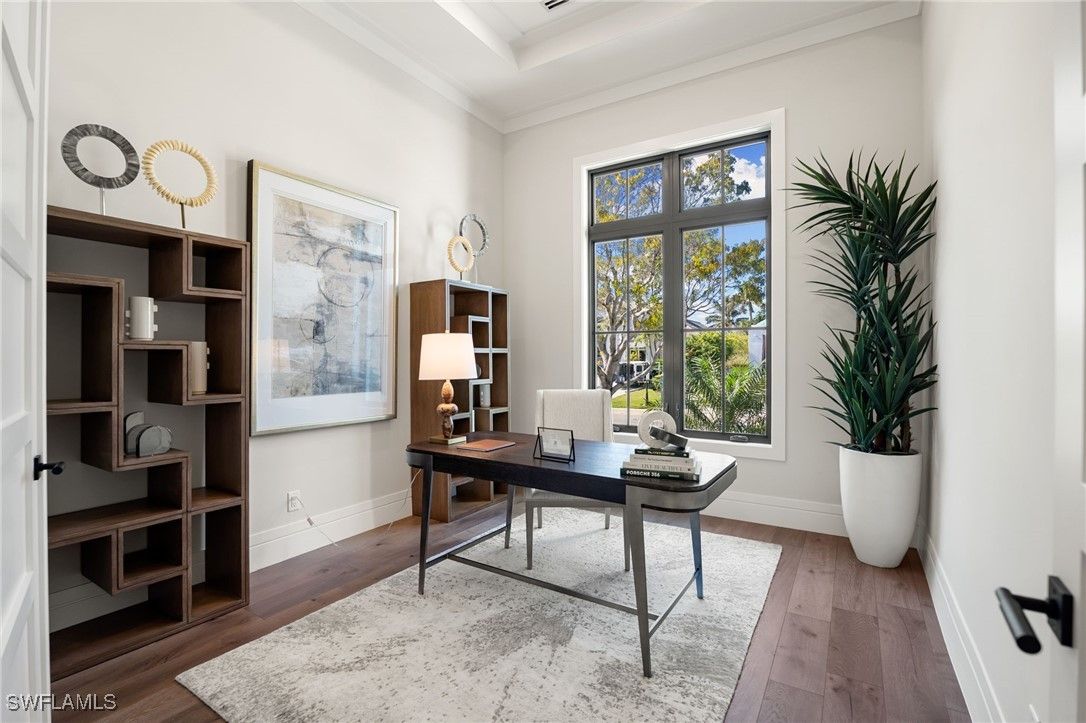 Contemporary coastal architecture with clean, modern lines is thoughtfully softened by transitional details in this stunning four-bedroom, four-and-a-half-bath Moorings residence. A striking entry through glass double doors reveals soaring ceilings, custom wood flooring, and a chic wet bar with wine storage—setting the tone for refined yet relaxed living. Built with quality and longevity in mind, the home features a full concrete, elevated structure, a galvanized steel tile roof, planned space for a whole-home generator, and high-end interior finishes throughout. The gourmet kitchen is a true showpiece, showcasing Sub-Zero refrigeration, Wolf cooking appliances, waterfall quartz countertops, and custom walnut cabinetry, all beautifully complemented by designer ceiling details. The thoughtfully designed floor plan allows for effortless entertaining, seamlessly blending indoor and outdoor living. Pocketing 8-foot sliders open to the expansive lanai with electric roll-down screens, a full summer kitchen, and a cozy outdoor fireplace—perfect for creating ambiance day or night. The owner’s retreat is a private sanctuary, offering a separate sitting area with direct lanai access, dual walk-in closets, and a spa-like bath. Family and guests will appreciate the upstairs living area, complete with a great room and wet bar, plus an oversized covered balcony ideal for gathering and relaxation. Ideally situated in the desirable north end of the Moorings, this exceptional home places you just a short golf cart ride from private Moorings beach access and the shopping and dining of Venetian Village—an ideal setting for your Naples lifestyle.