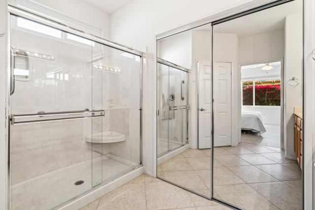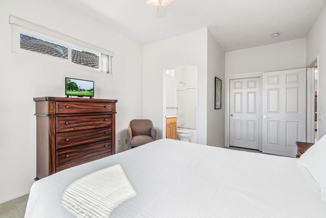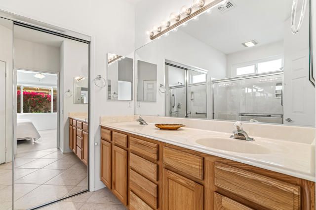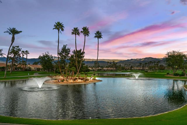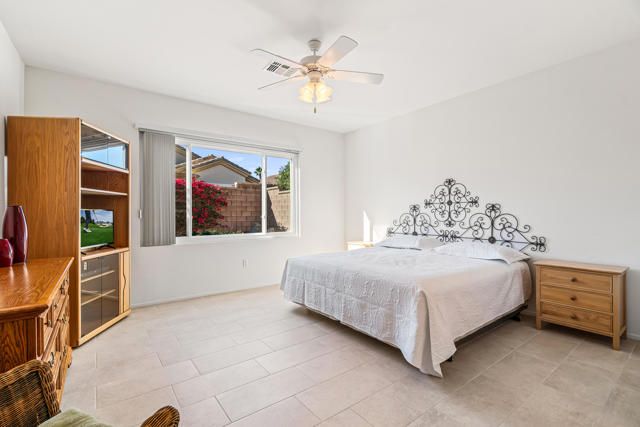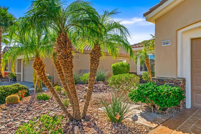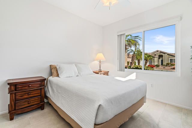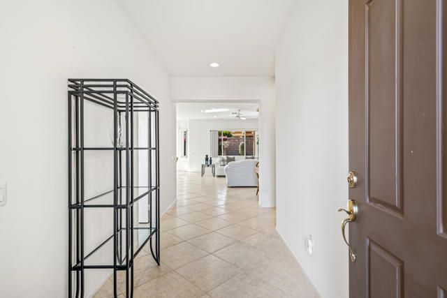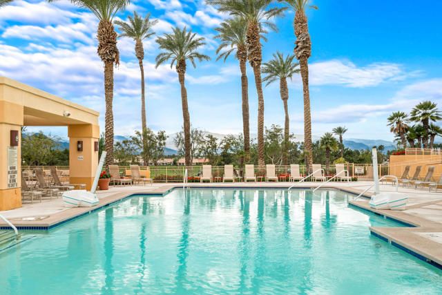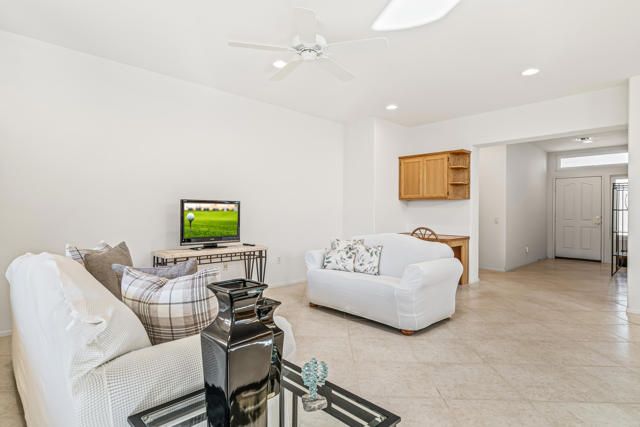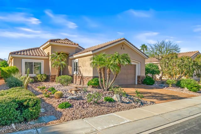This is the one you've been waiting for -- a rare and pristine 3 Bedroom, 3 Full Bath home, including two ensuite bedrooms, showcasing an expanded Cayman floor plan. Lightly lived in as a second home, this impeccably maintained residence combines comfort, style, and thoughtful upgrades throughout. A formal entry welcomes you into a bright, open layout with high ceilings, fresh interior paint, and stunning ceramic stone flooring--with no carpeting anywhere. The spacious living and dining spaces flow seamlessly for effortless entertaining, while the separate laundry room adds everyday convenience. The well-appointed kitchen features newer stainless-steel appliances, including a brand-new dishwasher, and excellent storage. The oversized garage offers additional flexibility for vehicles, golf carts, or extra belongings. Significant upgrades include replaced windows and sliders within the last six years, recessed lighting, an owned water-softening system, and custom-resurfaced concrete on the driveway, walkways, and backyard patio. The charming, beautifully landscaped rear yard provides a serene outdoor retreat ideal for morning coffee, afternoon relaxation, or starlit dining. Located in one of the desert's premier 55+ resort communities, residents enjoy resort-style living with access to three elegant clubhouses, sparkling pools and spas, a full fitness center, dining venues, and countless social activities. Outdoor enthusiasts will love the tennis courts, bocce ball, and two championship golf courses--all with low HOA fees that make this exceptional lifestyle even more appealing. Rare. Refined. Move-in ready. This home offers exceptional value, thoughtful upgrades, and an unbeatable desert lifestyle. Assessor's records indicate 1,632 sq. ft.; however, a licensed appraiser's measurement verifies the size at 1,692 sq. ft.